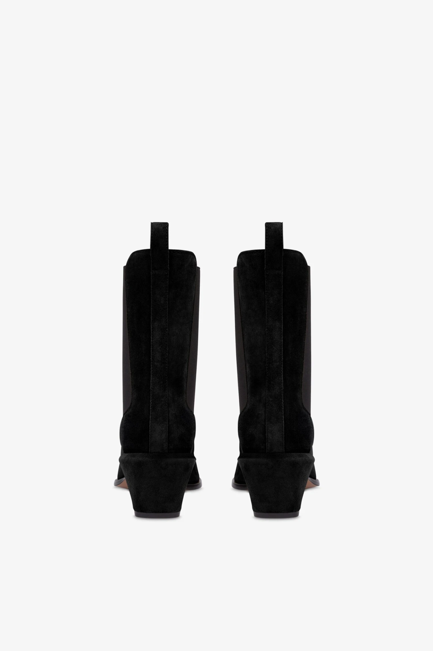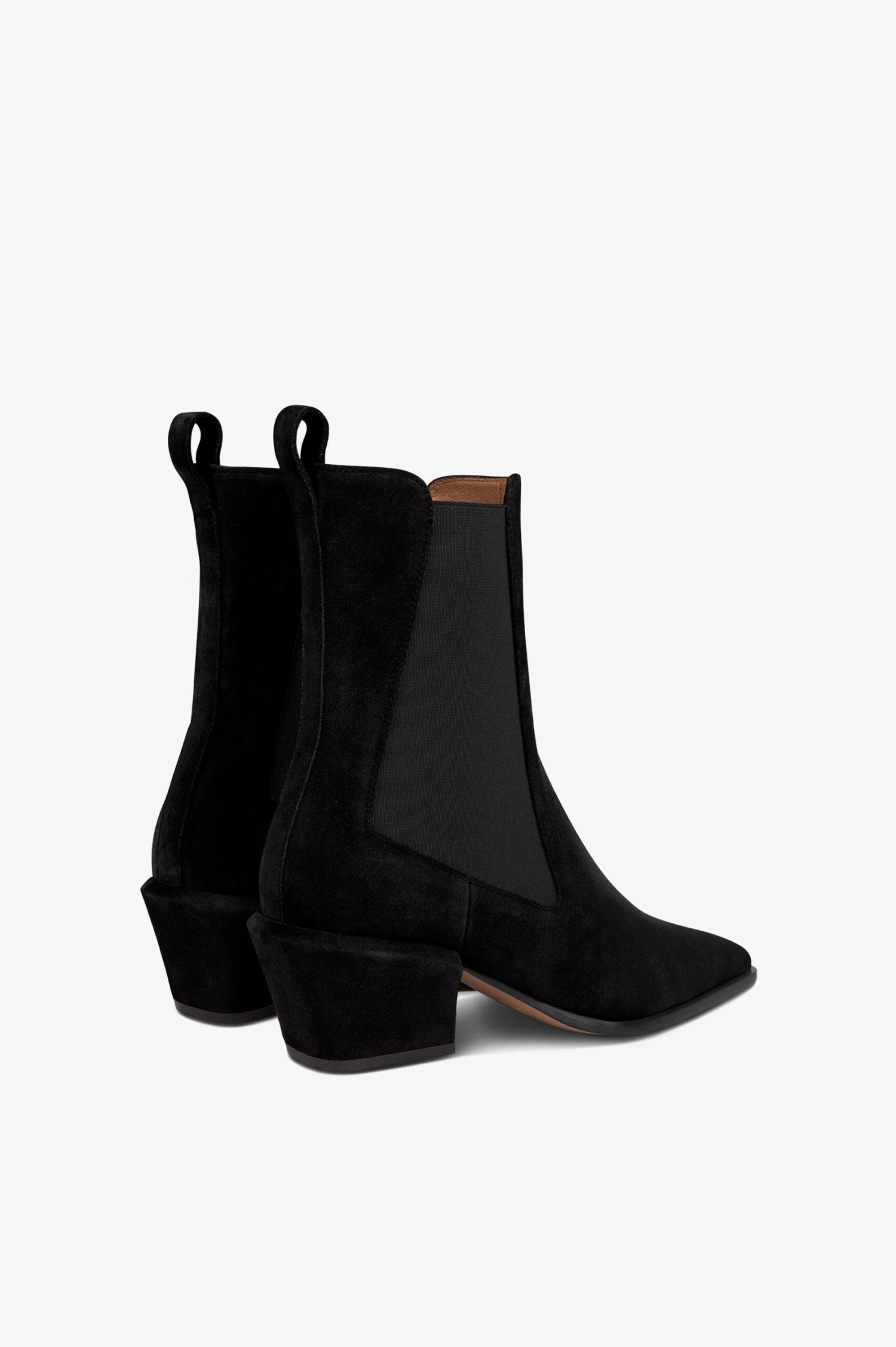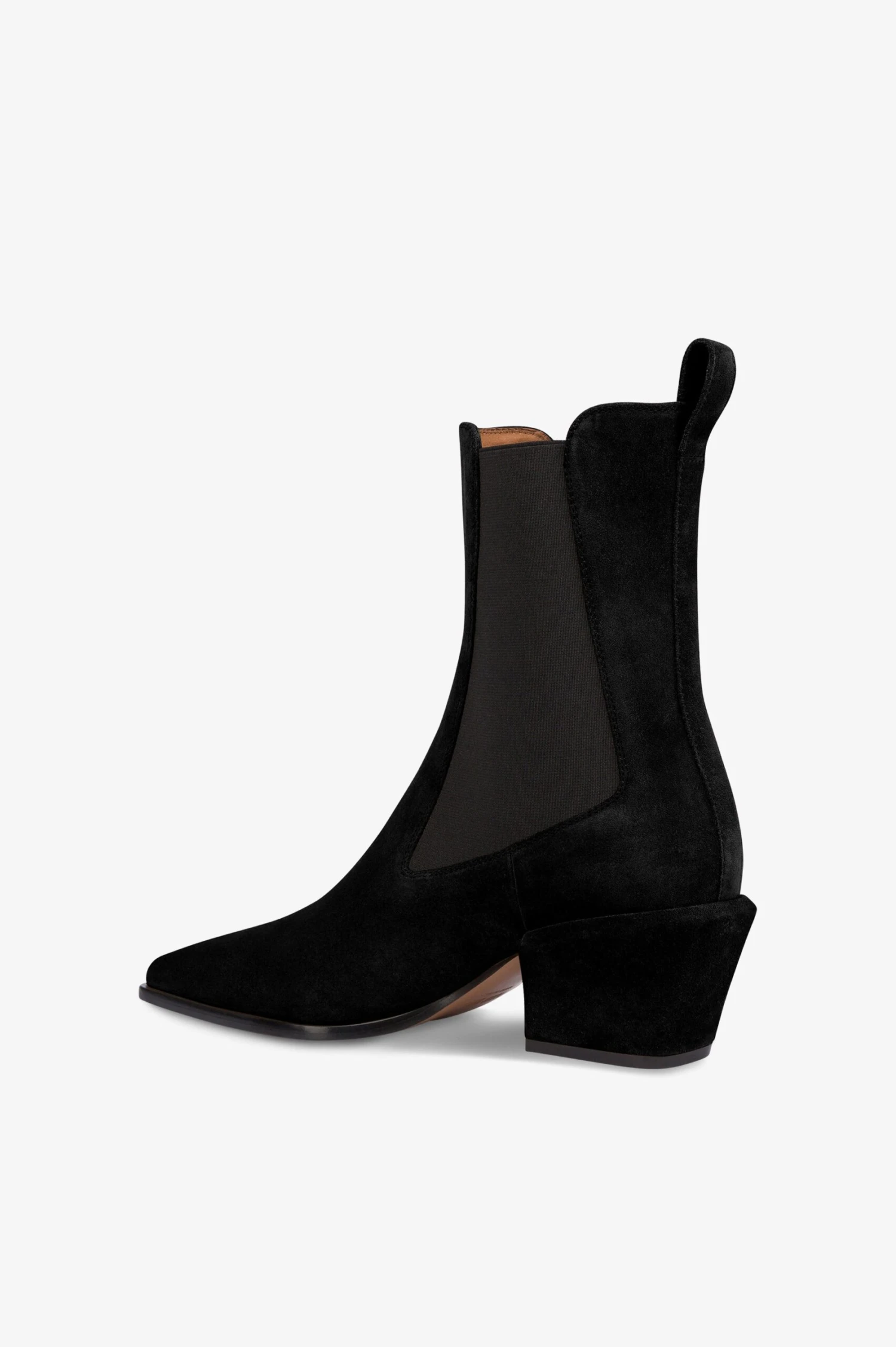 Ankle boots in black calf suede leather with an elasticated side panel. Covered chunky heel. Made in Italy.