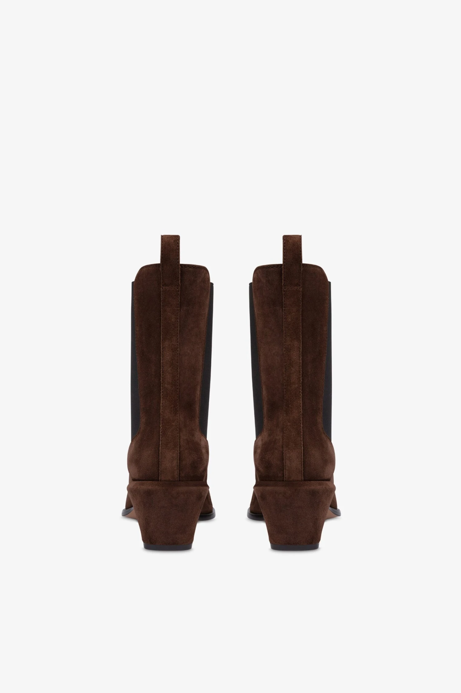 Ankle boots in chocolate calf suede leather with an elasticated side panel. Covered chunky heel. Made in Italy.