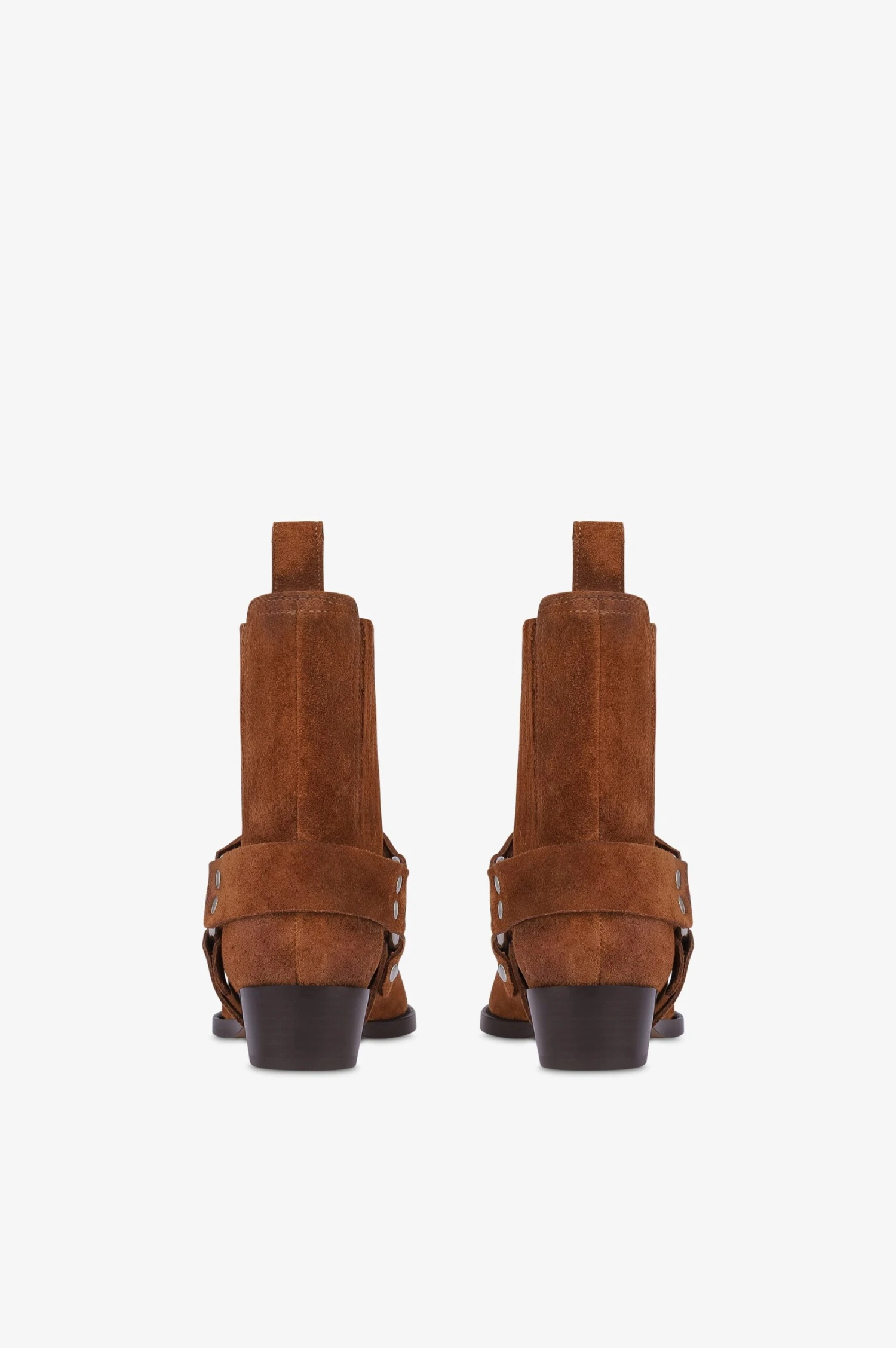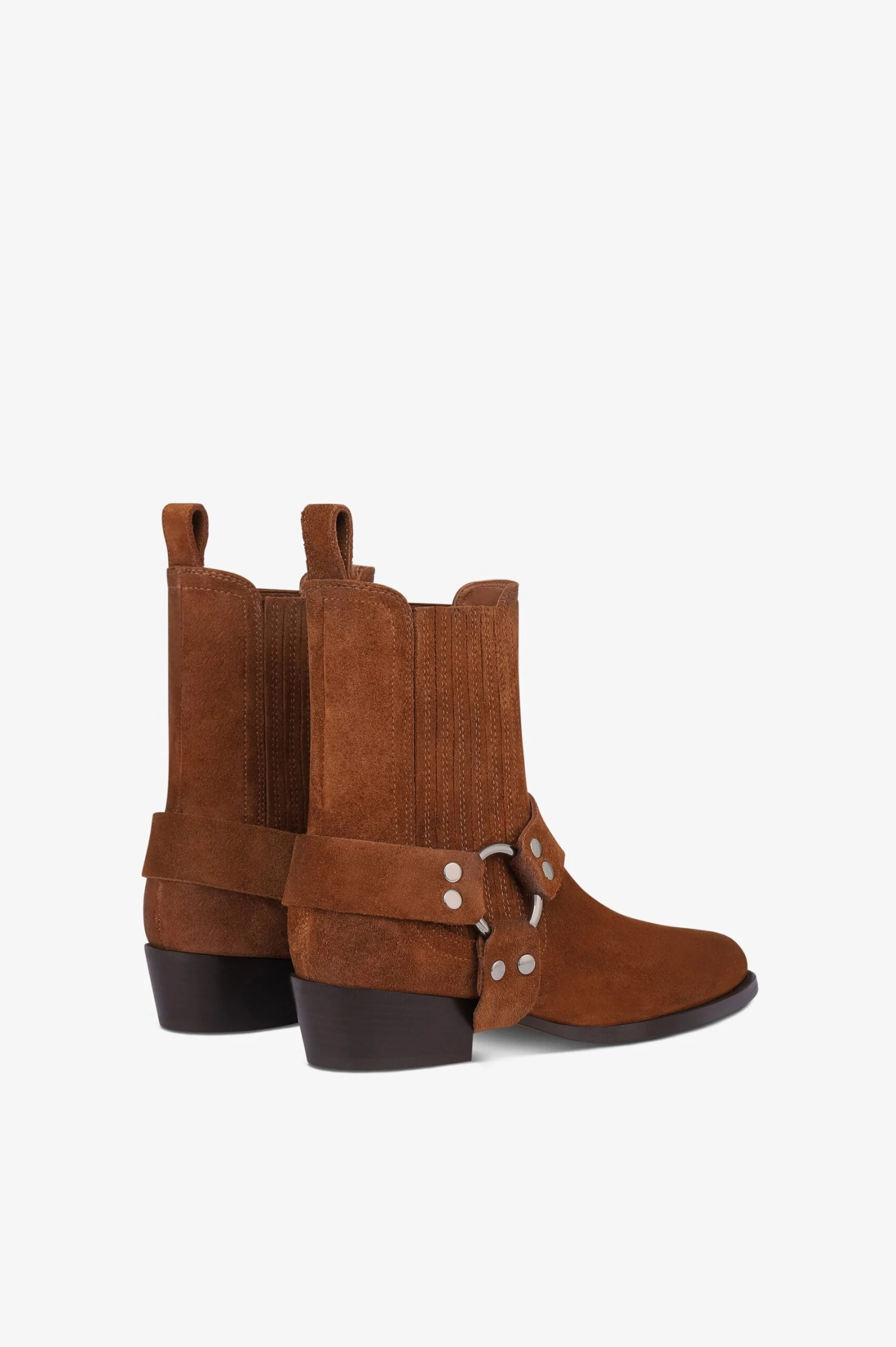 Ankle boots in cognac calf suede leather with a strap and metal ring detail. Made in Italy.