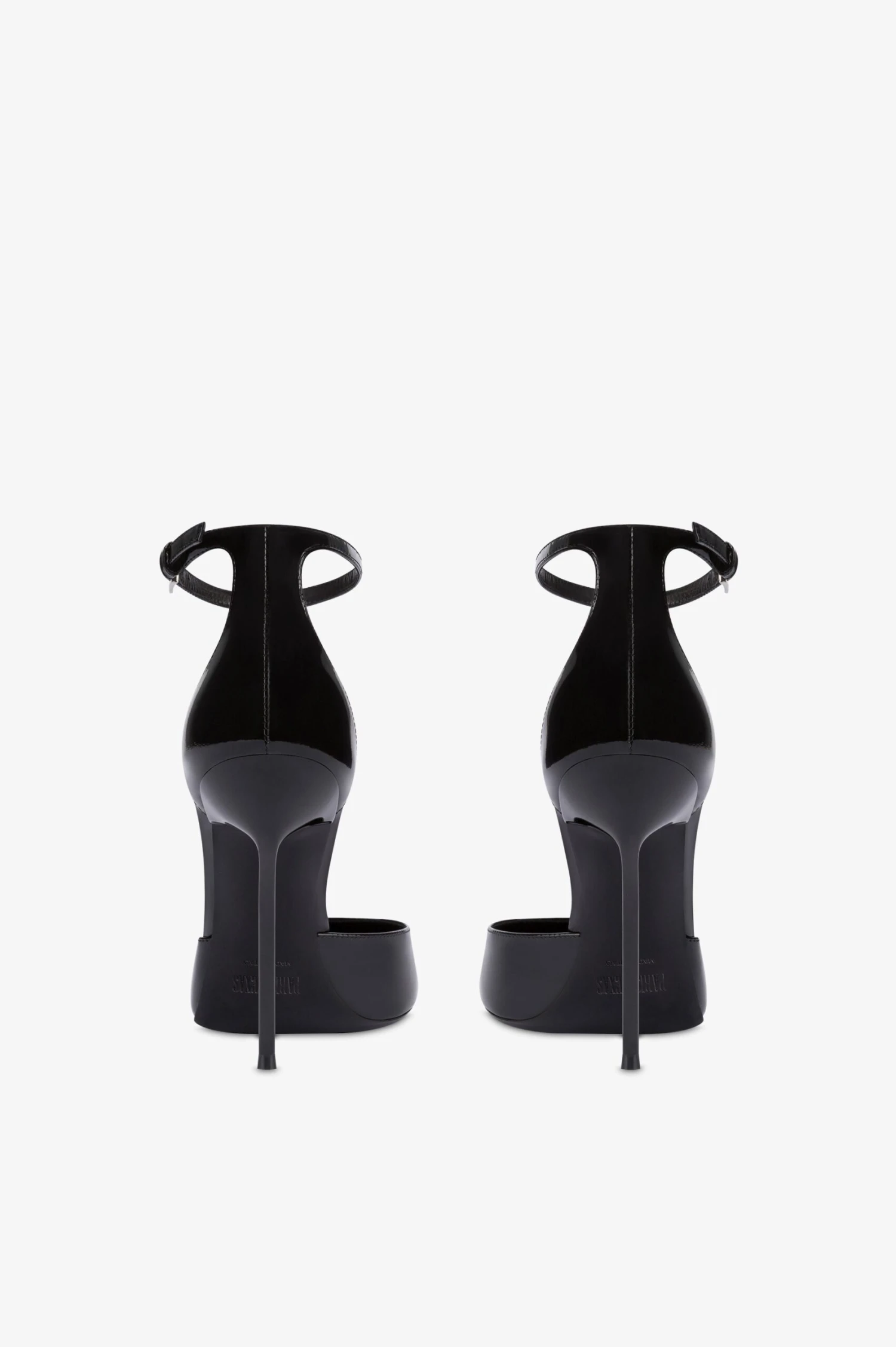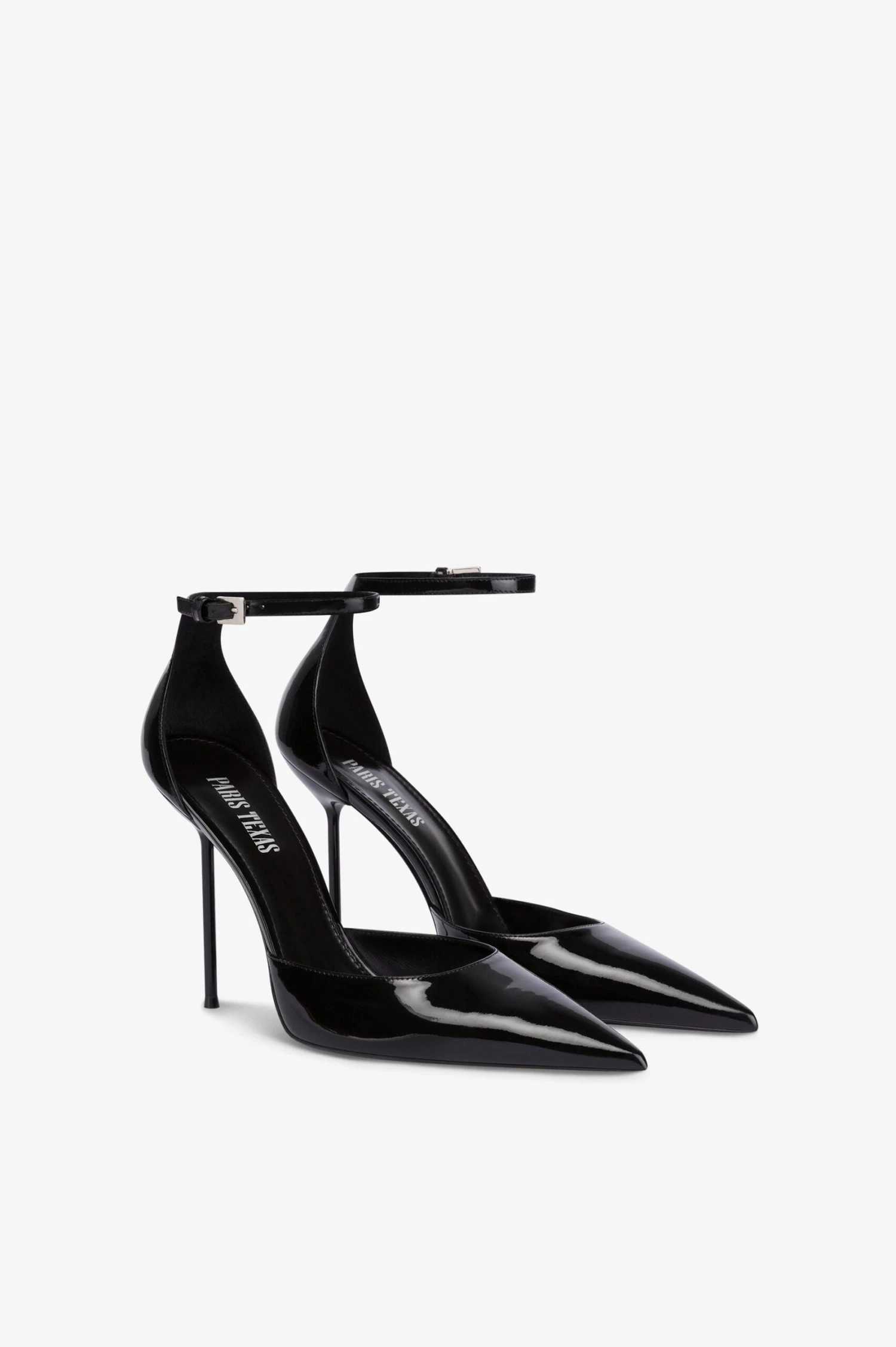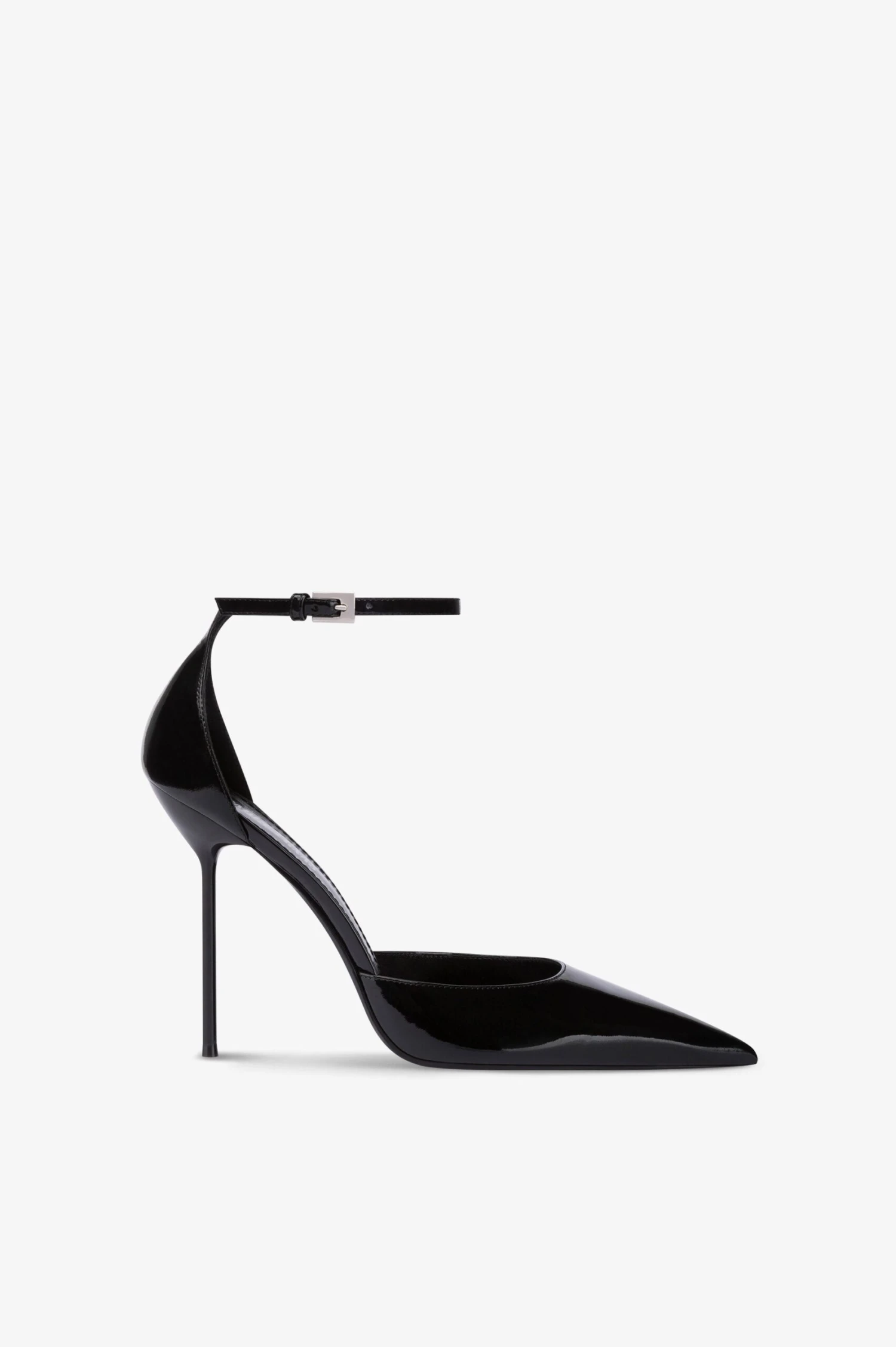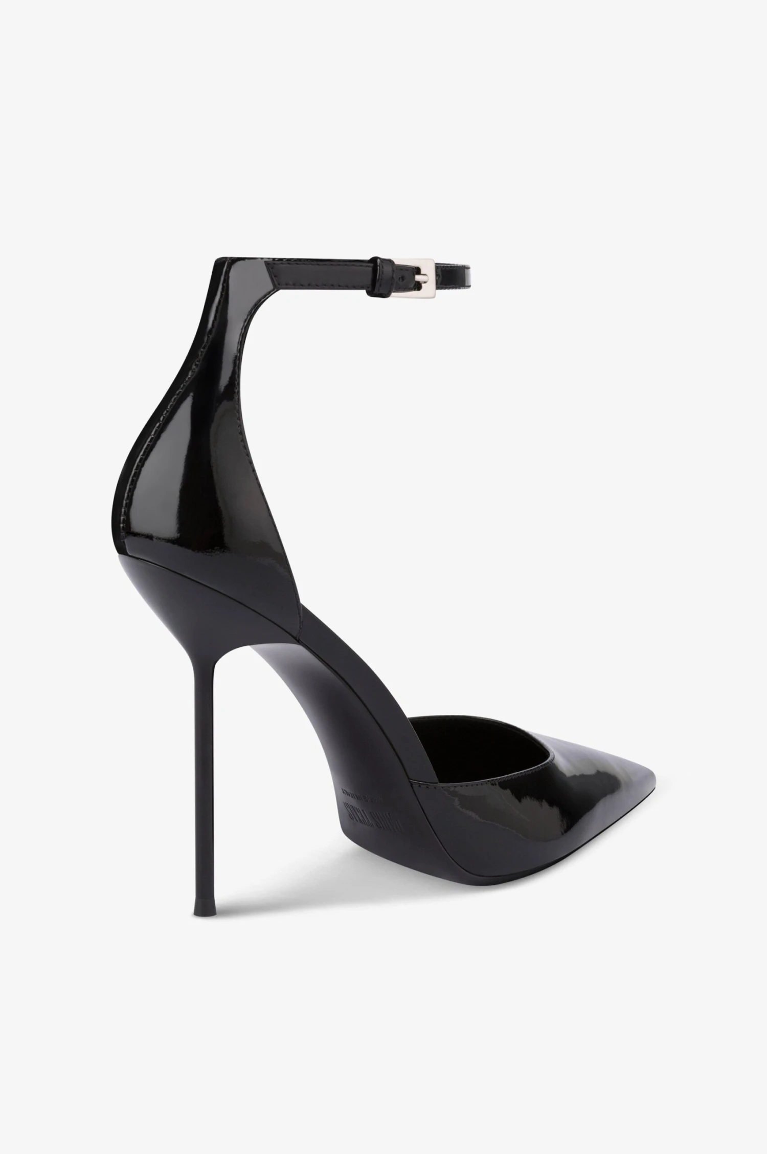 Pointed-toe pumps in black patent leather with an ankle strap. Covered pin heel. Made in Italy.