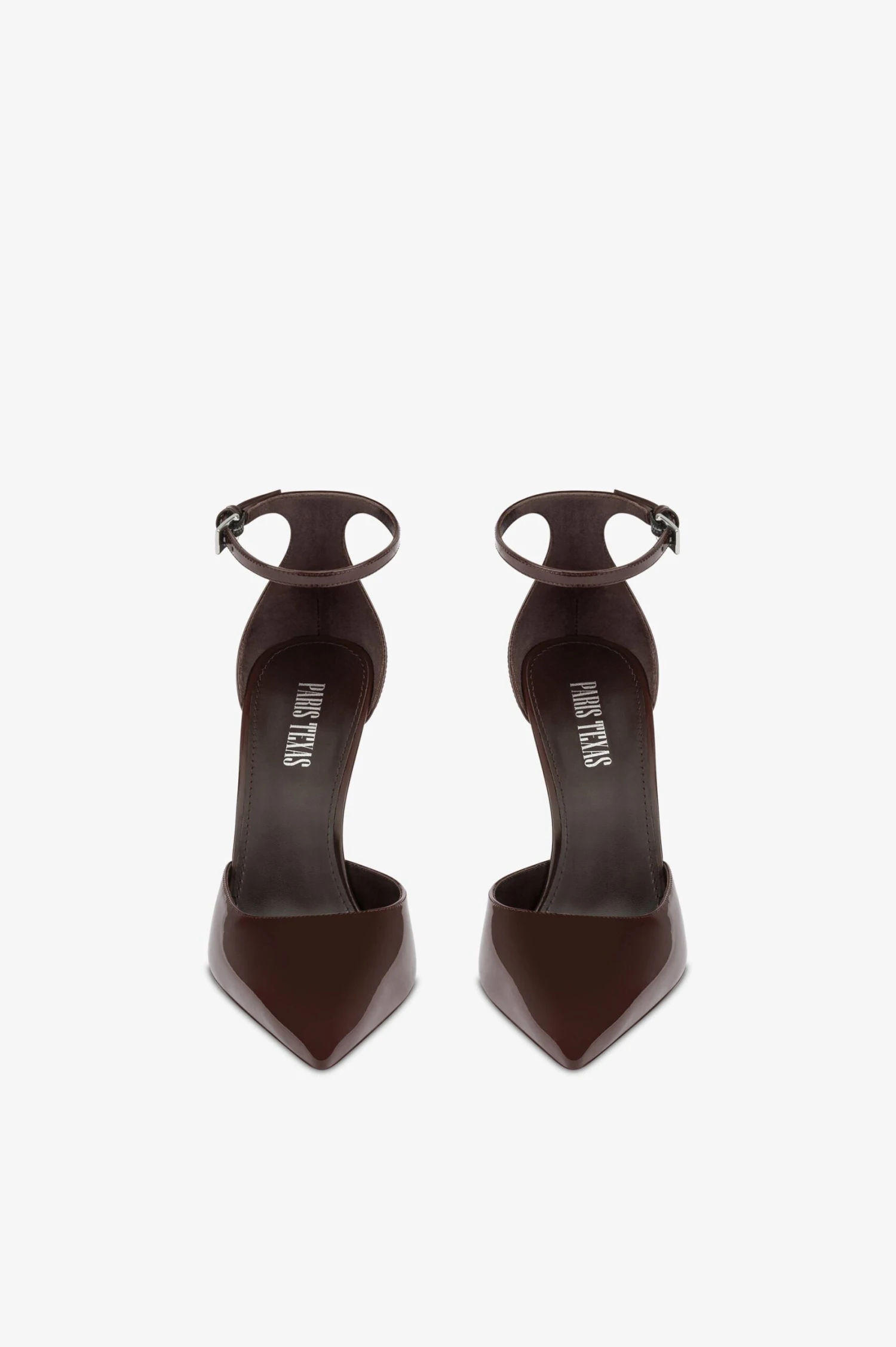 Pointed-toe pumps in ebony patent leather with an ankle strap. Covered pin heel. Made in Italy.