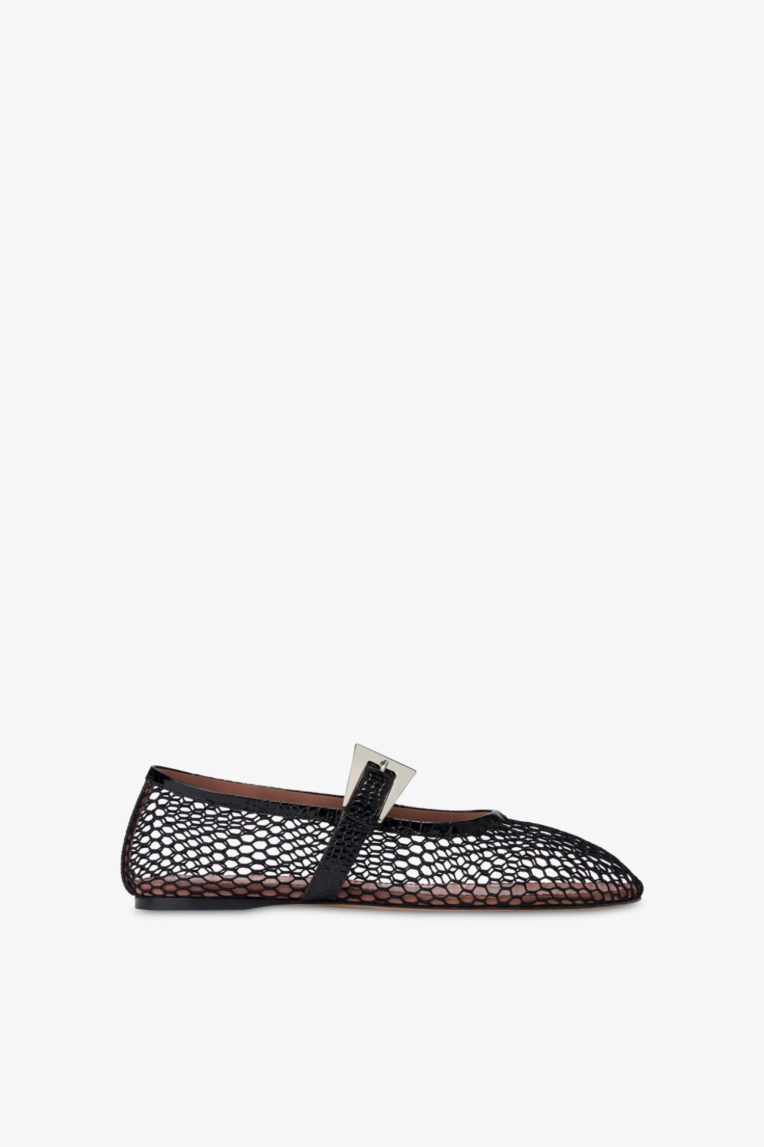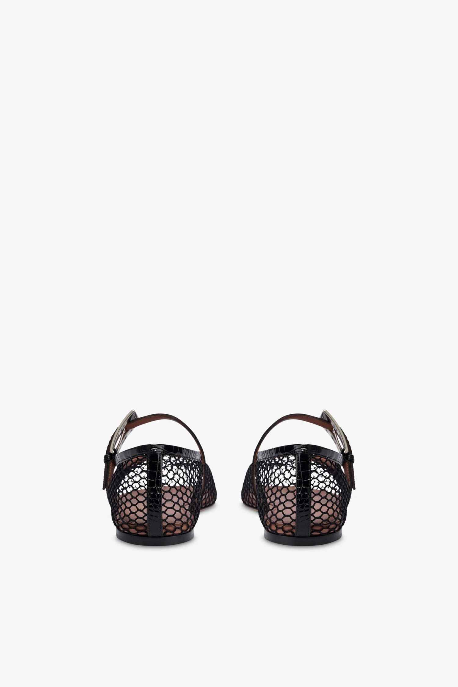 Round-toe ballet flats with a buckle in black mesh and croco-embossed leather. Made in Italy.