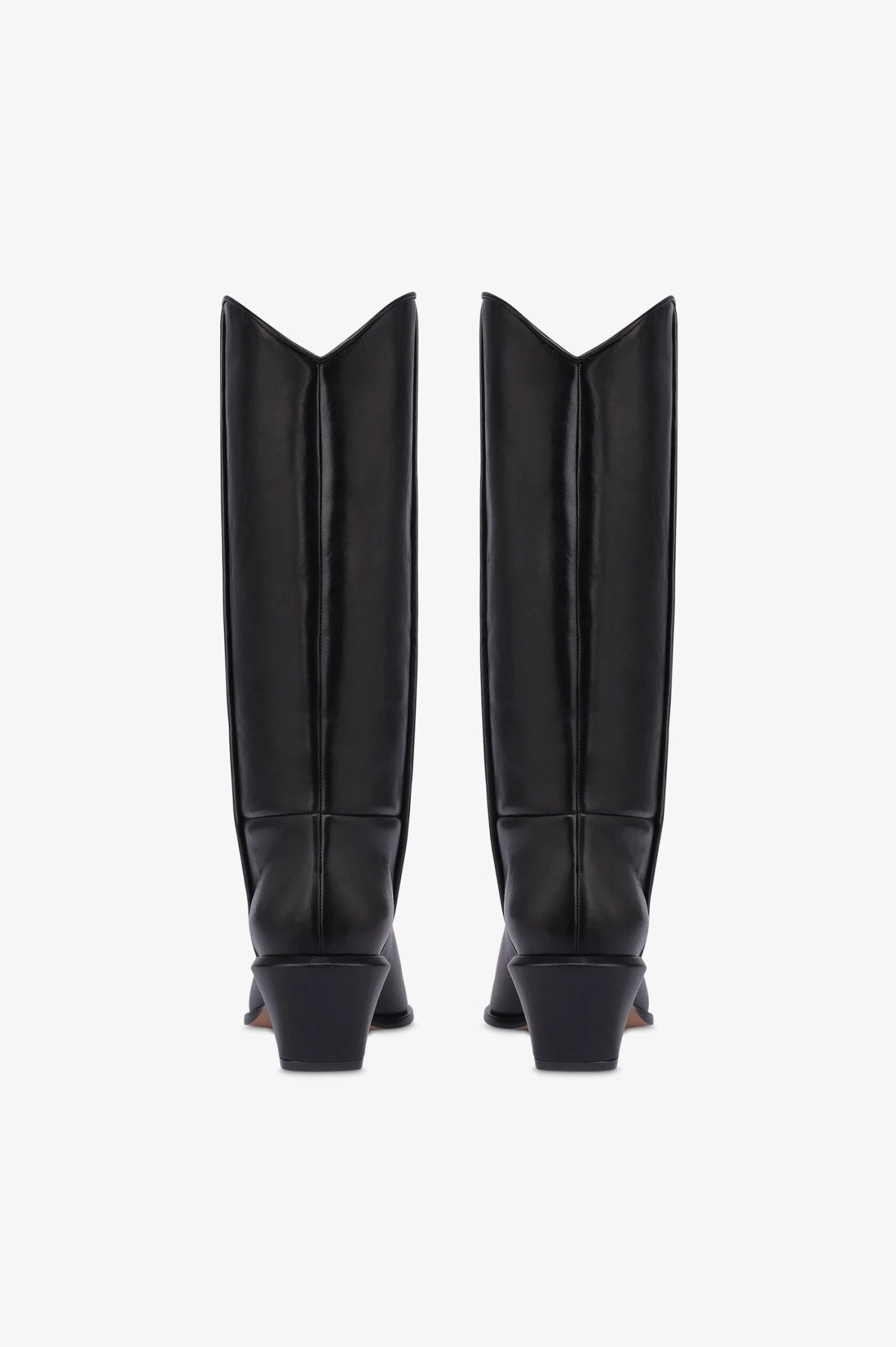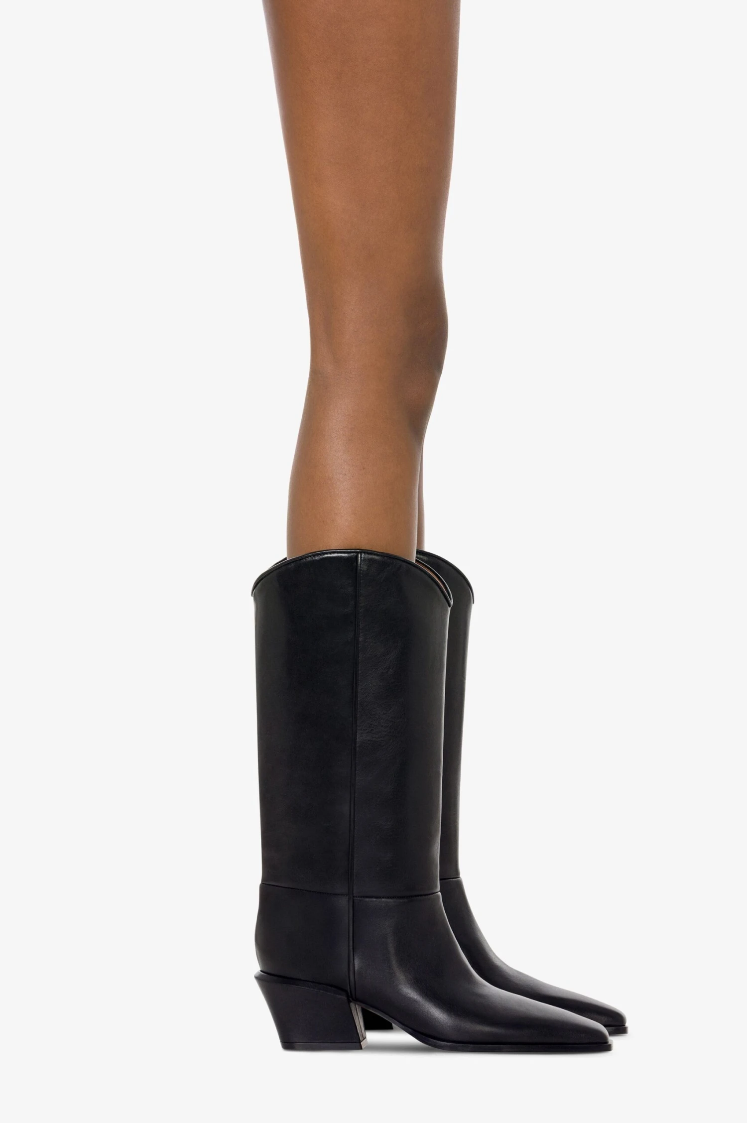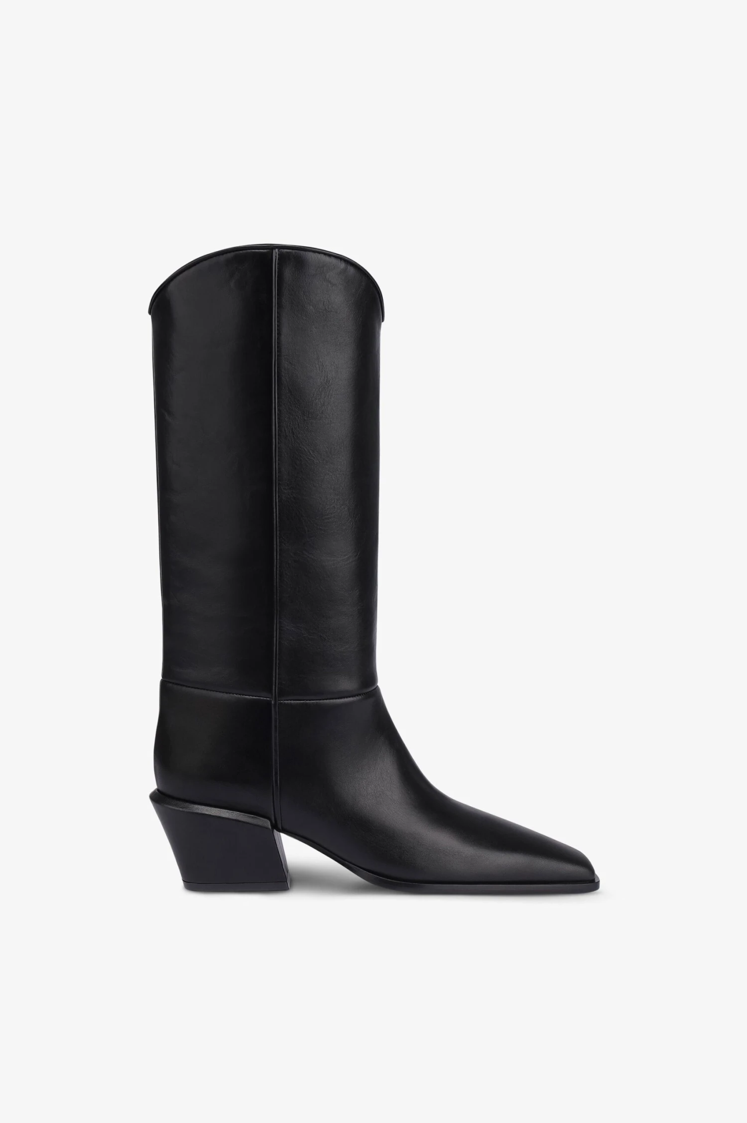 Pointed-toe boots in black calf leather. Covered chunky heel. Made in Italy.