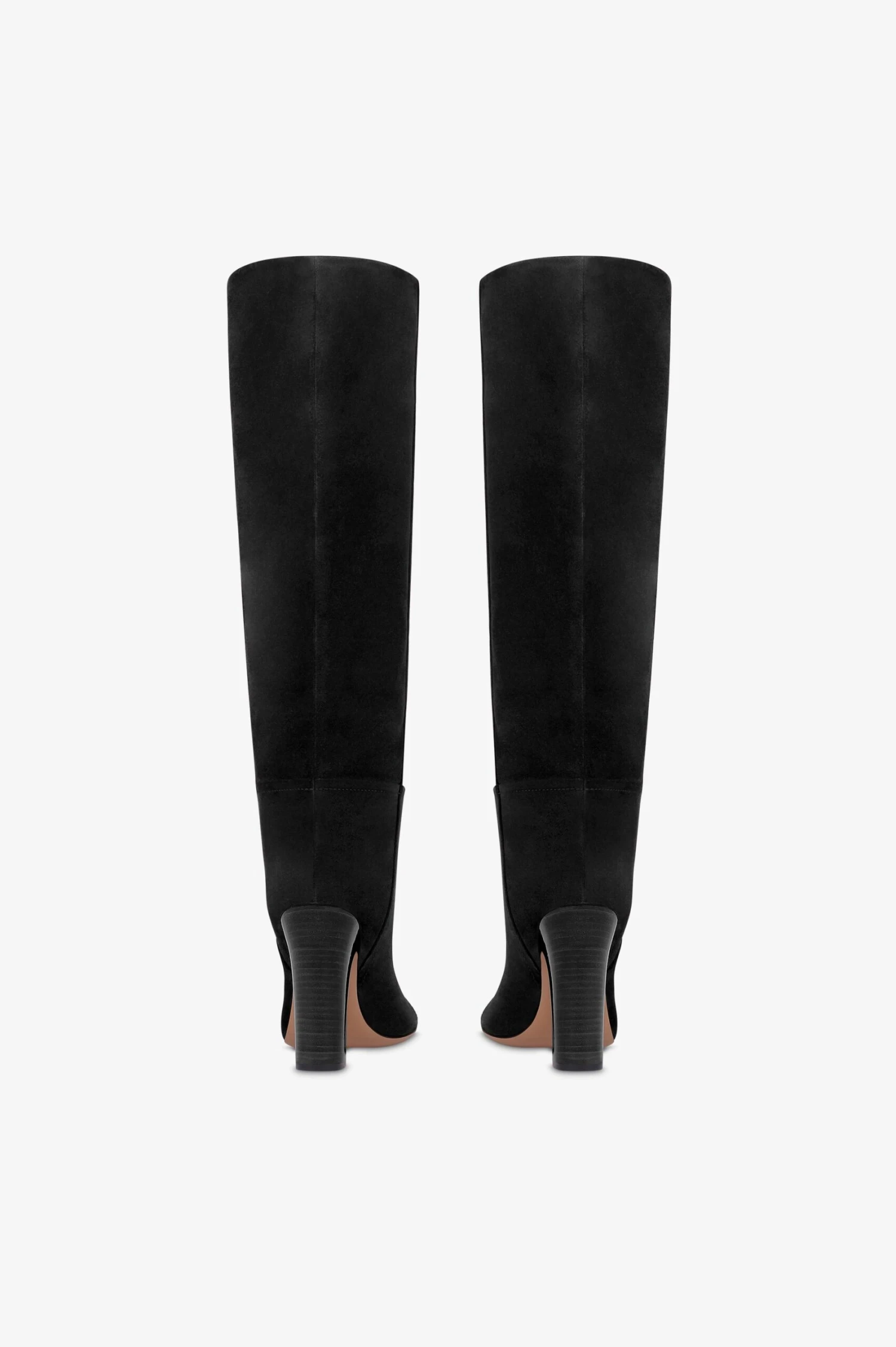 Round-toe boots in black calf suede leather. Covered chunky heel. Made in Italy.