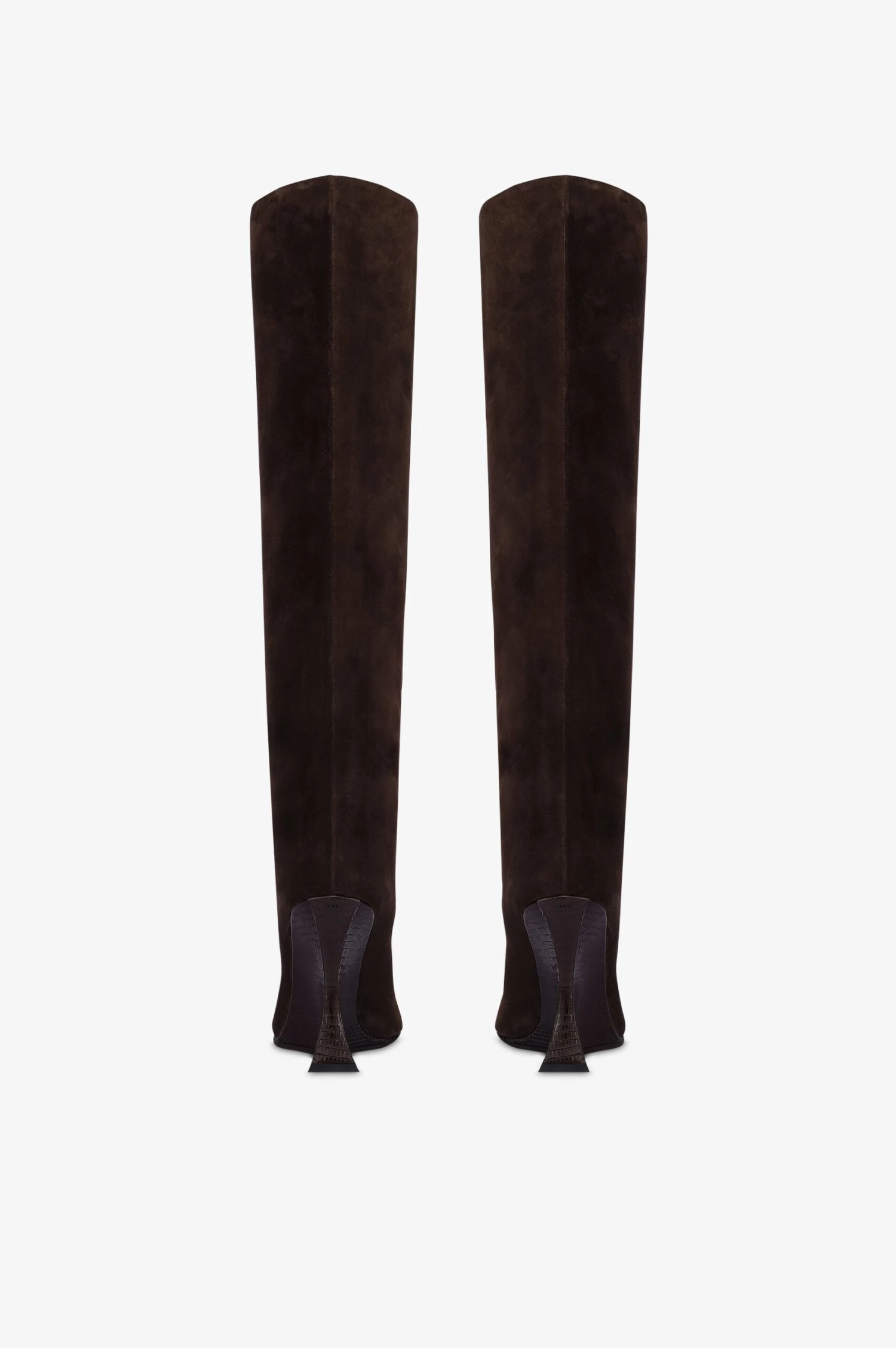 Pointed-toe boots in chocolate calf suede leather. Lizard print leather wedge heel. Made in Italy.