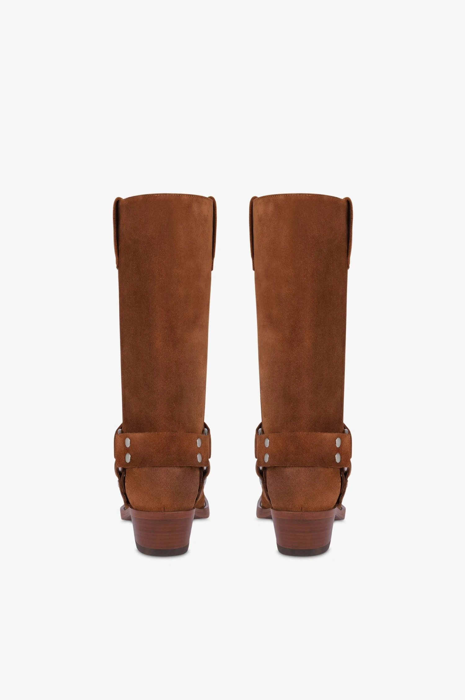 Square-toe boots in cognac calf suede leather with a strap and metal ring detail. Covered chunky heel. Made in Italy.