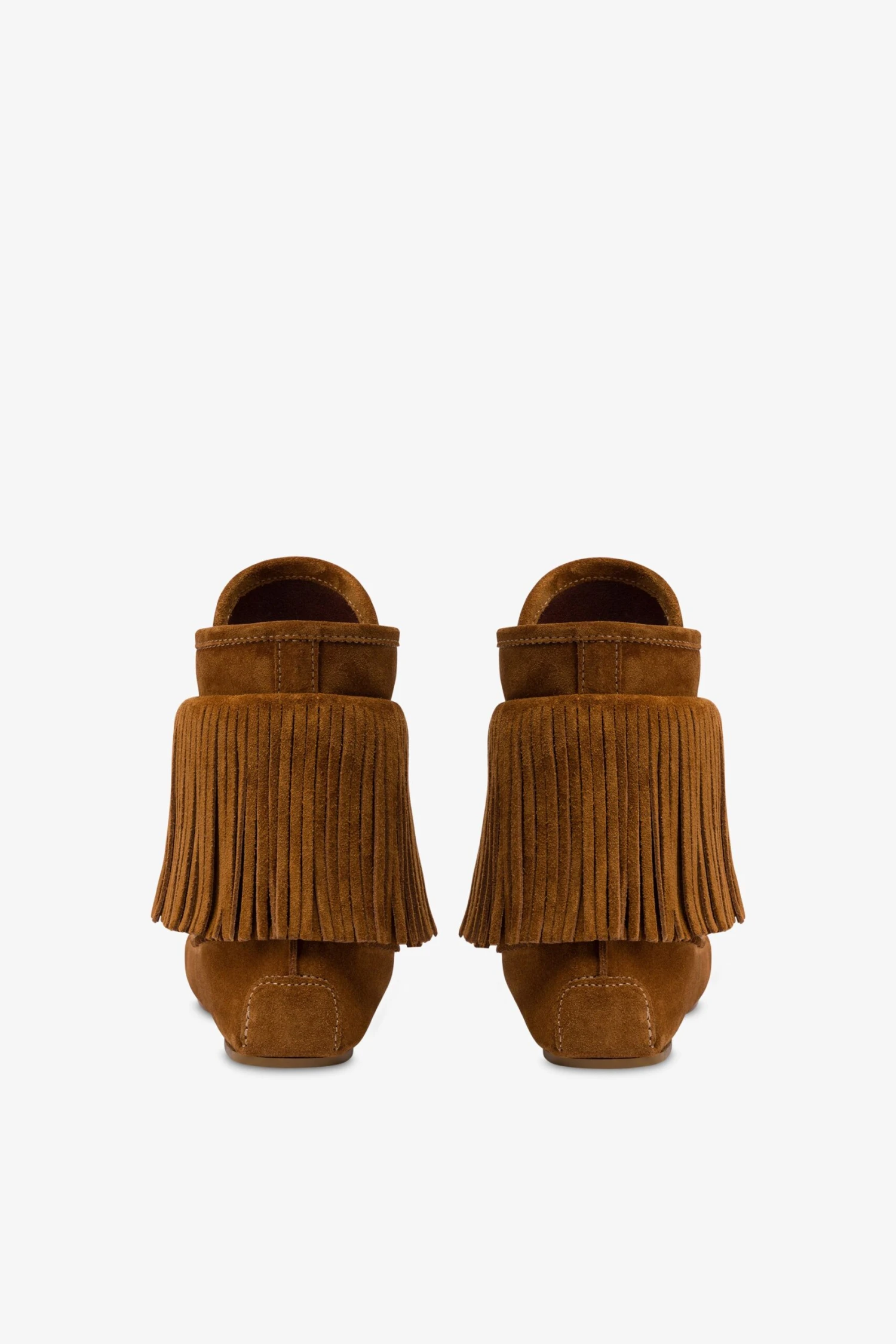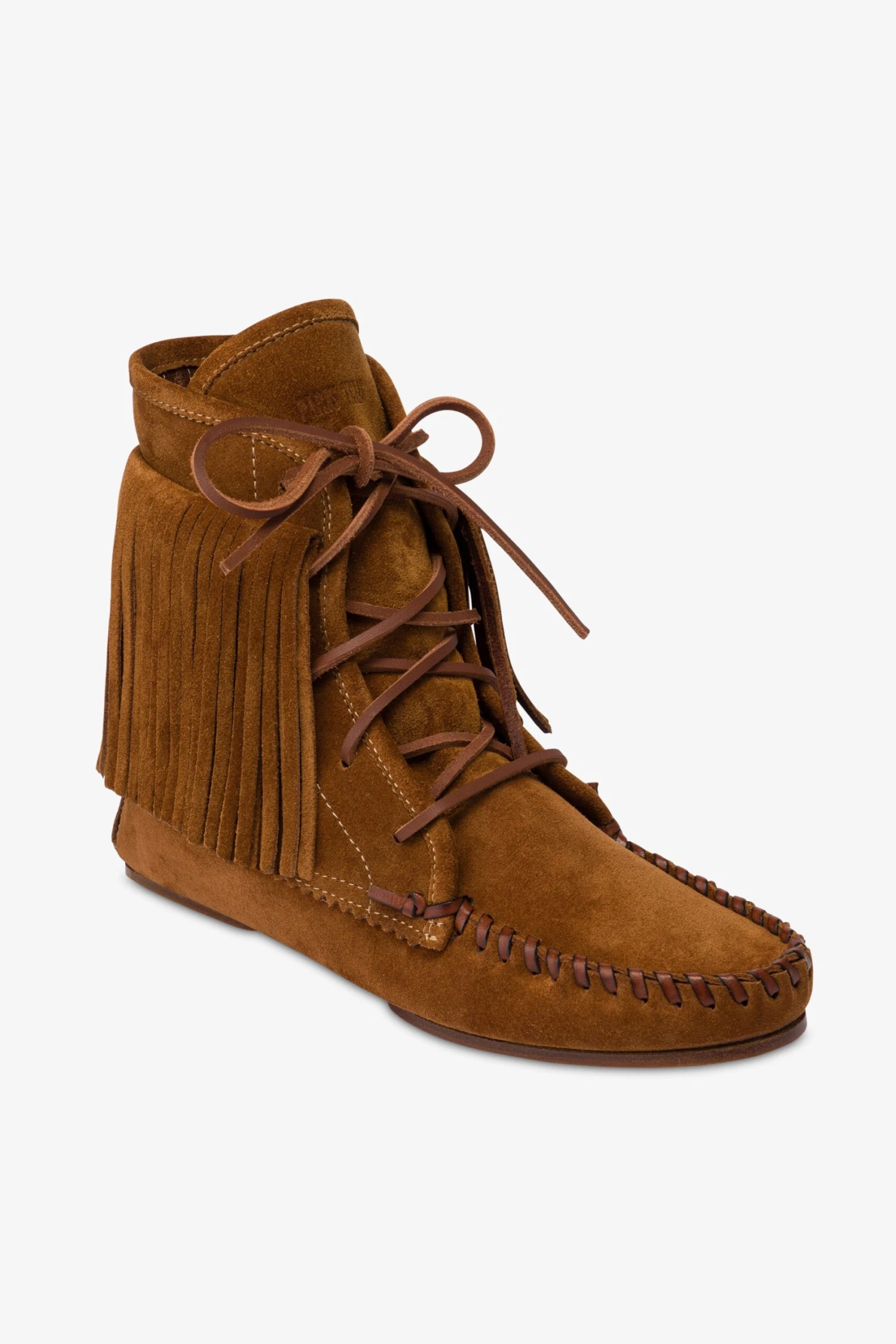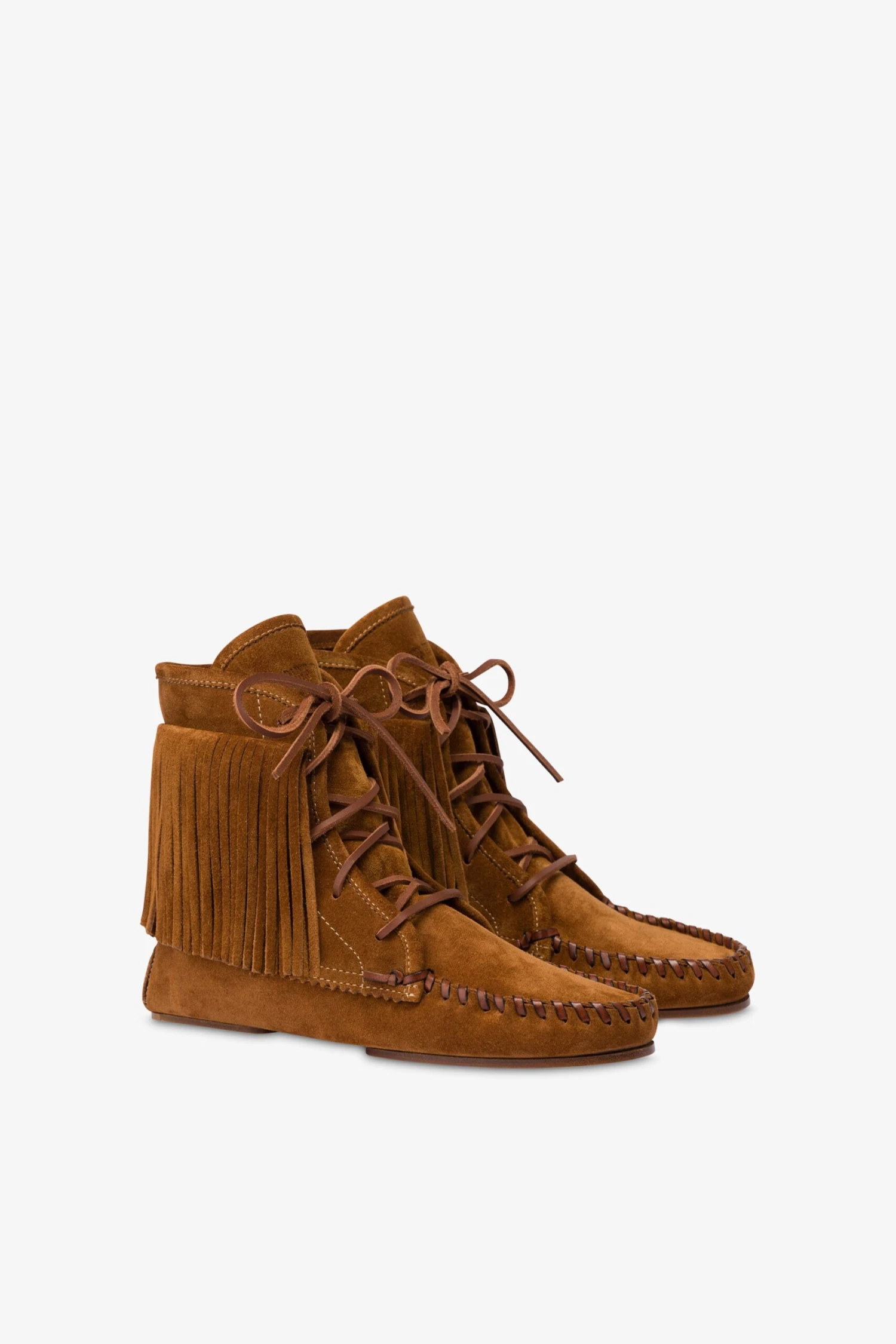 Lace-up ankle boots with fringing in cognac suede leather. Made in Italy.