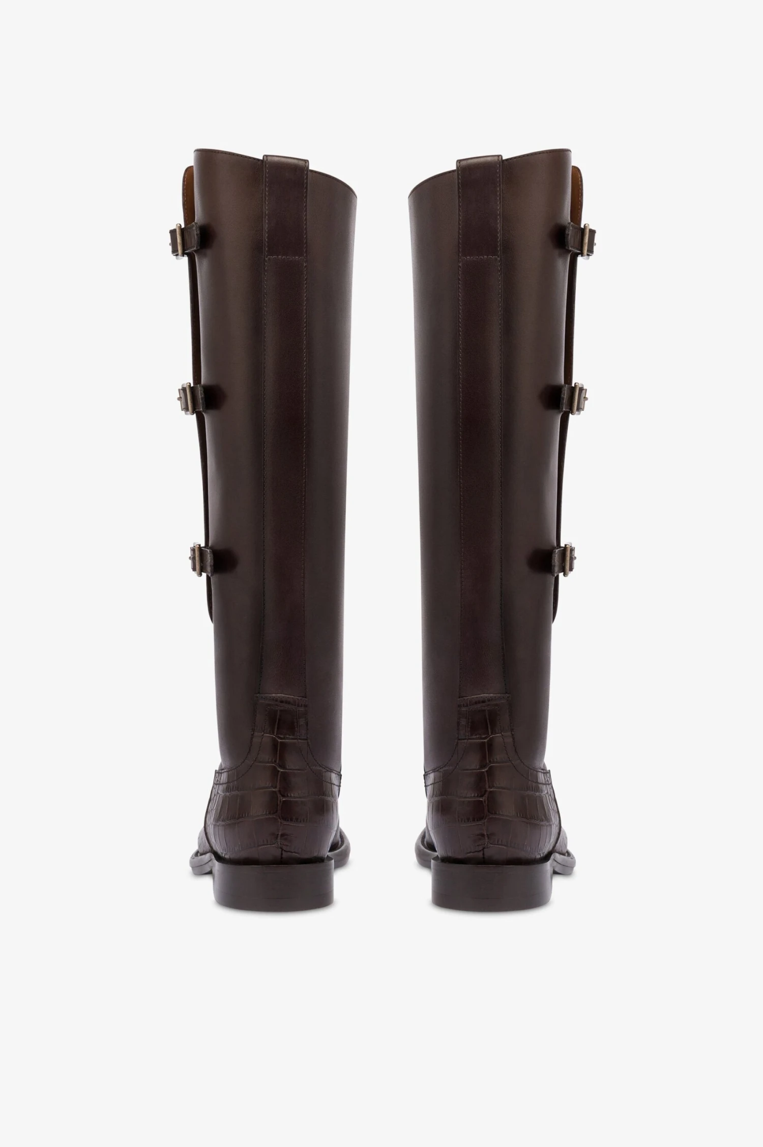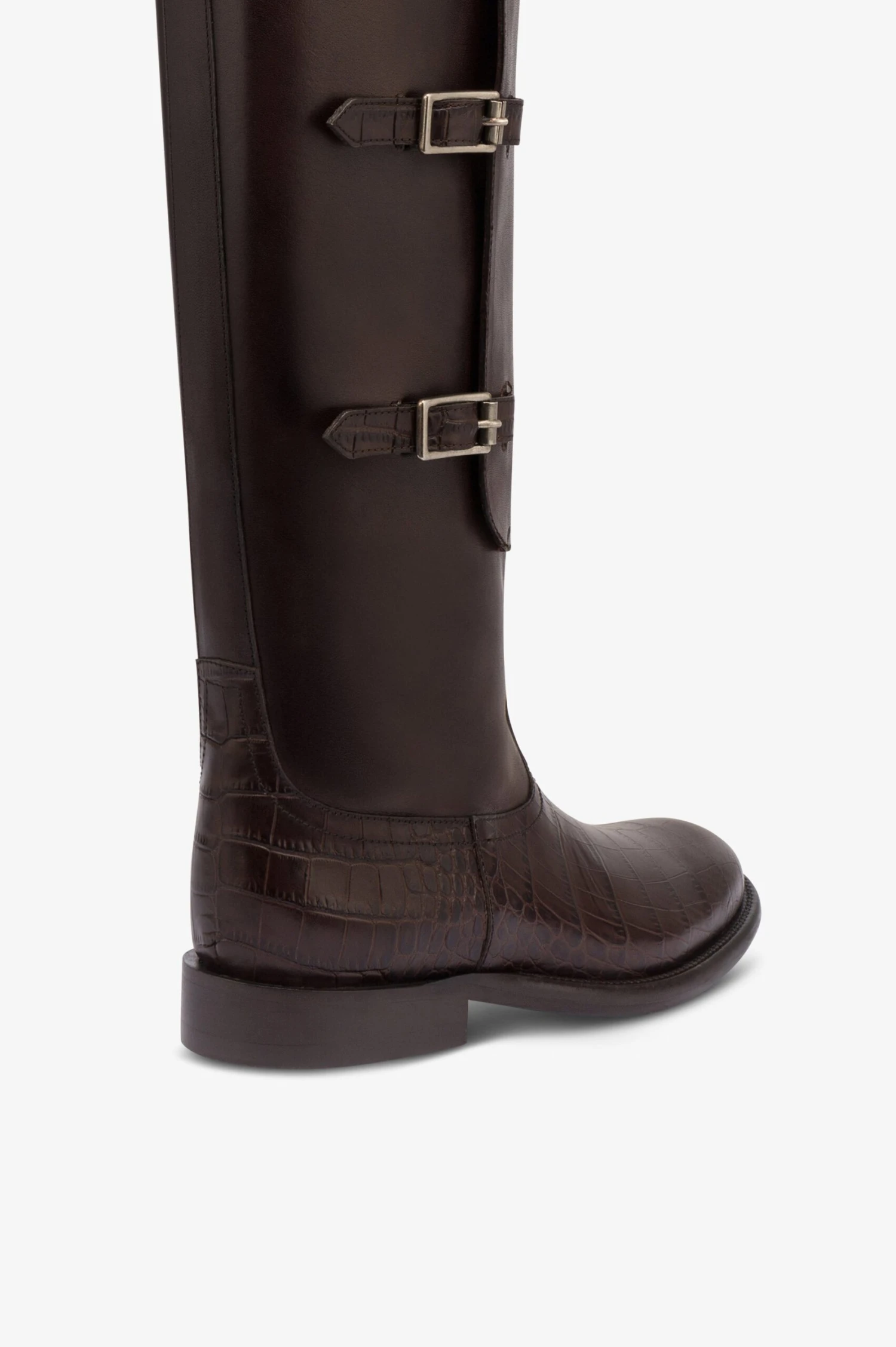 Round-toe boots in ebony calf leather with croco-embossed details and side buckles. Made in Italy.