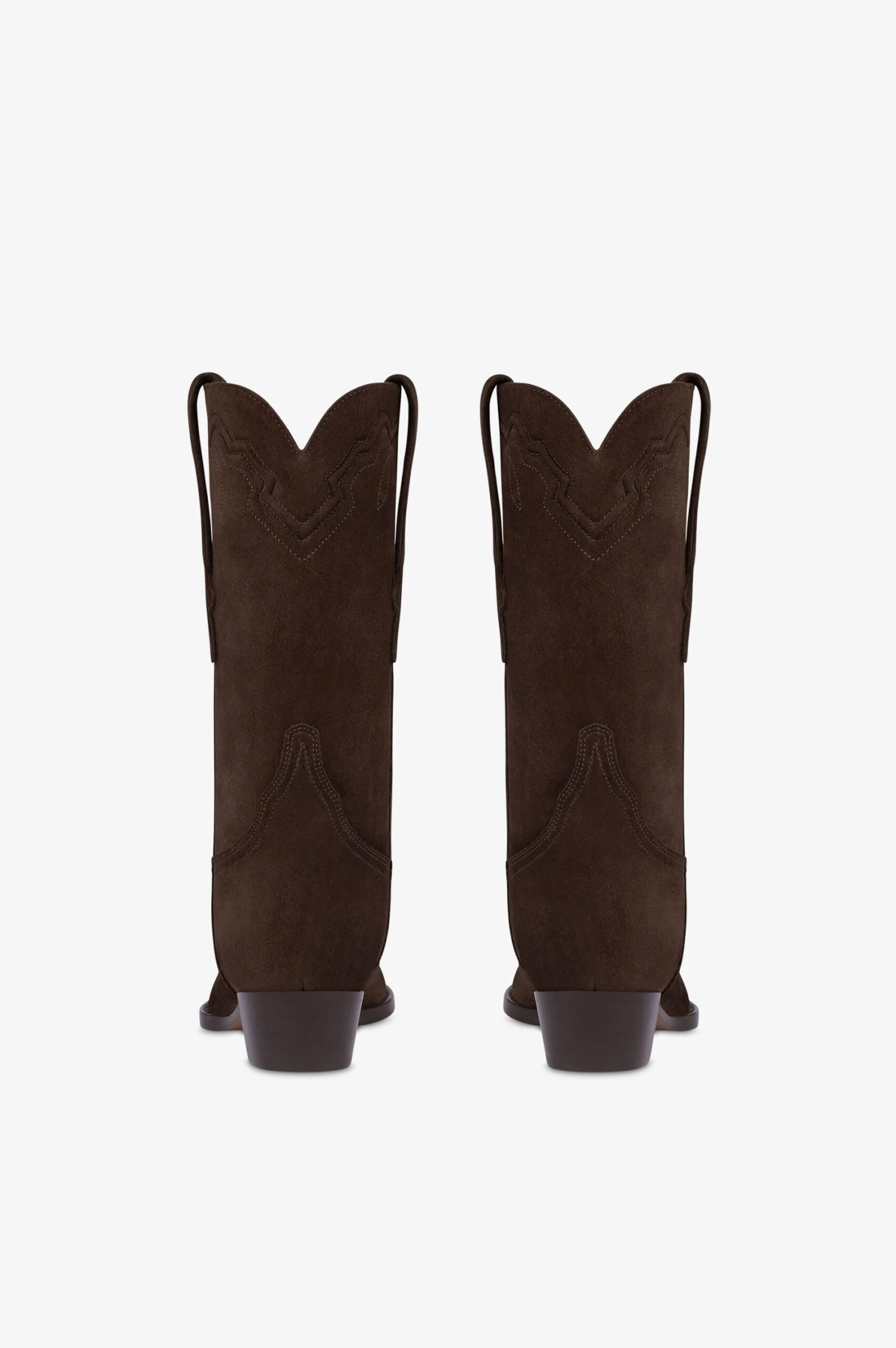 Square-toe boots in ebony calf suede leather with Western-style embroidery. Made in Italy.