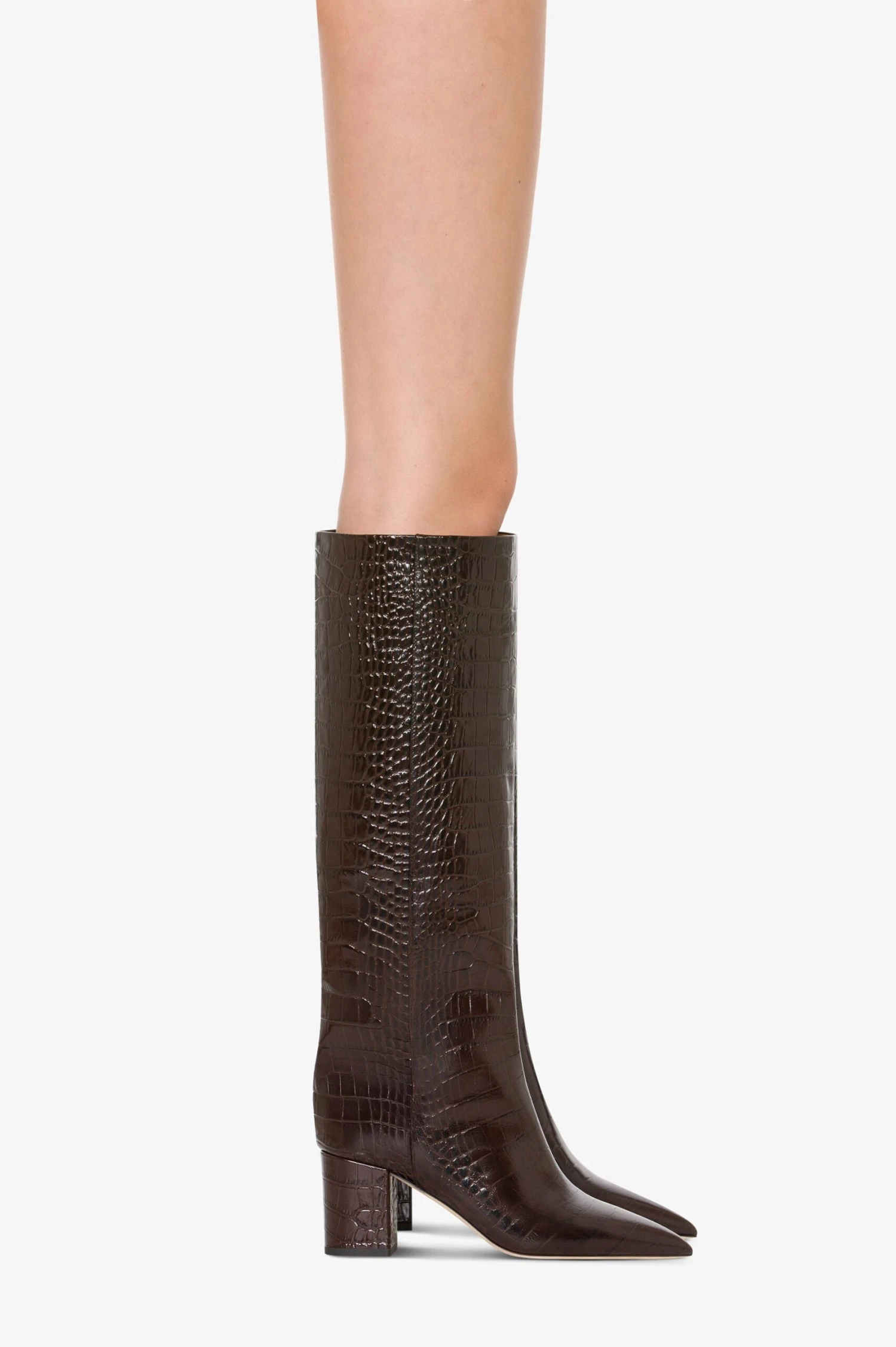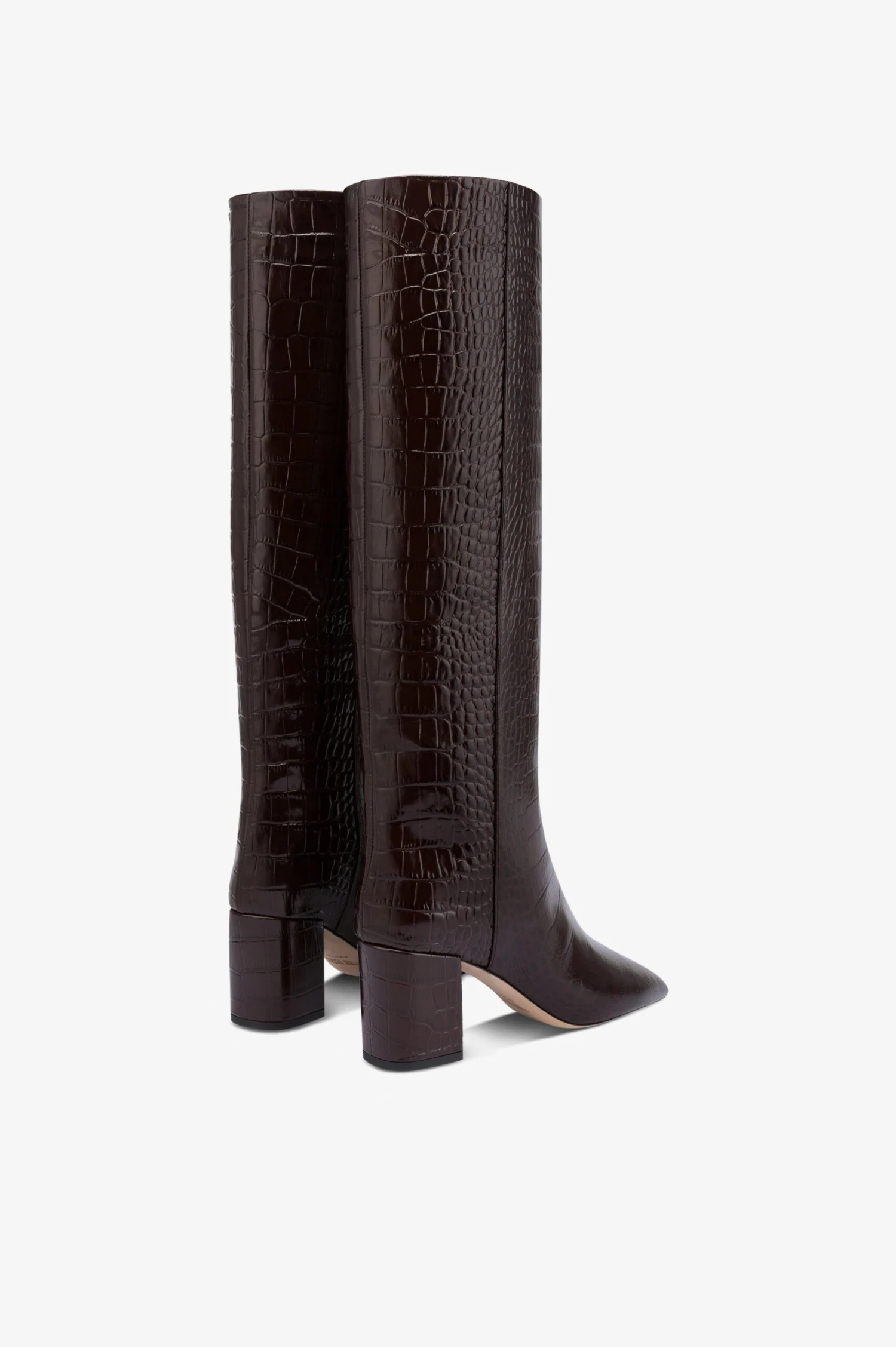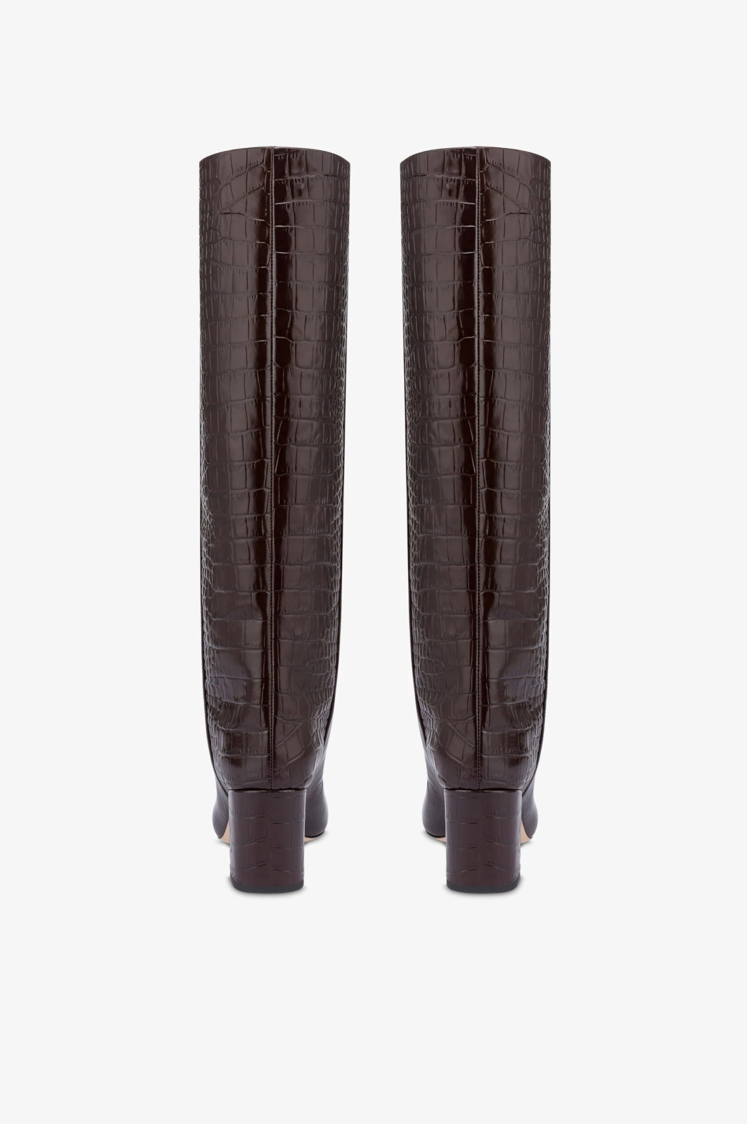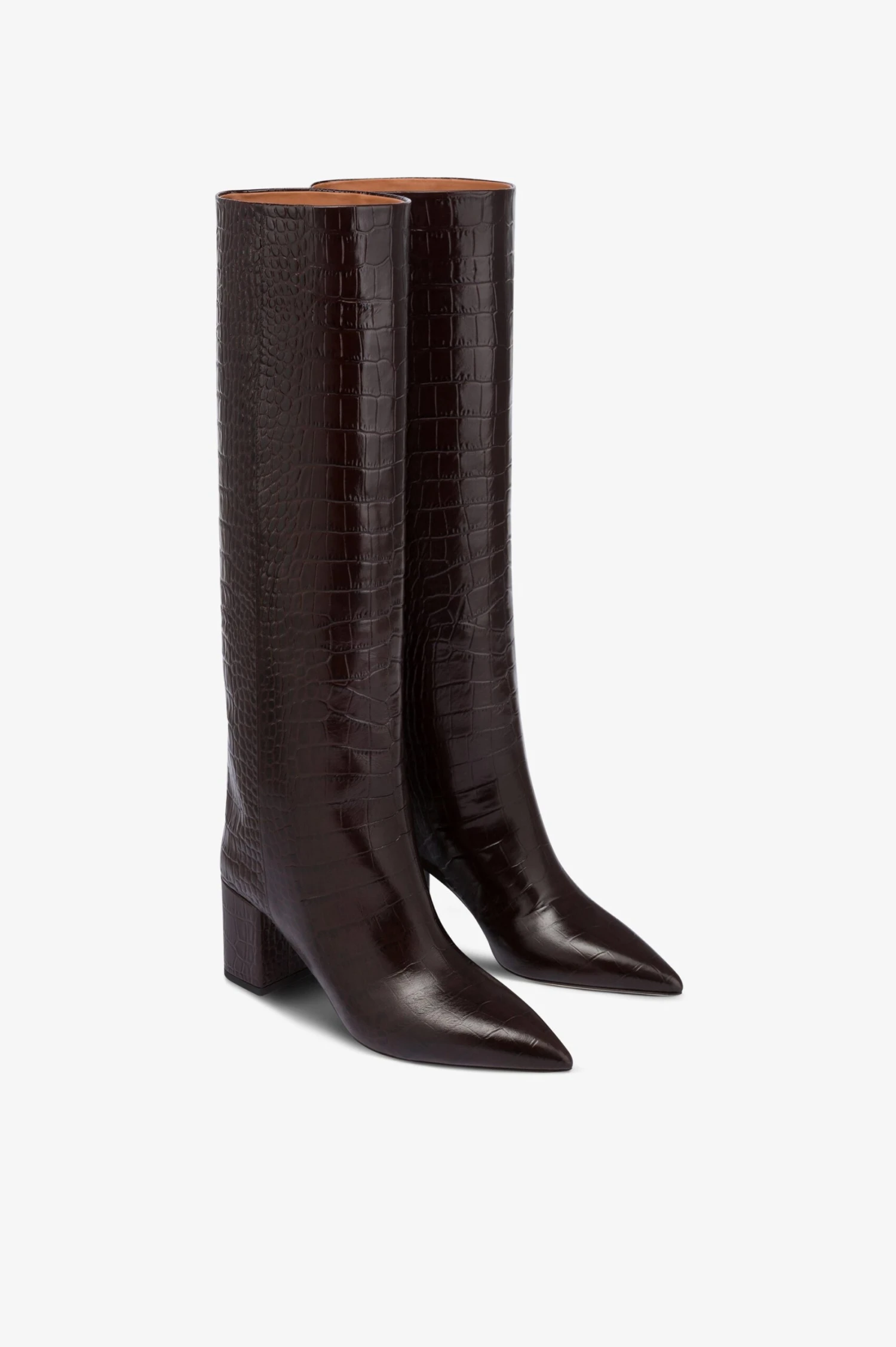 Pointed-toe boots in ebony croco-embossed leather. Covered chunky heel. Made in Italy.