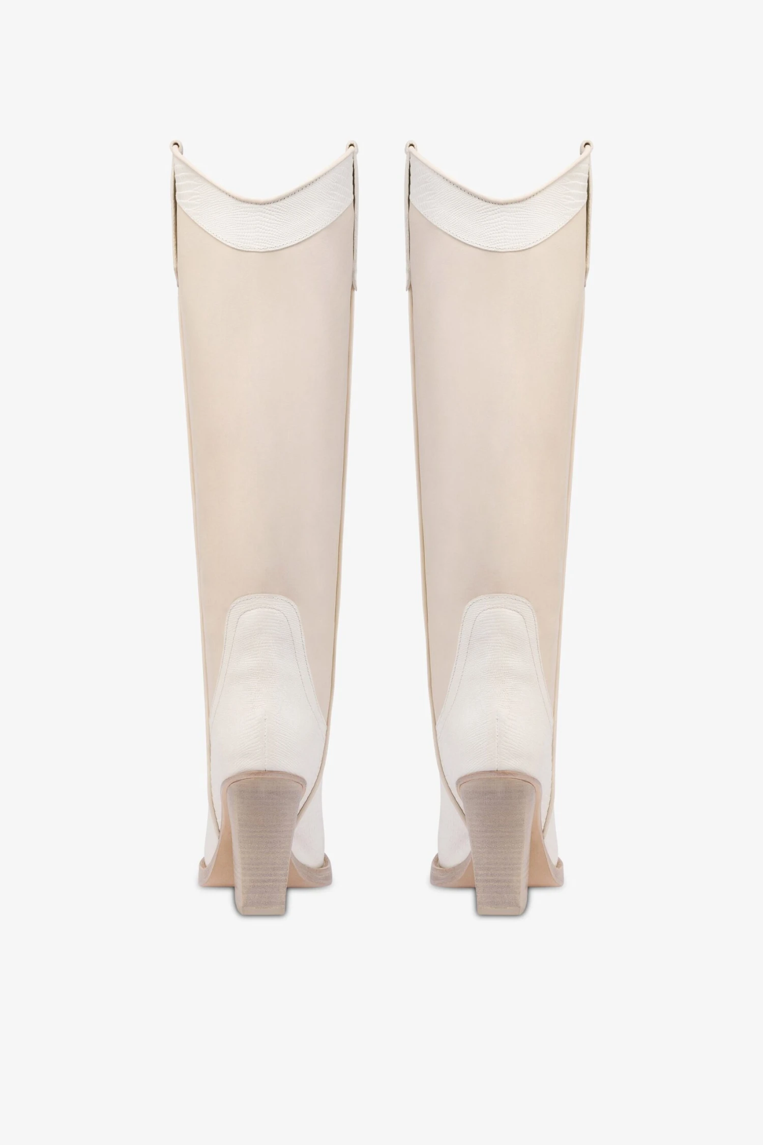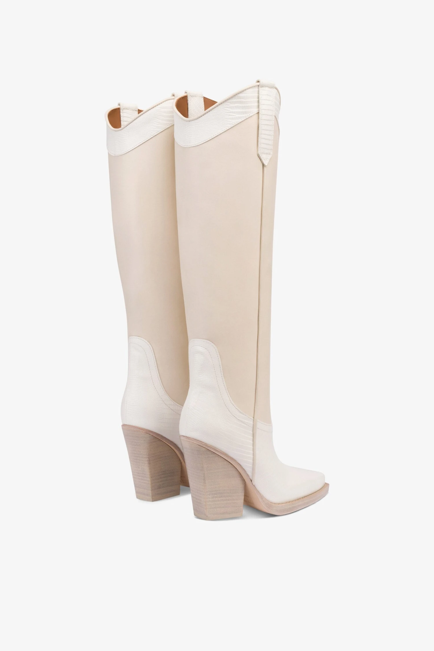 Pointed-toe Texan boots in lizard-print and white leather with a chunky heel. Made in Italy.