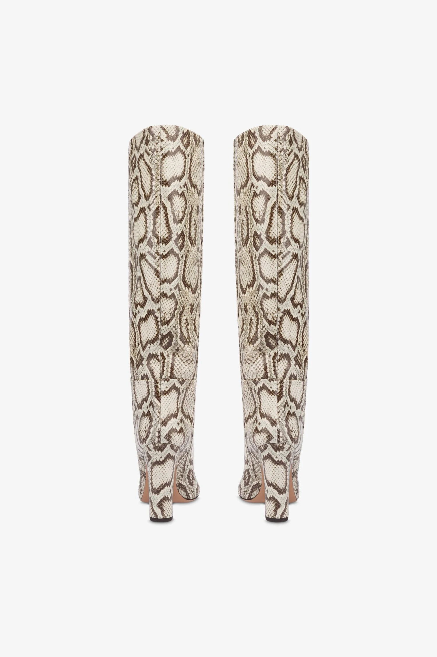 Round-toe boots in natural printed python leather. Covered chunky heel. Made in Italy.