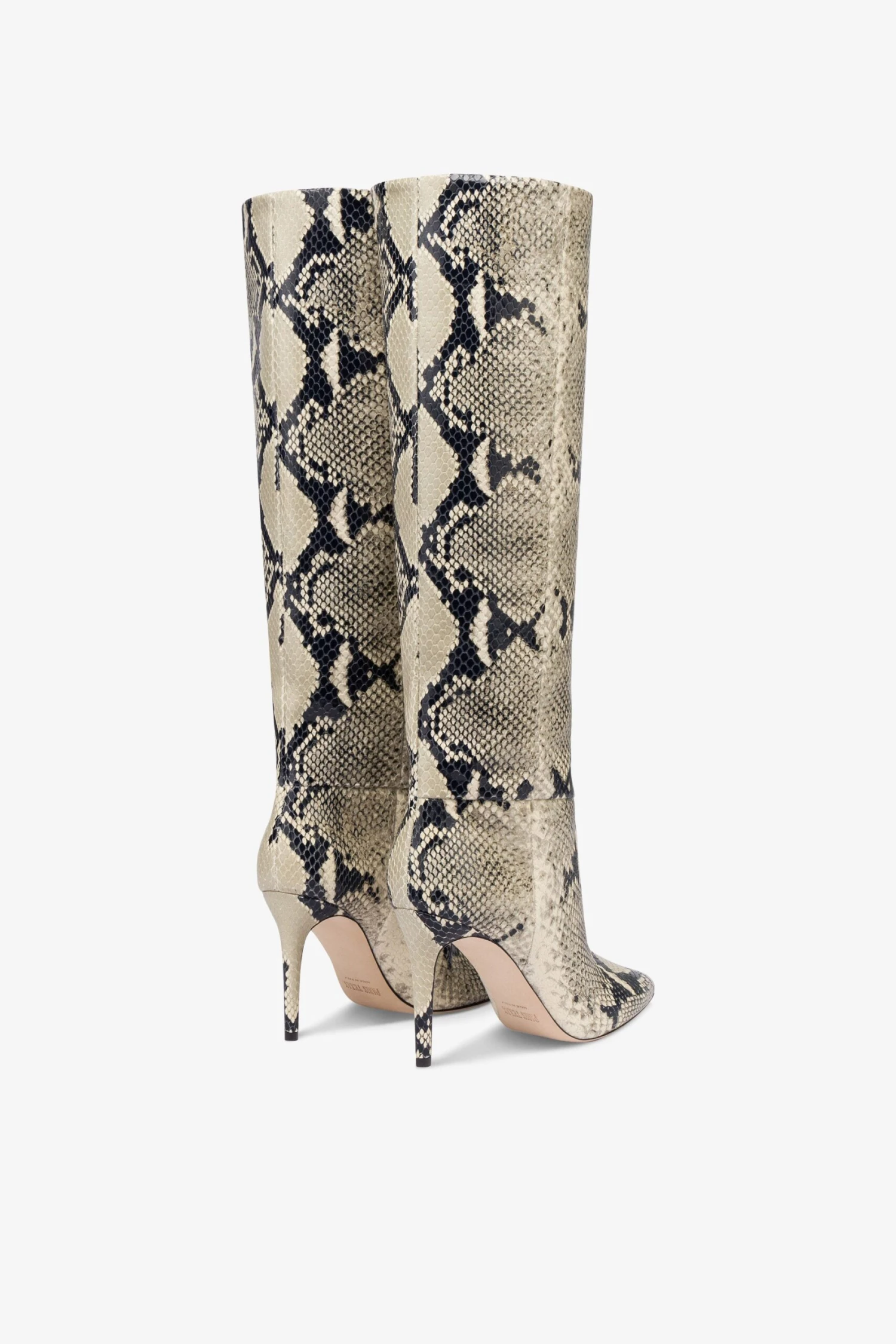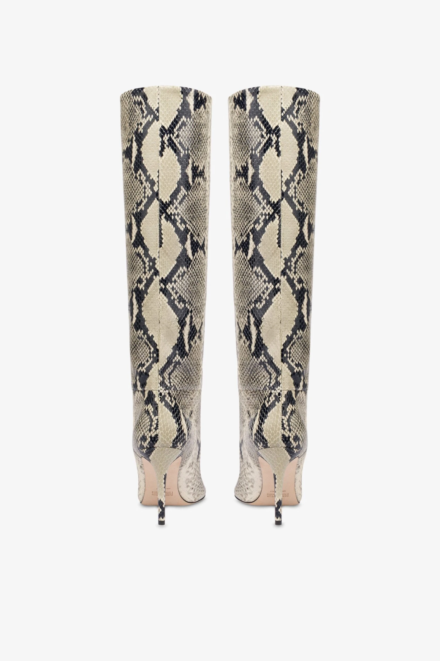 Pointed-toe boots with a covered pin heel in white python-print leather. Made in Italy.