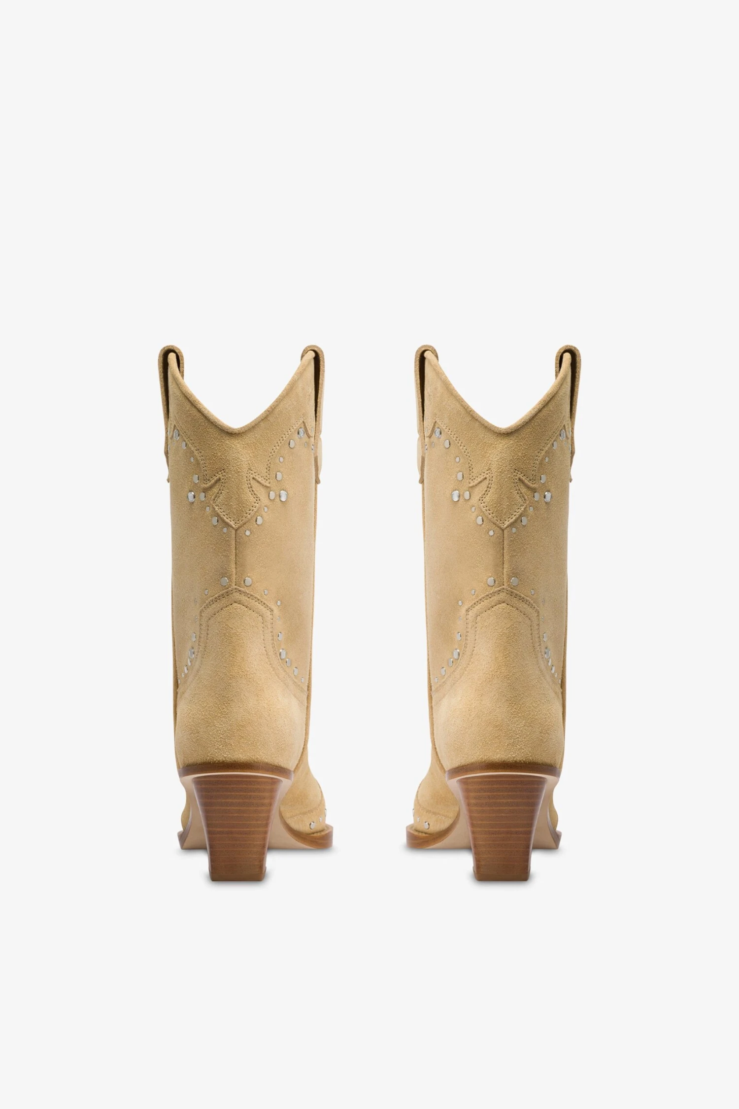 Pointed-toe Texan boots with Western-style embroidery, rhinestones, and silver studs in ecru suede leather. Made in Italy.