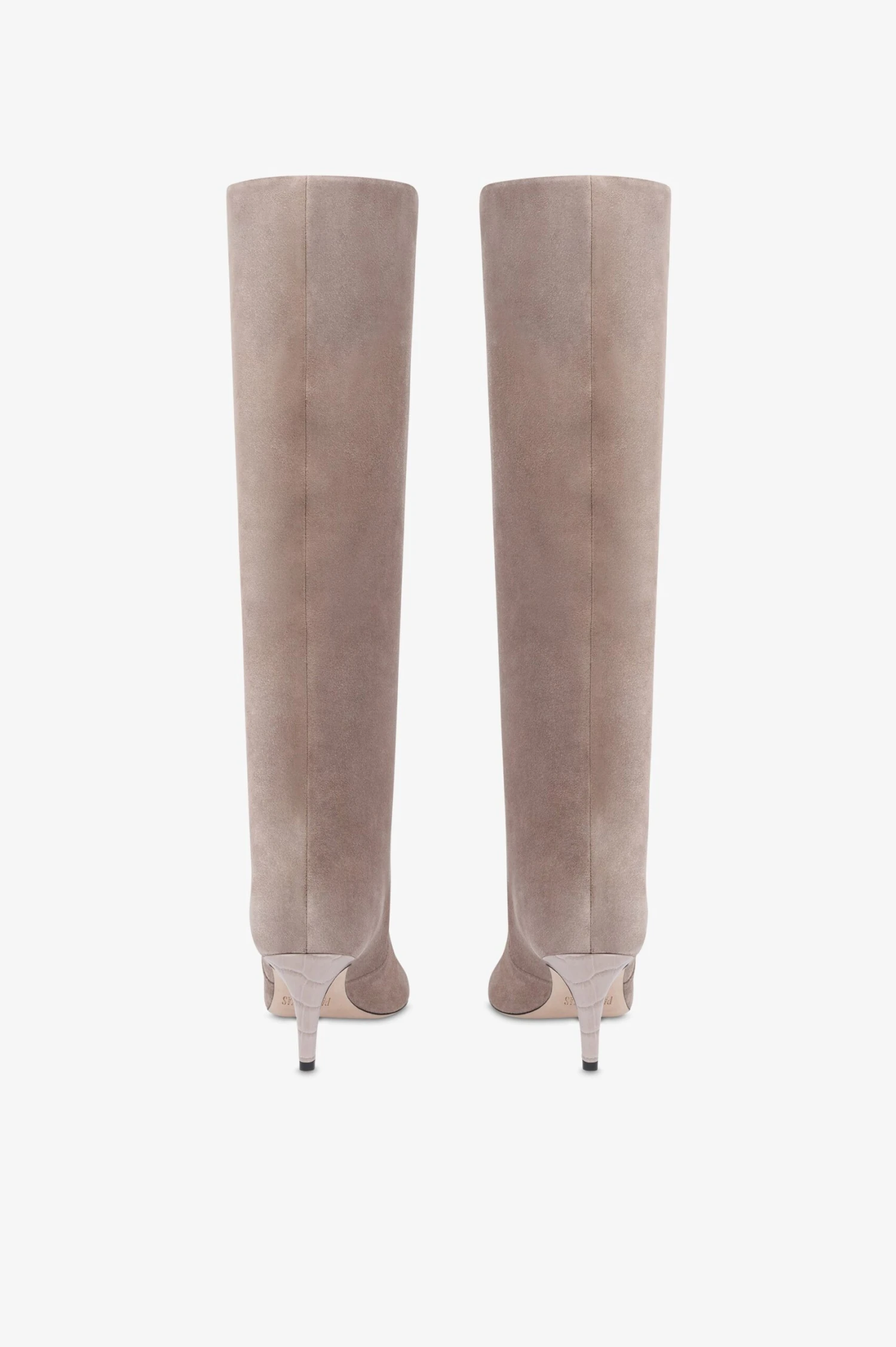Pointed-toe boots in taupe calf suede leather. Stiletto heel. Made in Italy.
