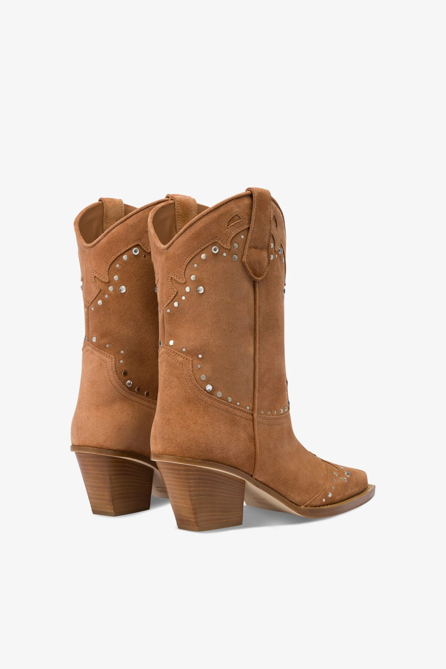 Pointed-toe Texan boots with Western-style embroidery, rhinestones, and silver studs in terracotta suede leather. Made in Italy.