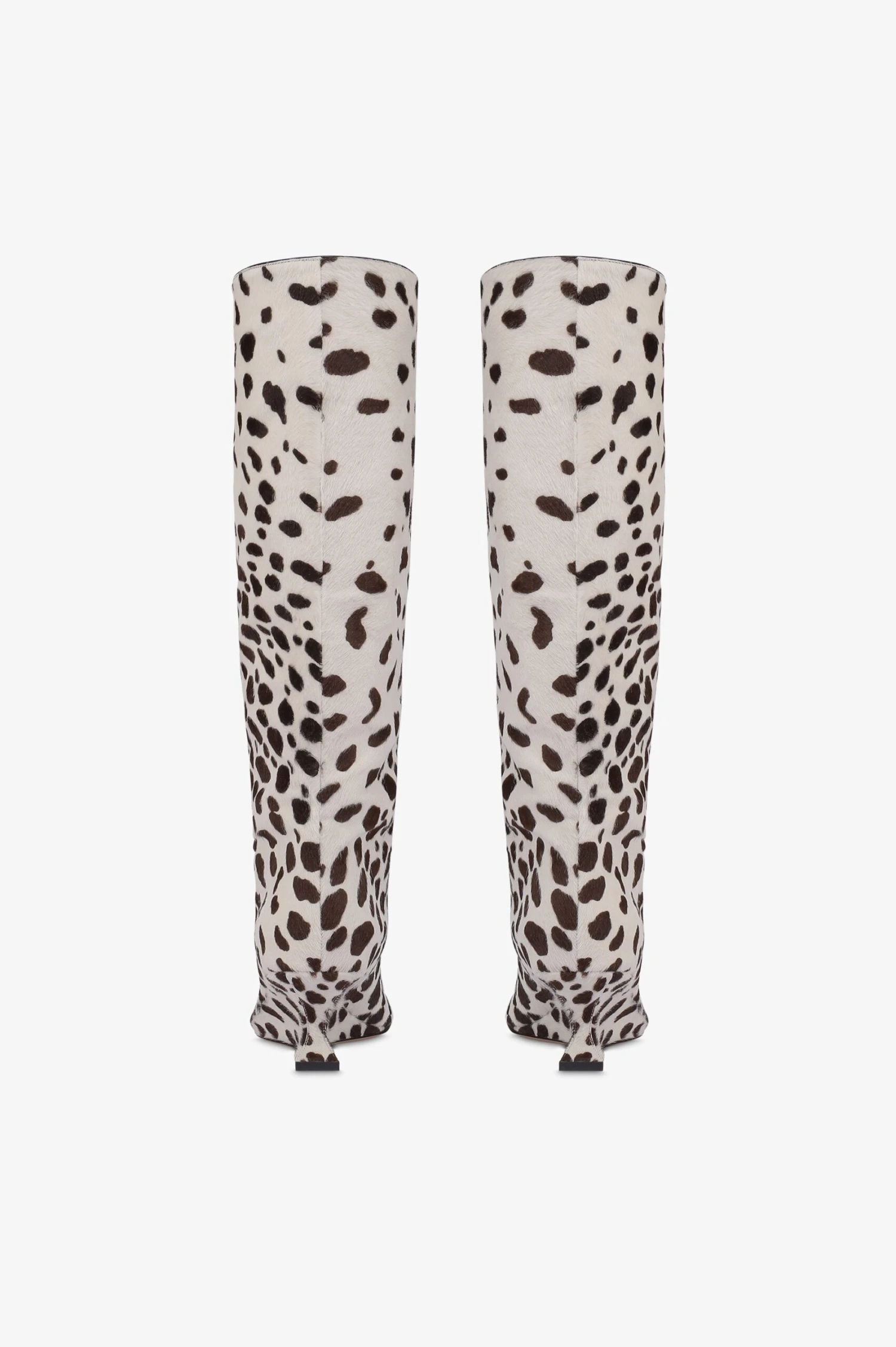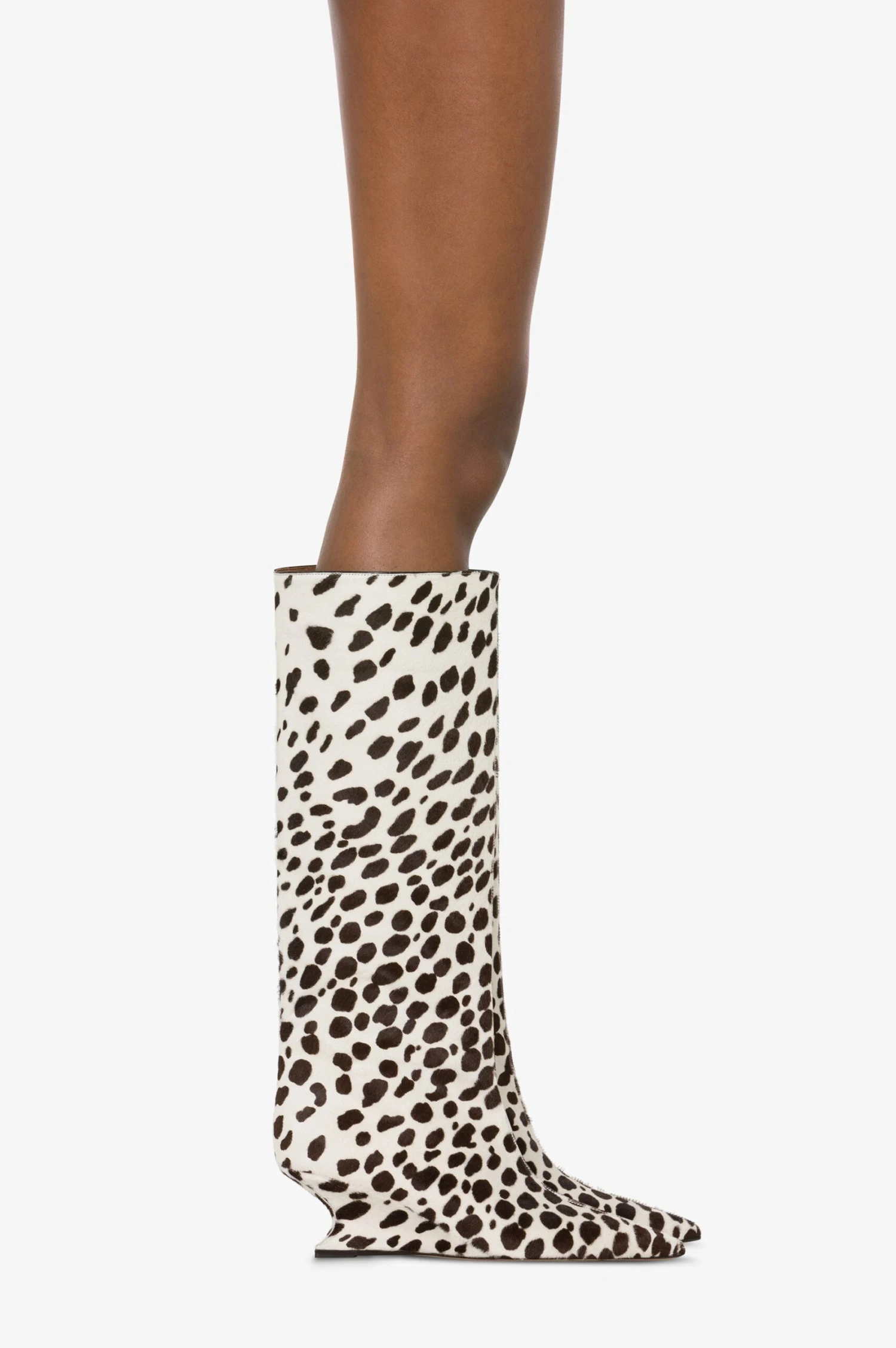 Pointed-toe boots in white and dark brown printed cowhide. Covered wedge heel. Made in Italy.