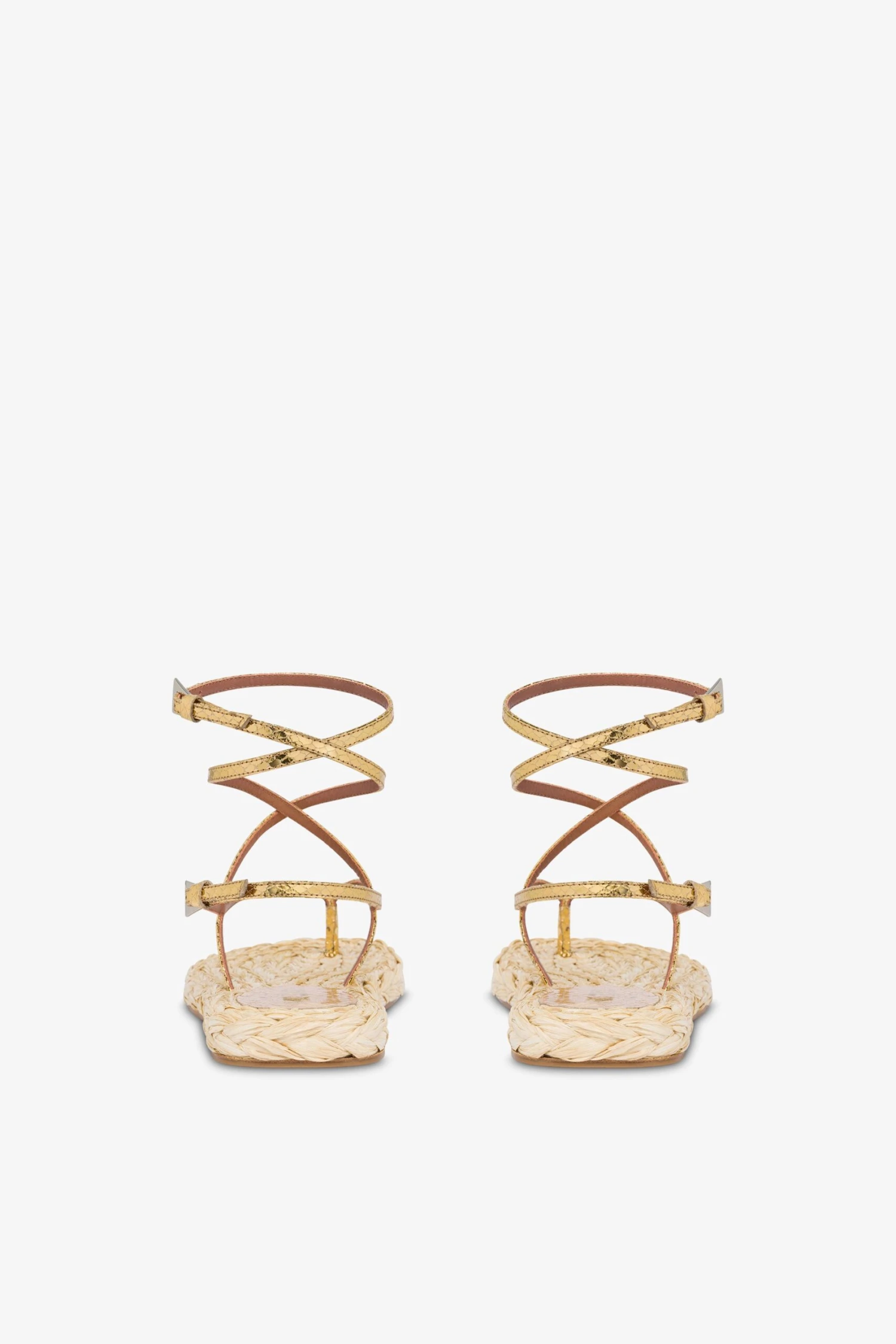 Lace-up flat sandals with a toe post in natural raffia and gold metallic python-print leather. Made in Italy.