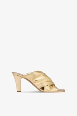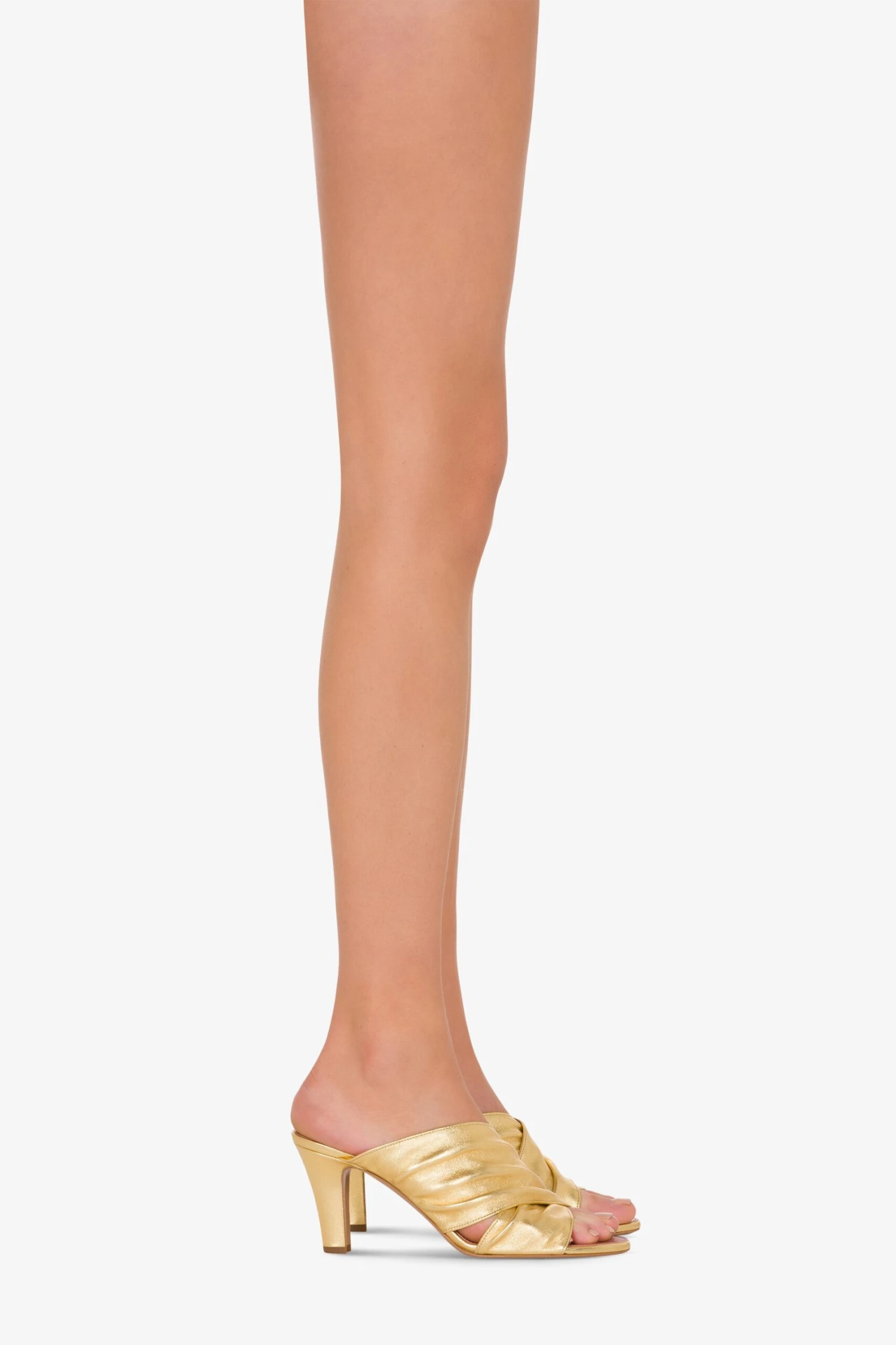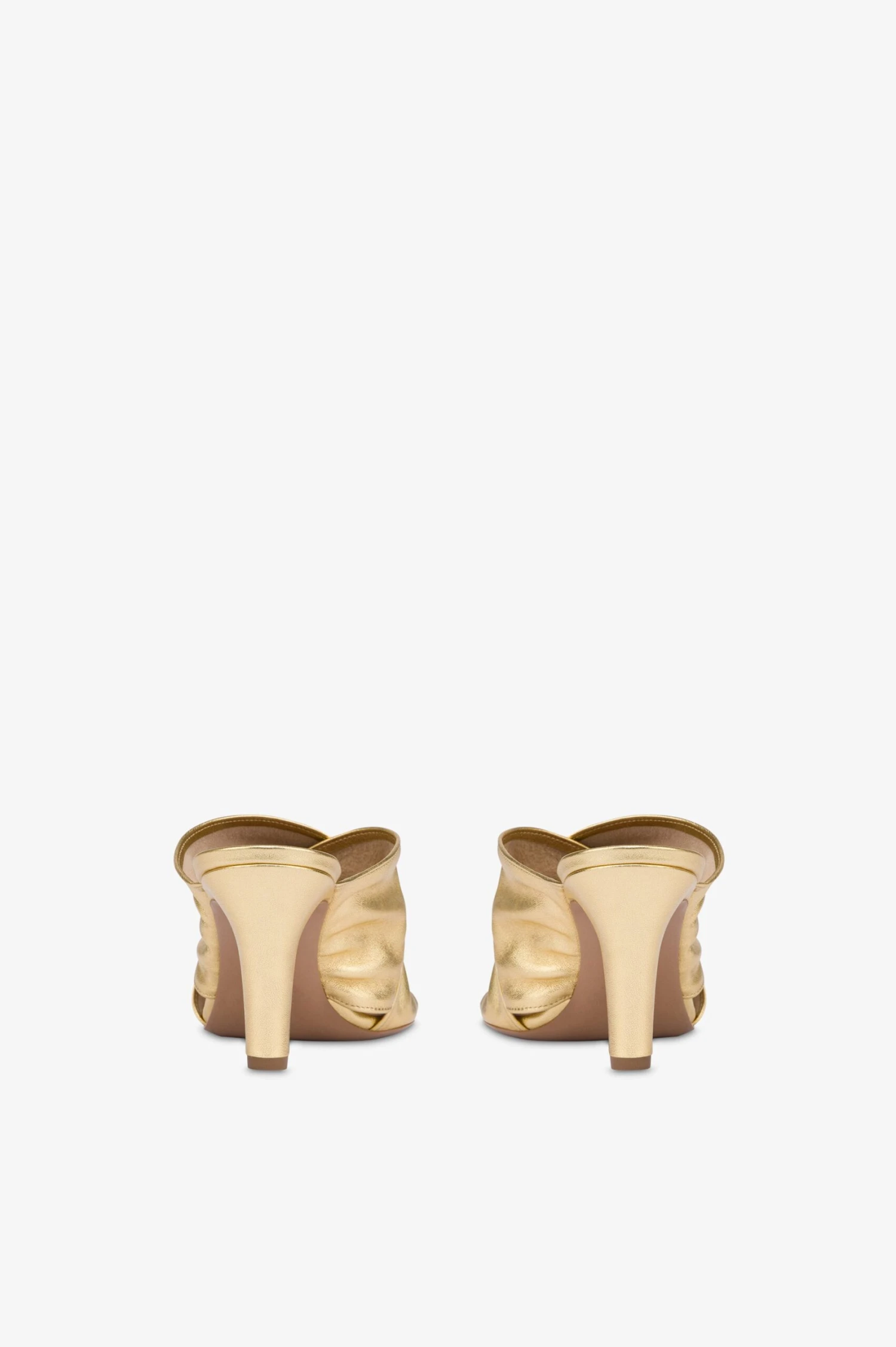 Open-toe mules with a covered chunky heel in gold metallic leather. Made in Italy.
