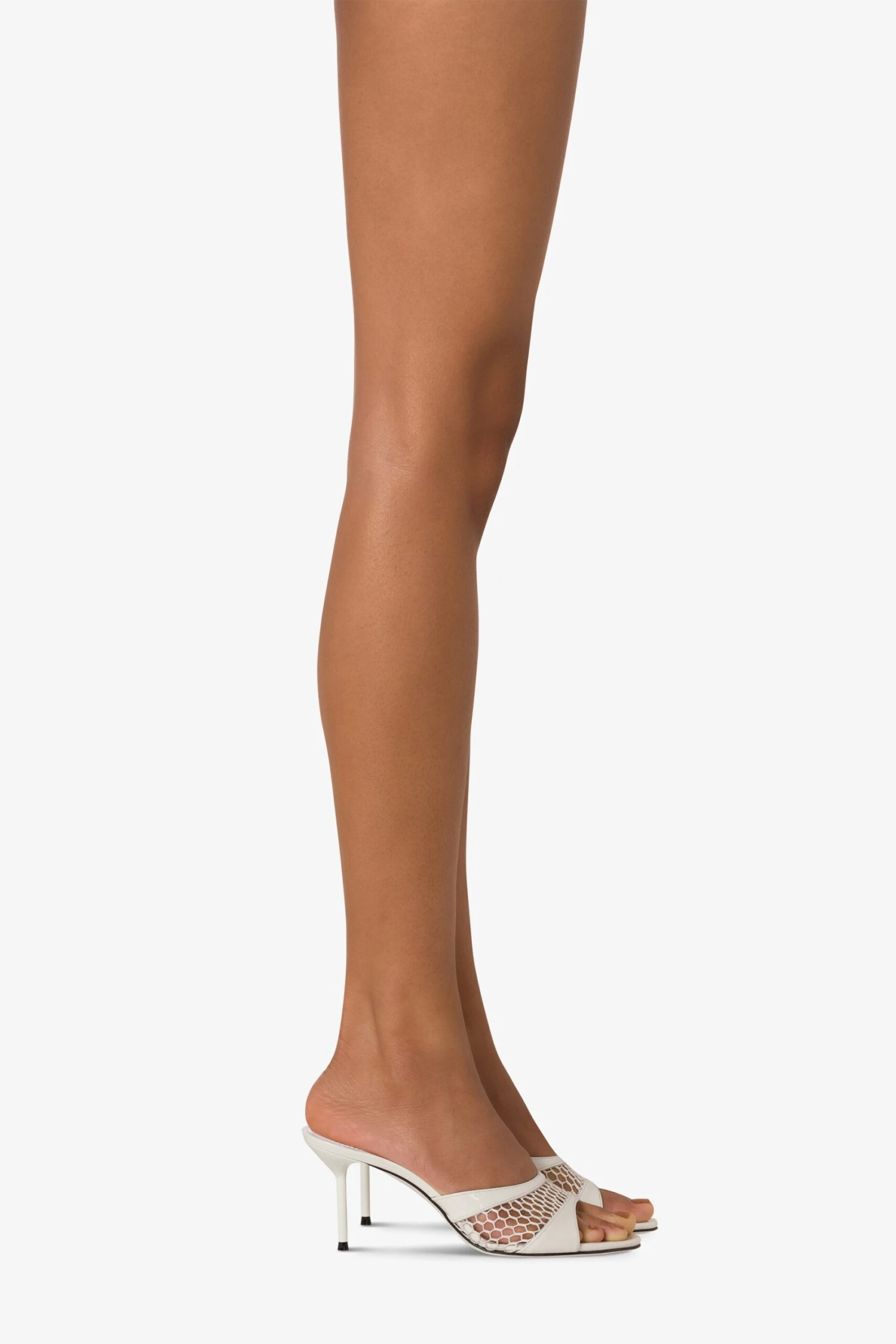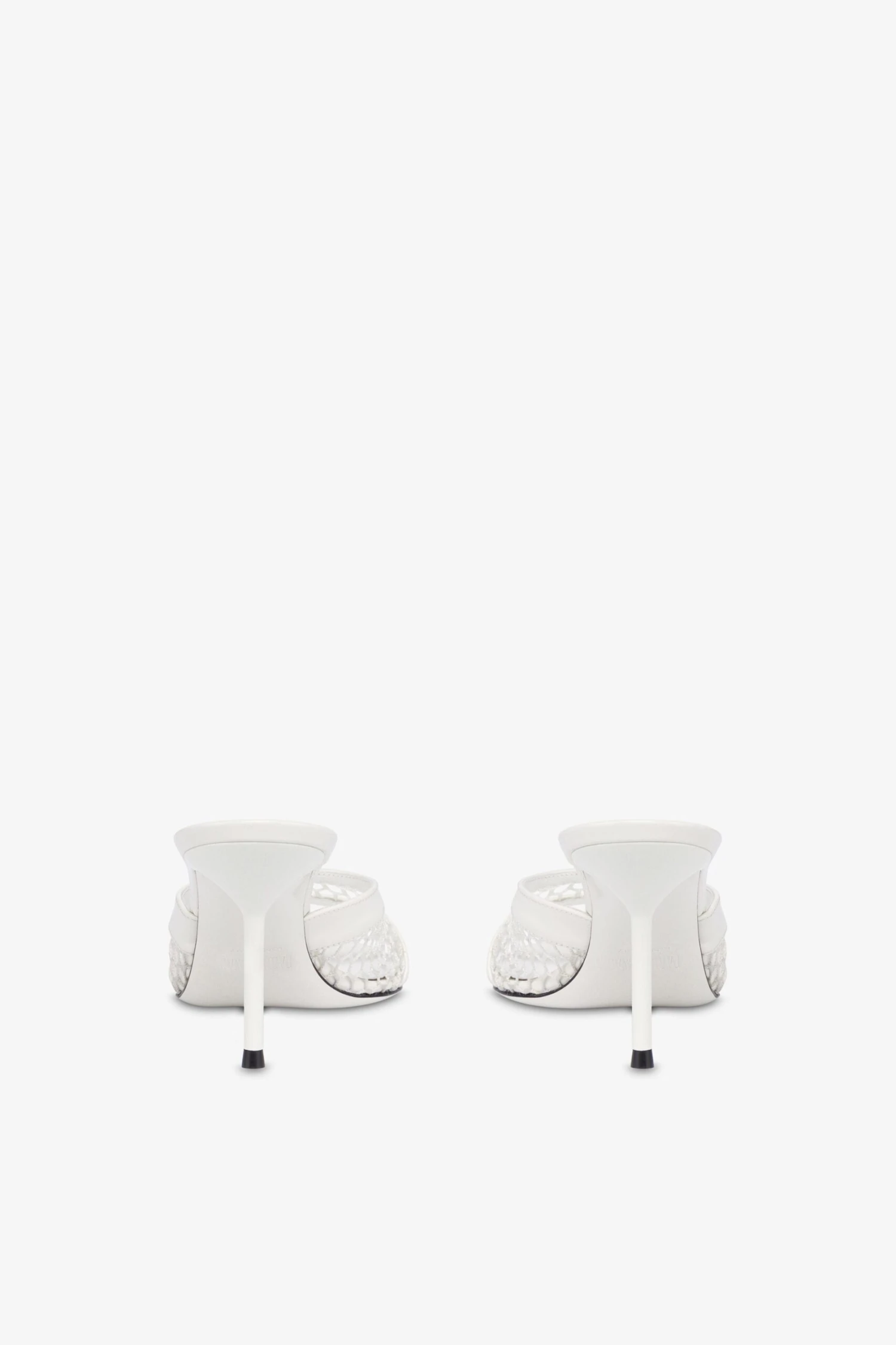 Open-toe mules with a covered pin heel in white mesh and patent leather. Made in Italy.