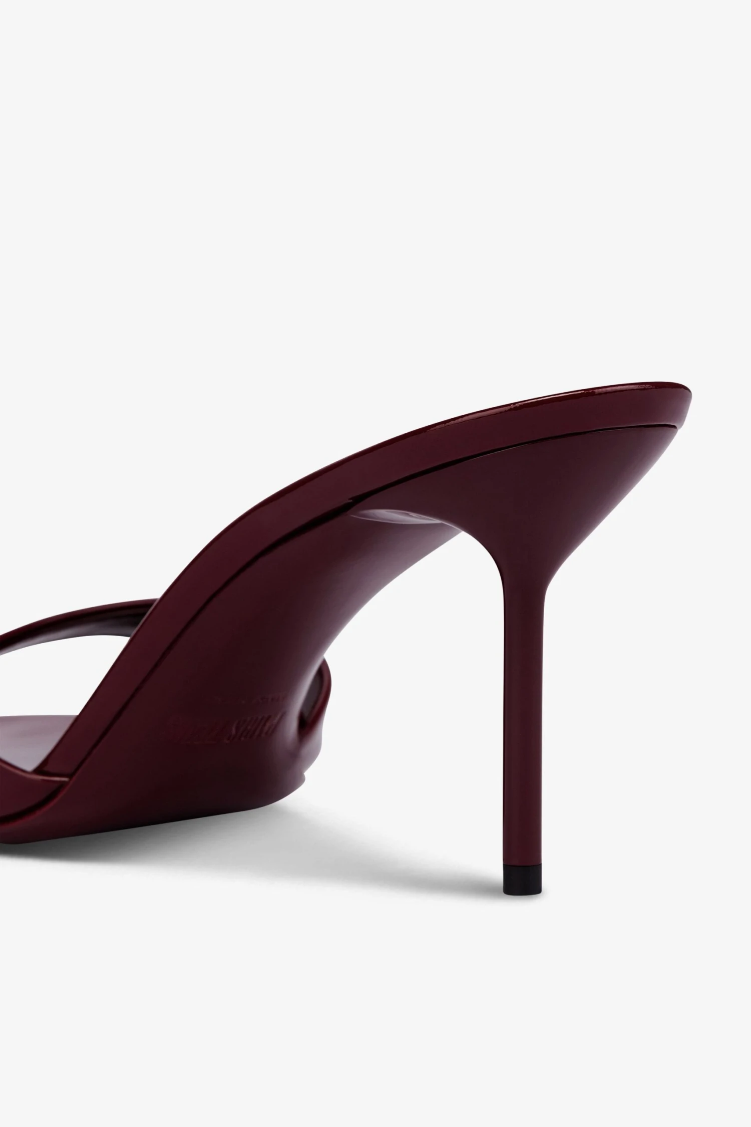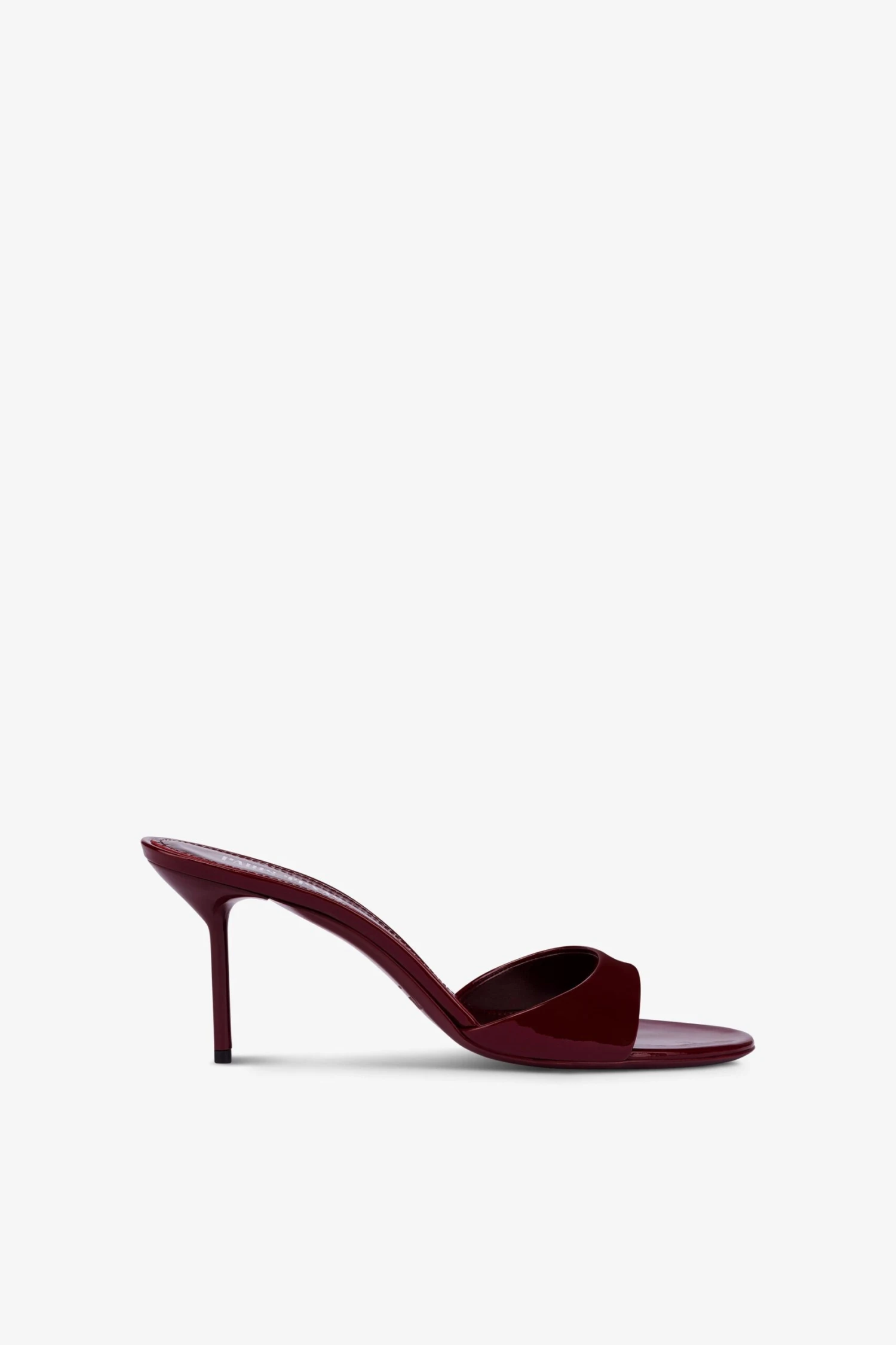 Almond-toe mule set atop a medium pin heel. Available in a patent rouge noir version. Made in Italy from supple leather.