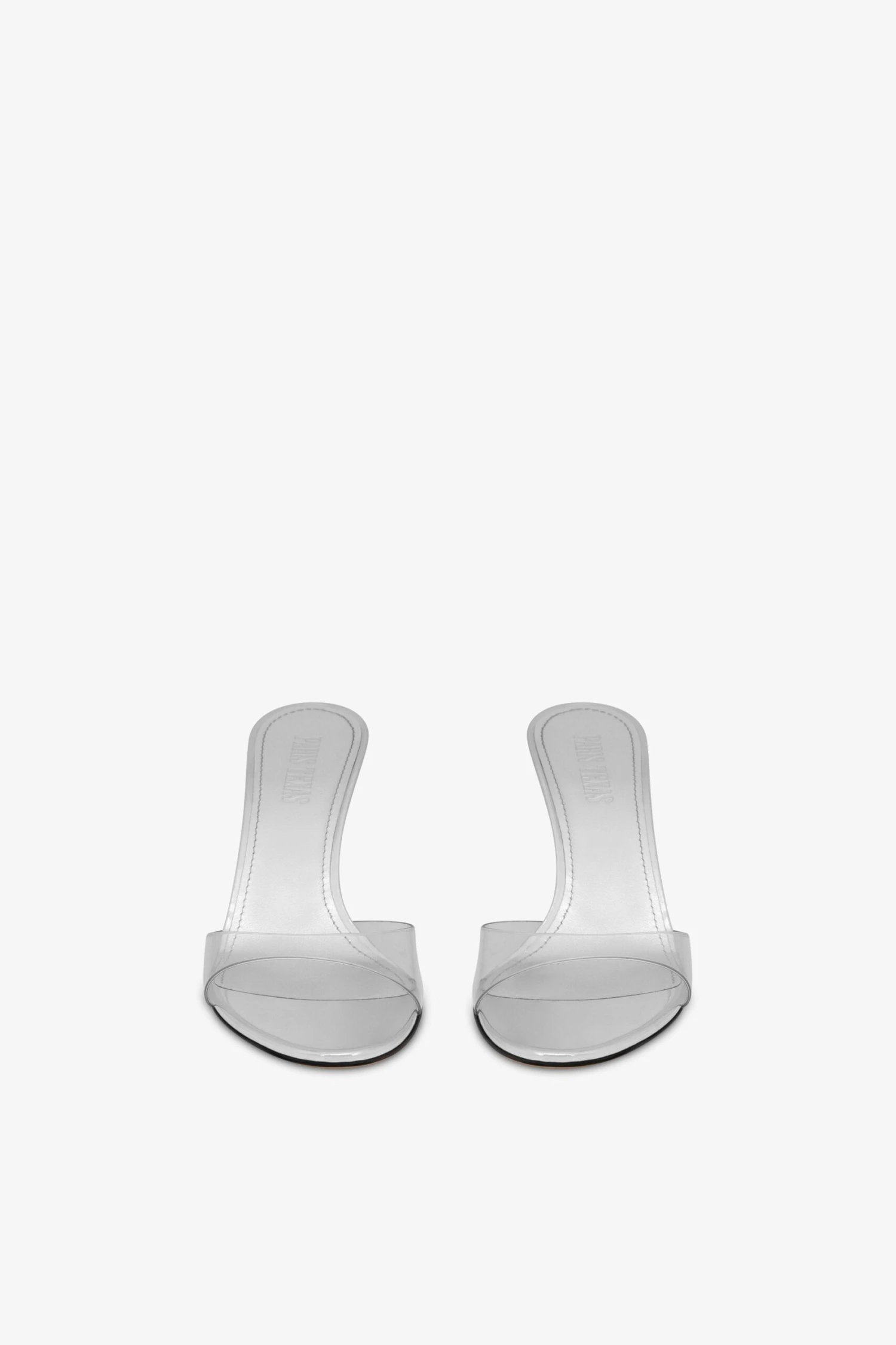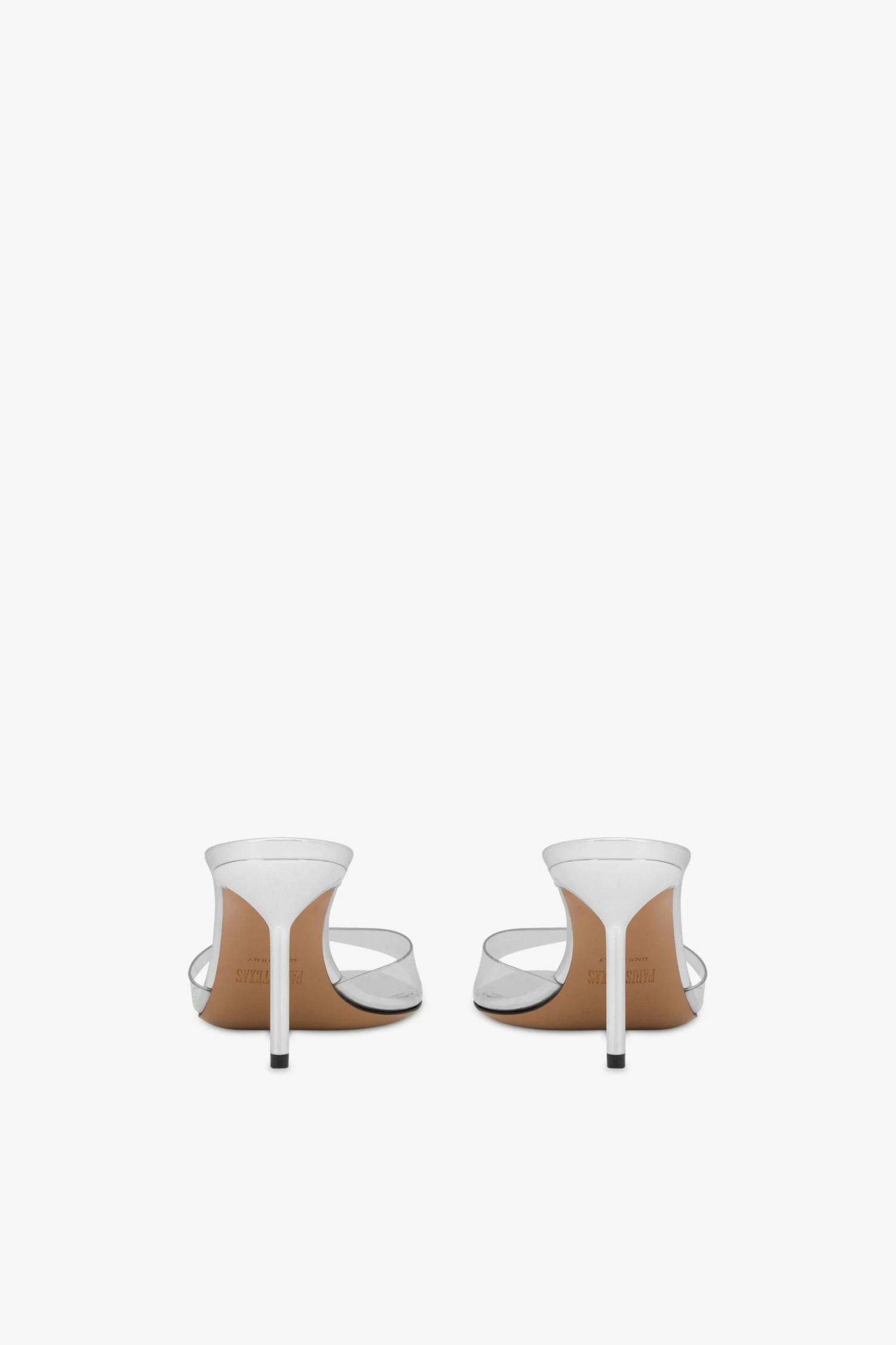 Almond-toe mules set atop a medium pin heel. Available in a silver PVC-mirror version. Made in Italy from supple leather.