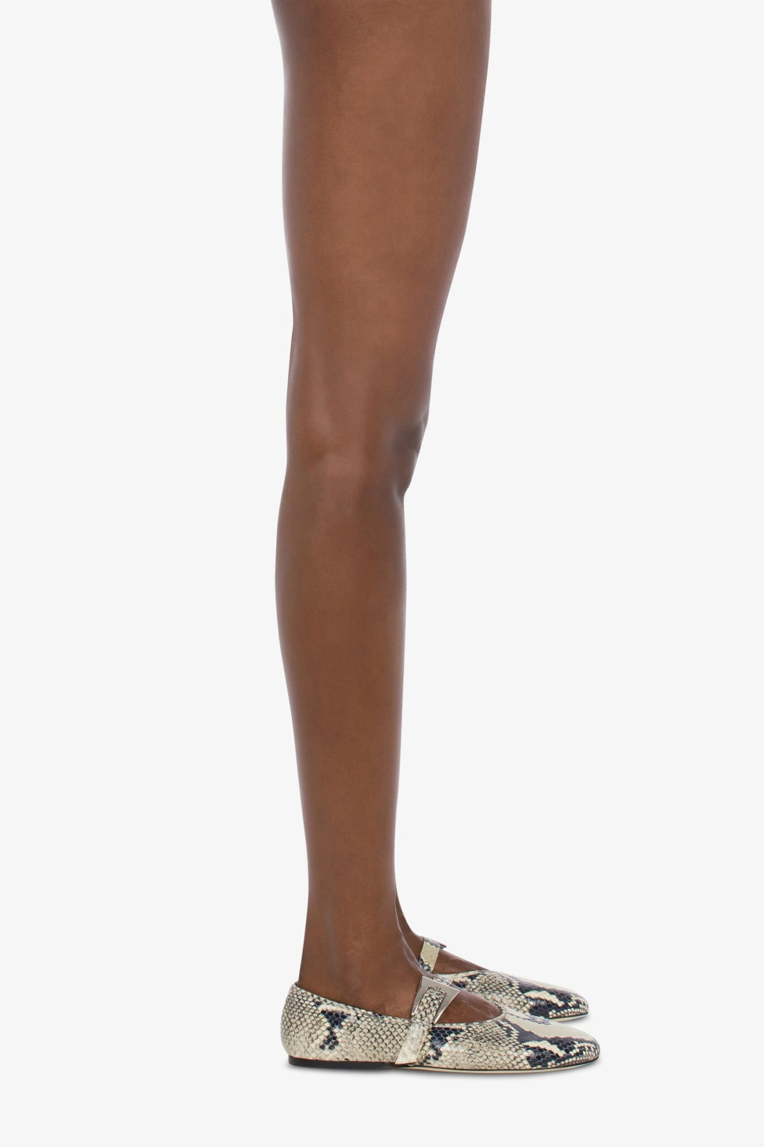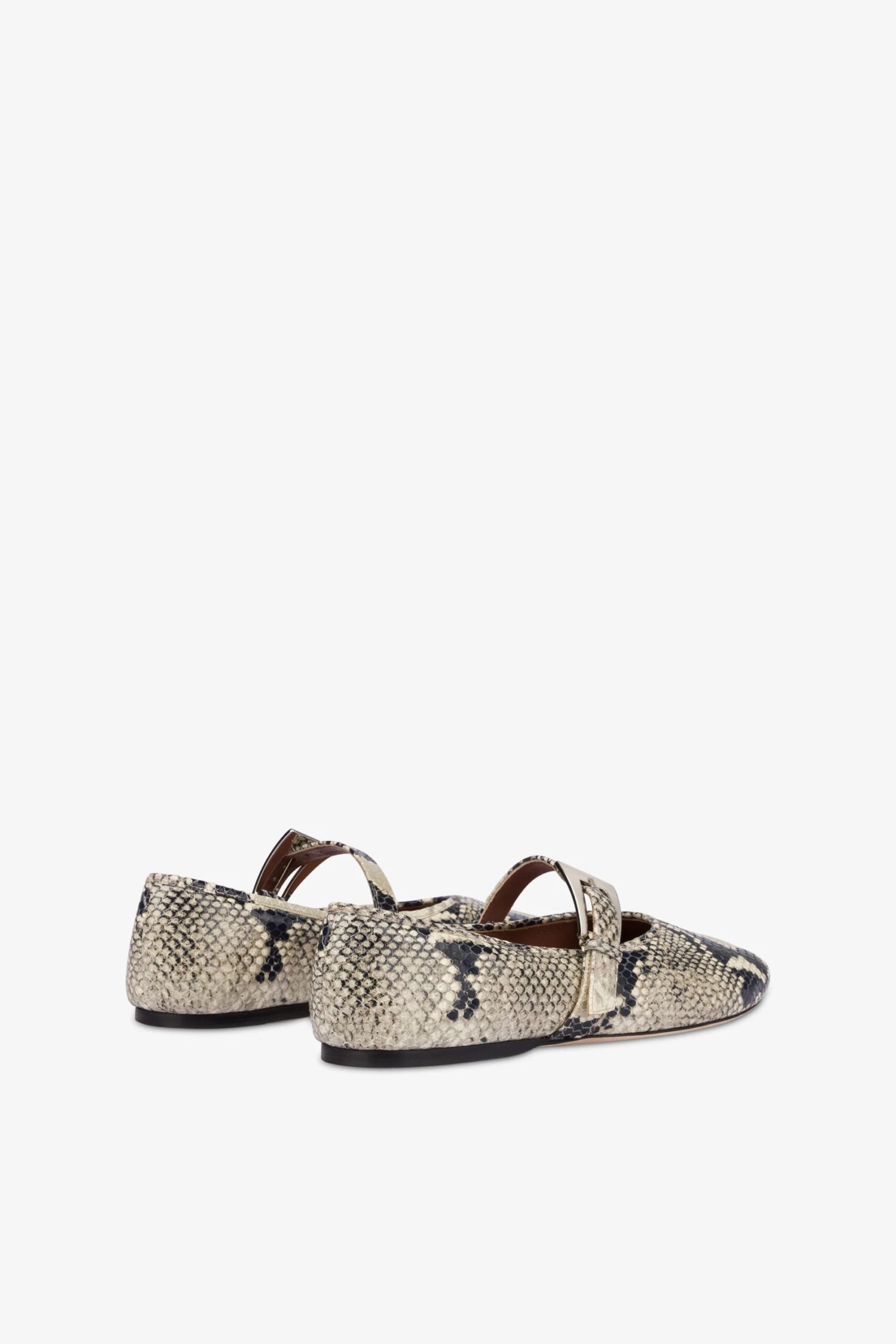 Flat ballet pumps with a round toe and buckle strap. Available in a natural-colored python-printed version. Made in Italy from calfskin leather.