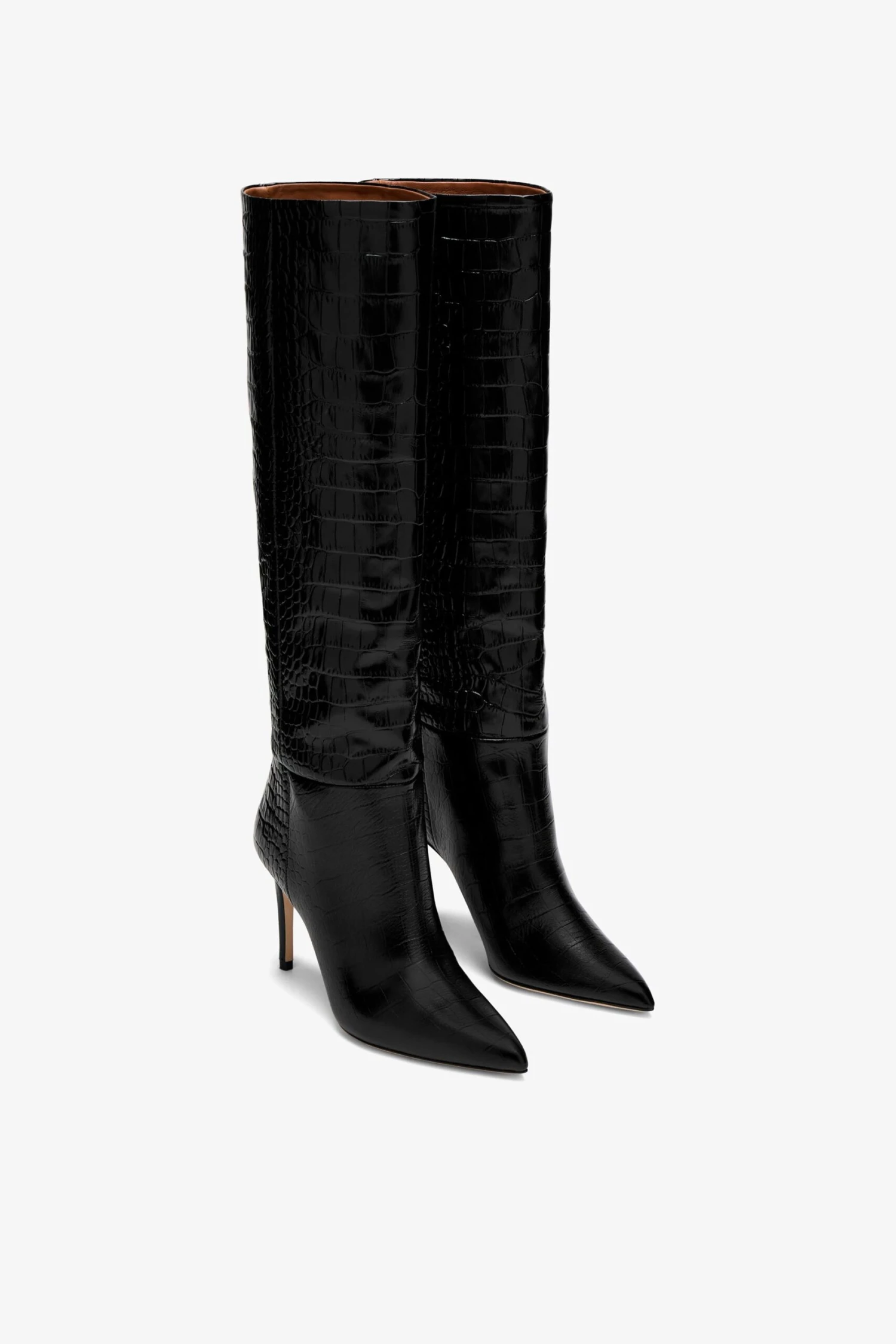 Stiletto boot made from black croc-effect leather. Barrel shaft, pointed toe and thin 85 mm heel.