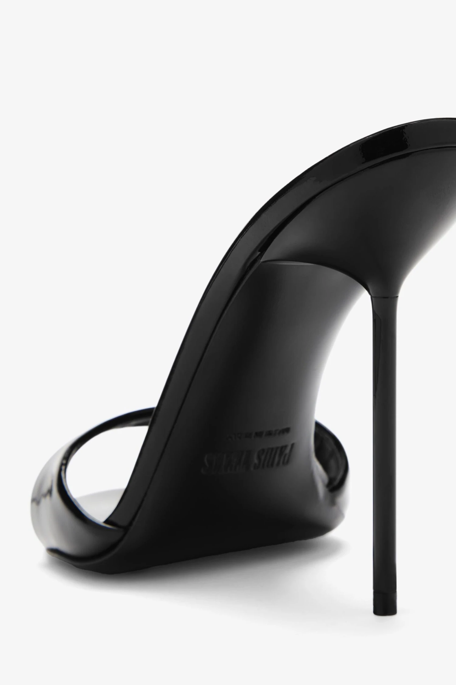 The Lidia mule in black patent leather features a sleek, minimal design with an almond toe and a pin-thin heel.