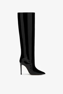 Stiletto boot with barrel shaft, pointed toe and pin-thin 105 mm heel. Made from black patent leather.