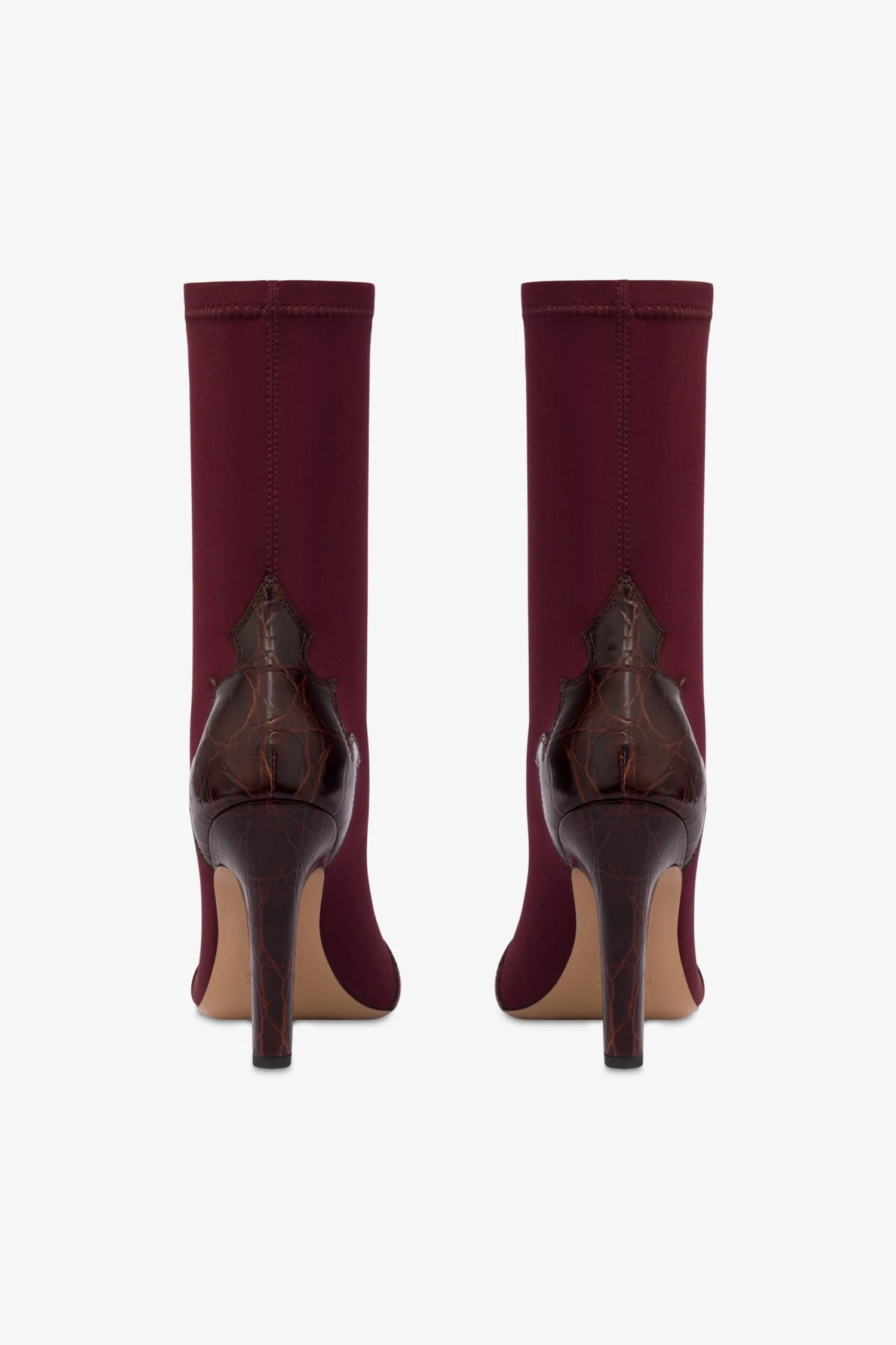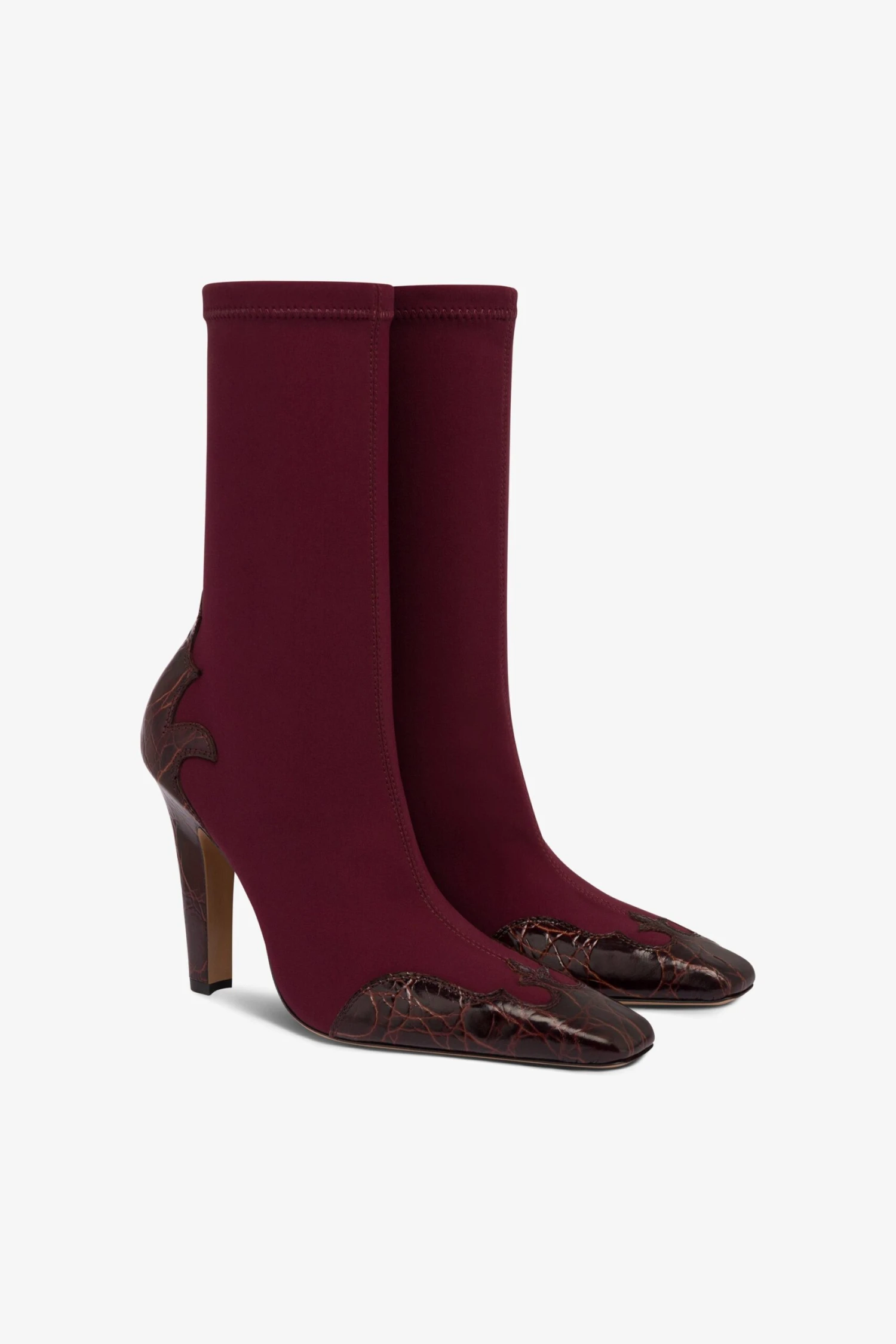 Square-toe boots in burgundy stretchy fabric with a chunky heel and croco-embossed embroidery on the toe and heel. Made in Italy.
