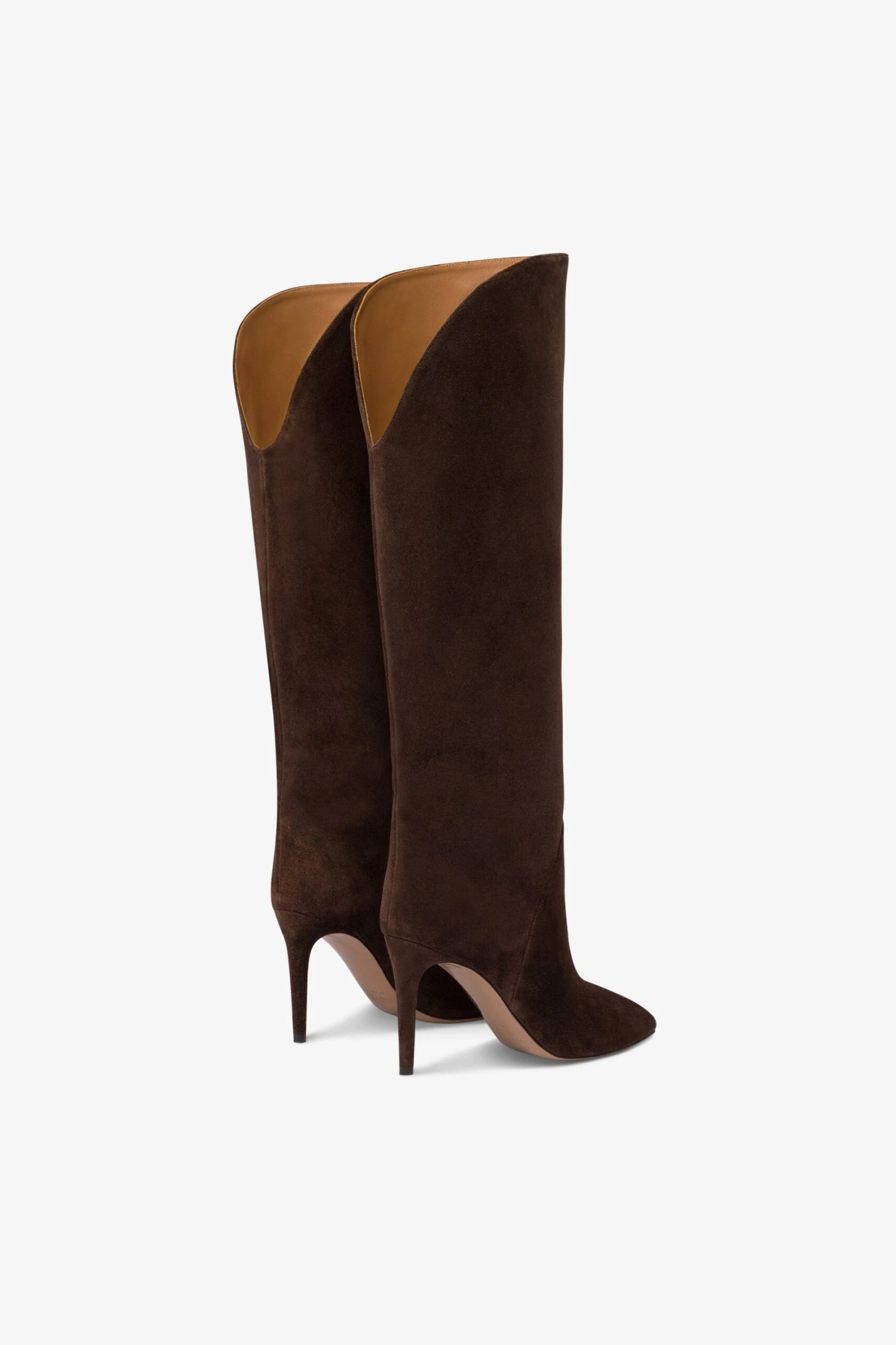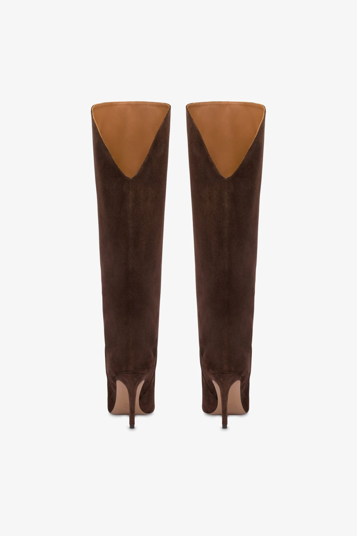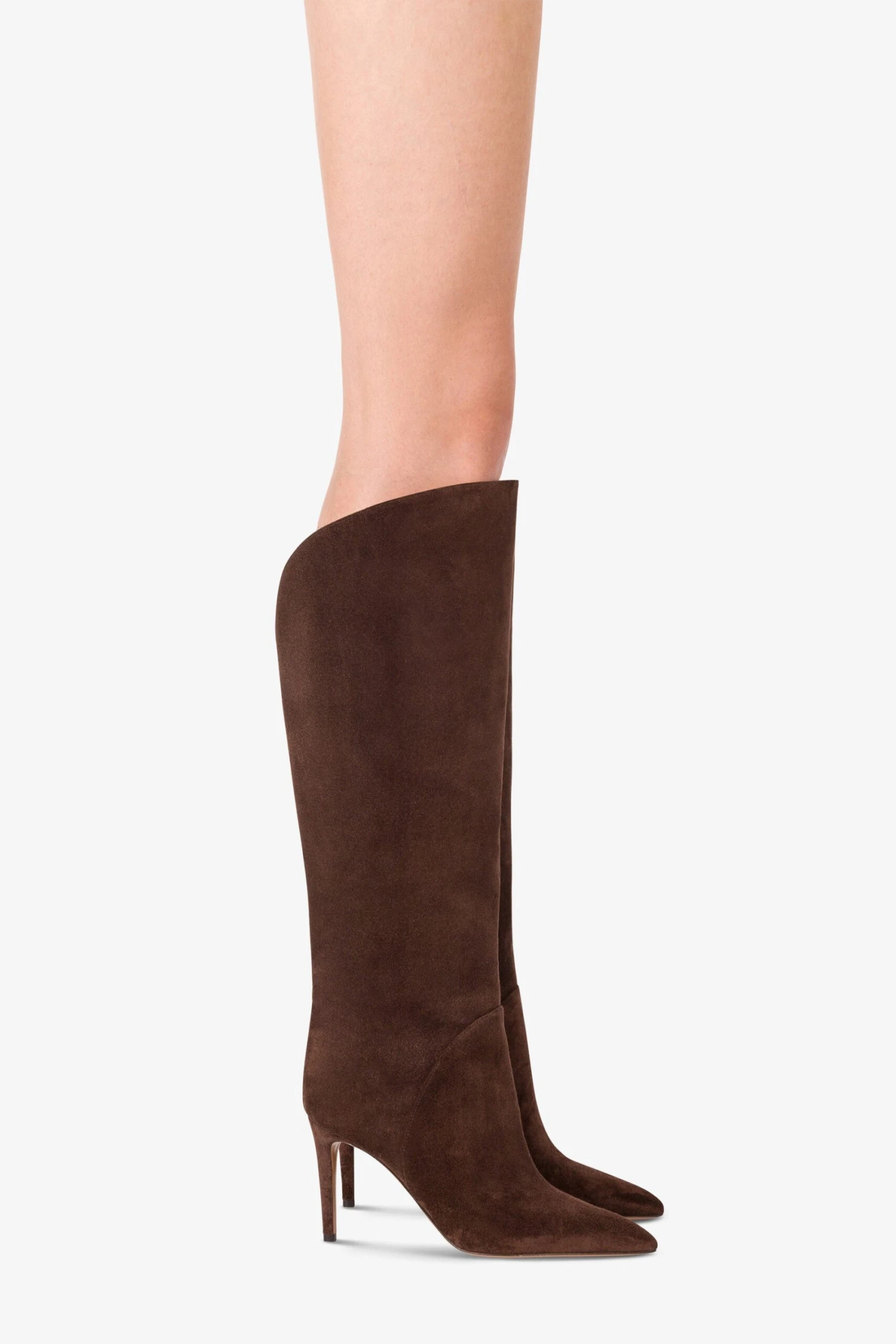 Pointed-toe boots in pepper suede leather with suede-covered stiletto heel. Made in Italy.