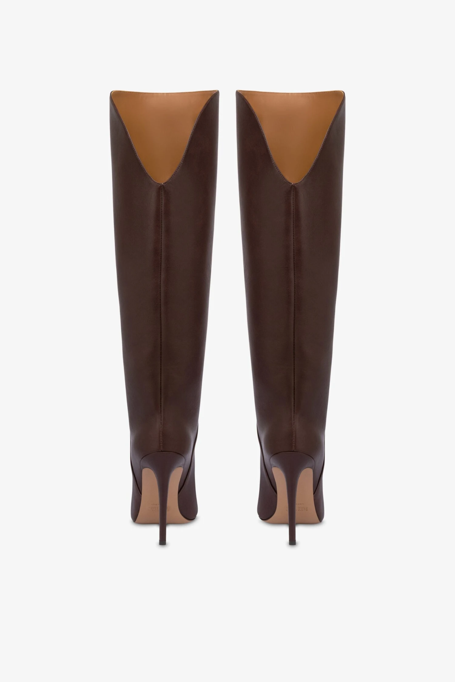 Pointed-toe boots in mocha leather with a leather-covered stiletto heel. Made in Italy.