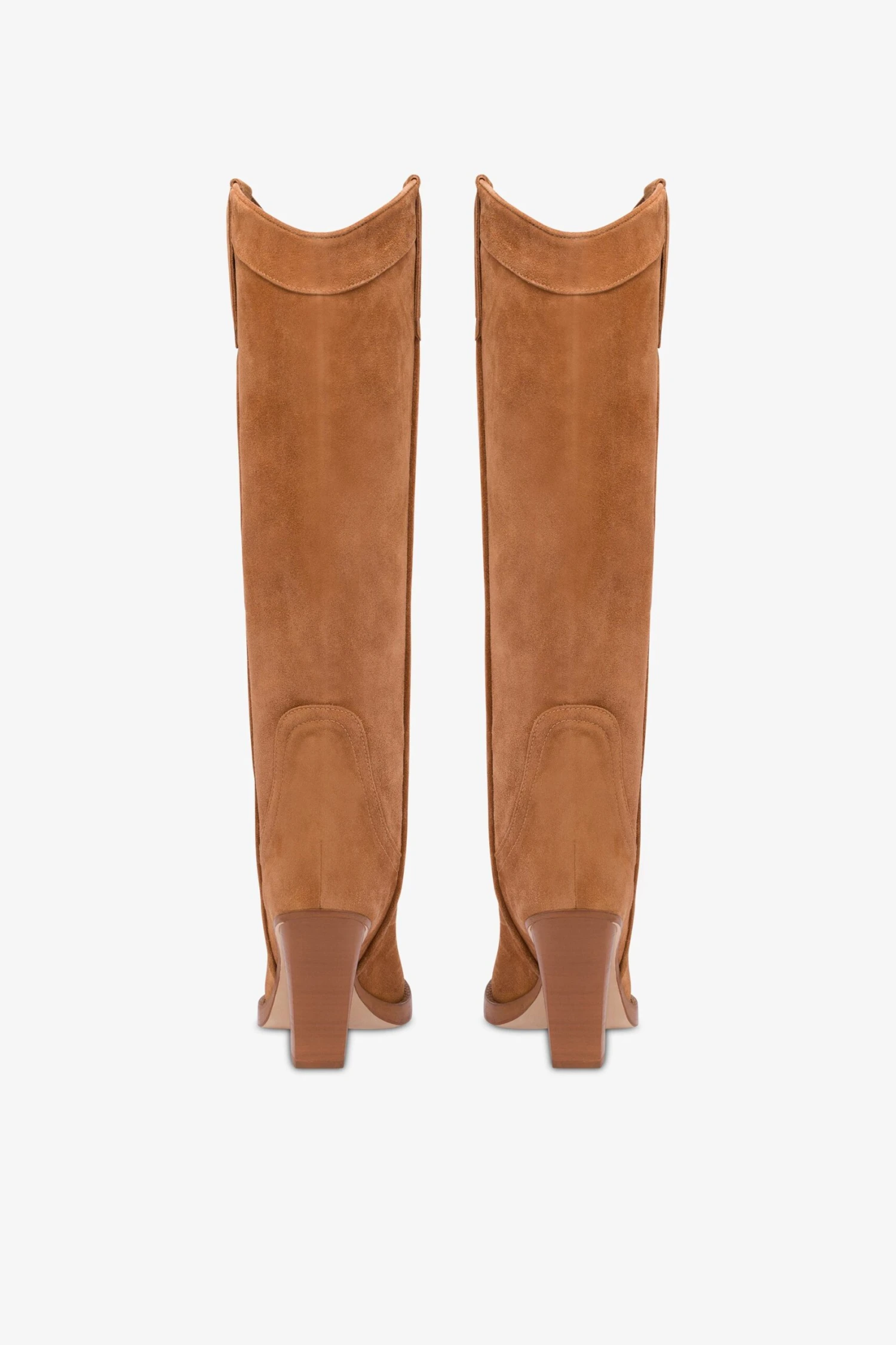 Pointed-toe boots with a rubber heel and metal toe cap in terracotta suede leather. Made in Italy.
