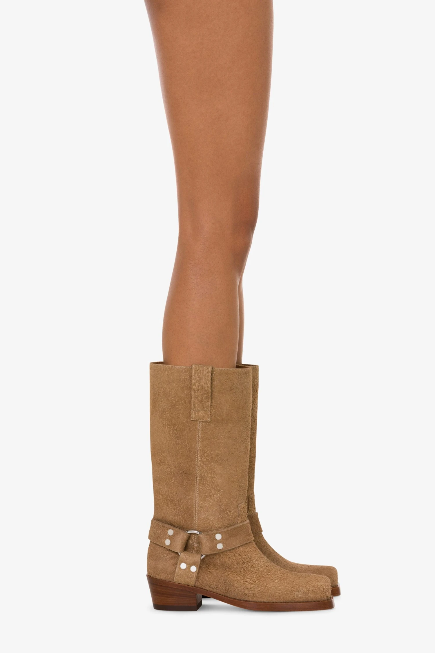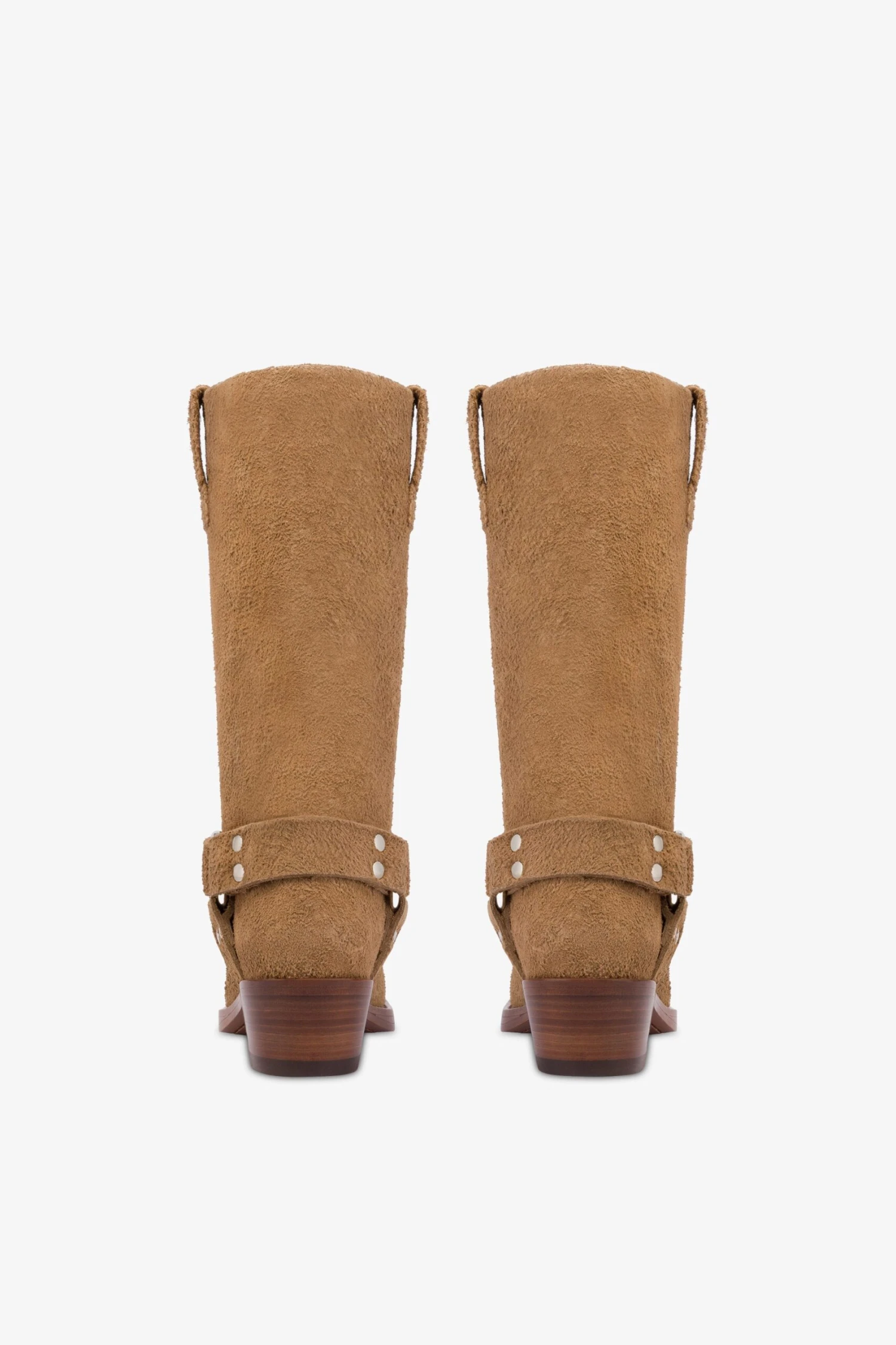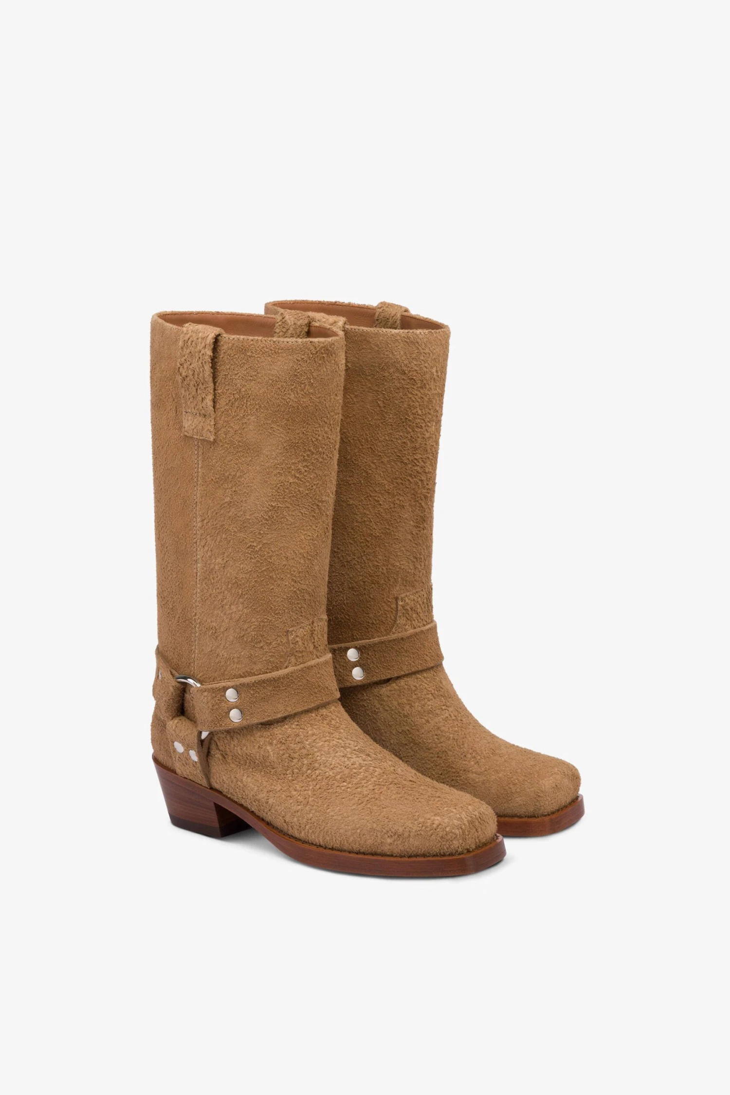 Square-toe boots in tobacco suede leather with a strap and metal ring detail. Made in Italy.