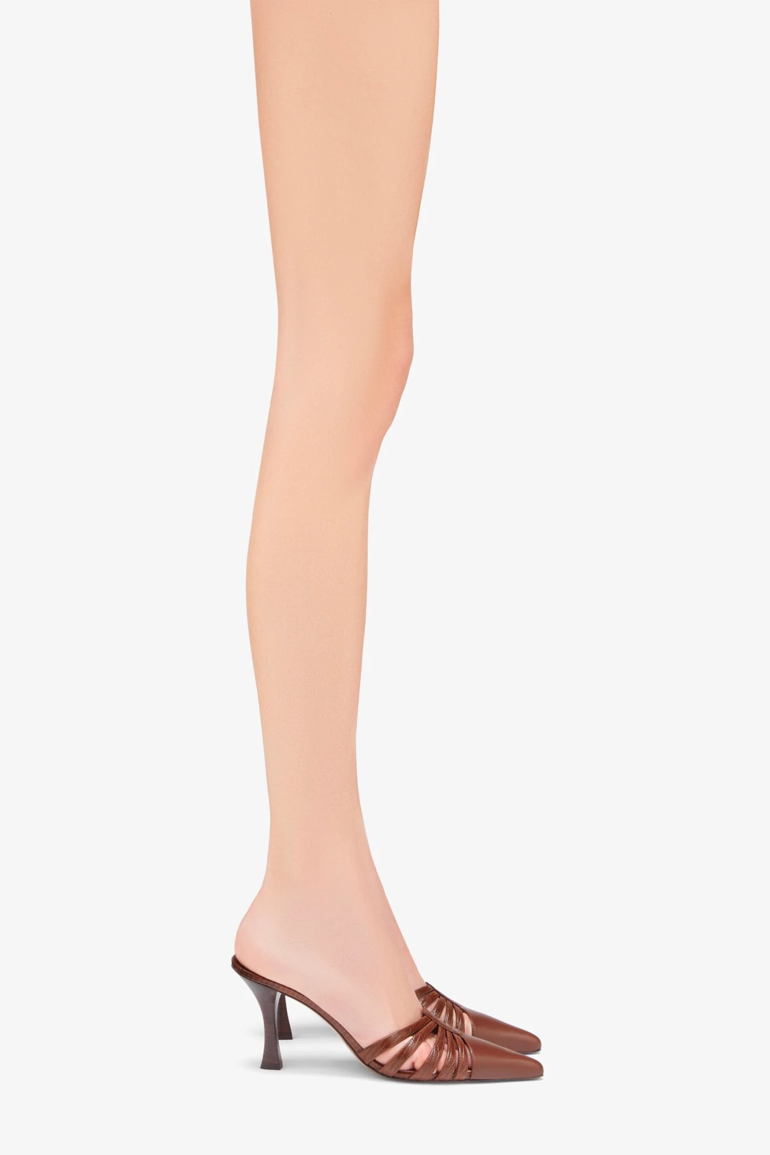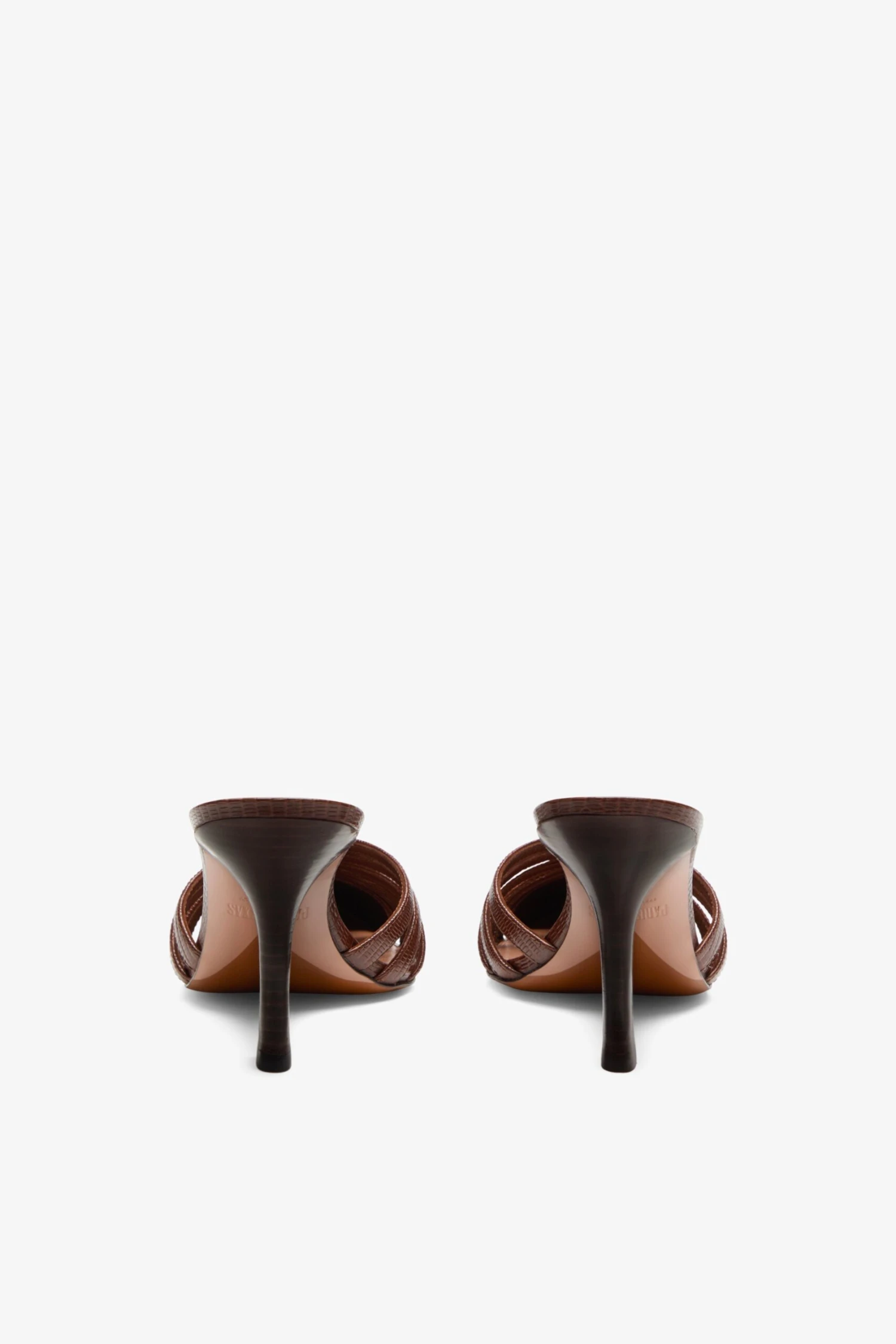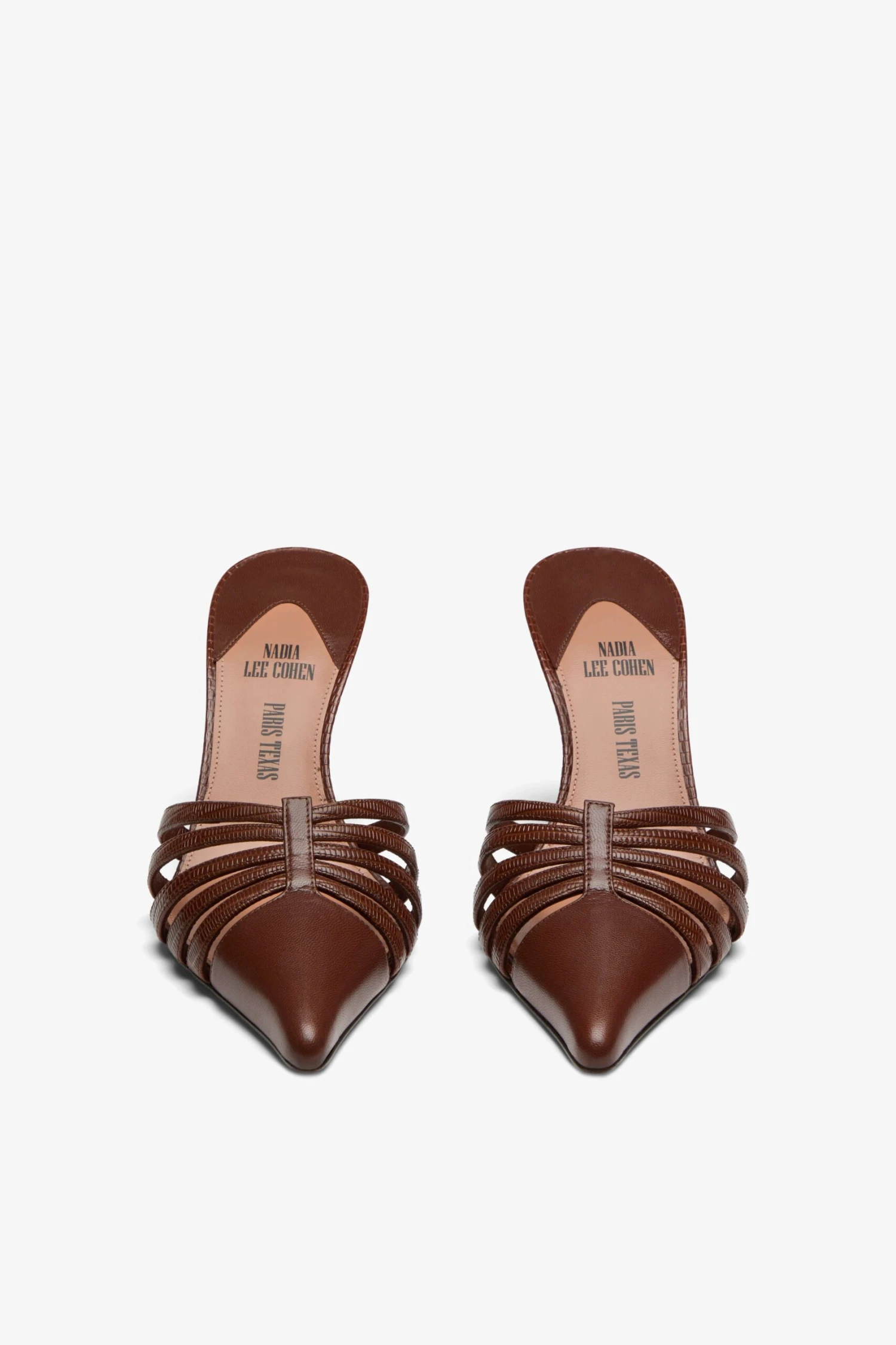 The Nadia mule in brown lizard-embossed leather is an emblem of effortless summer elegance featuring a cutout upper, pointed toe and flared heel.