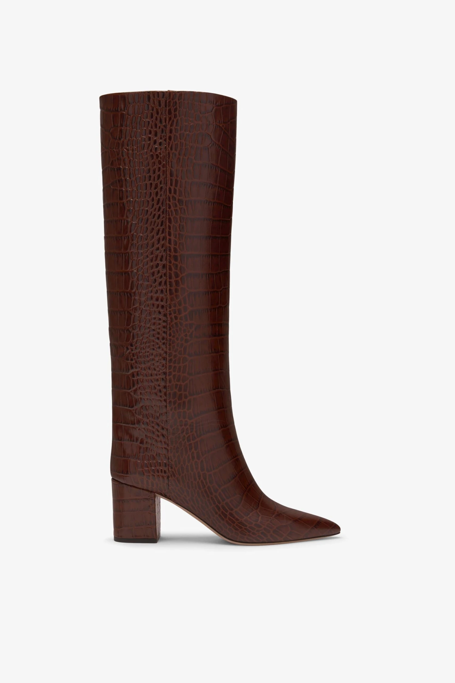 Anja knee-high boot with pointed toe and chunky 70 mm heel. Crafted in chocolate brown croc-effect leather.