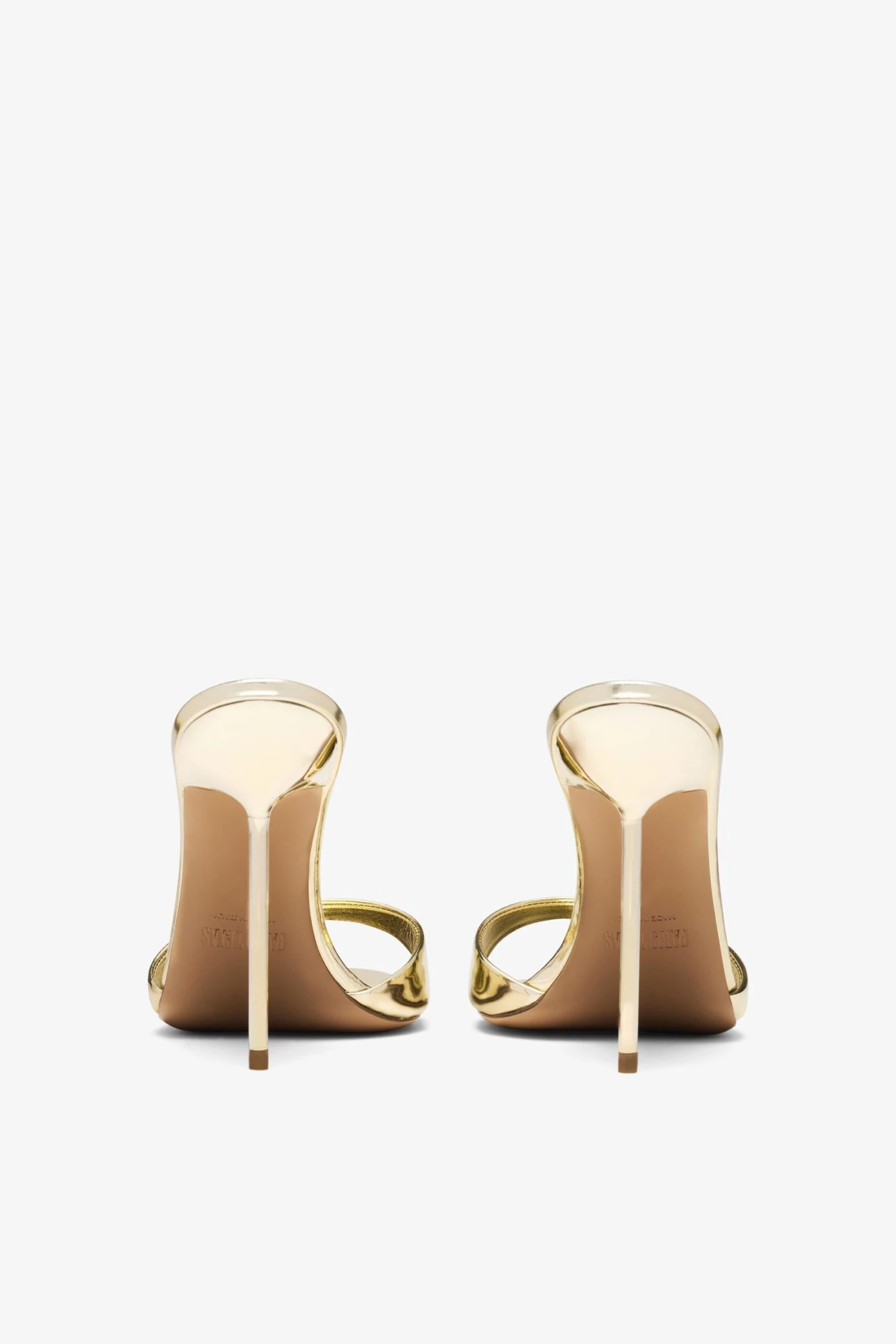 The Lidia mule in mirrored gold leather features a pin-thin high heel and open toe adding shine to any occasion.