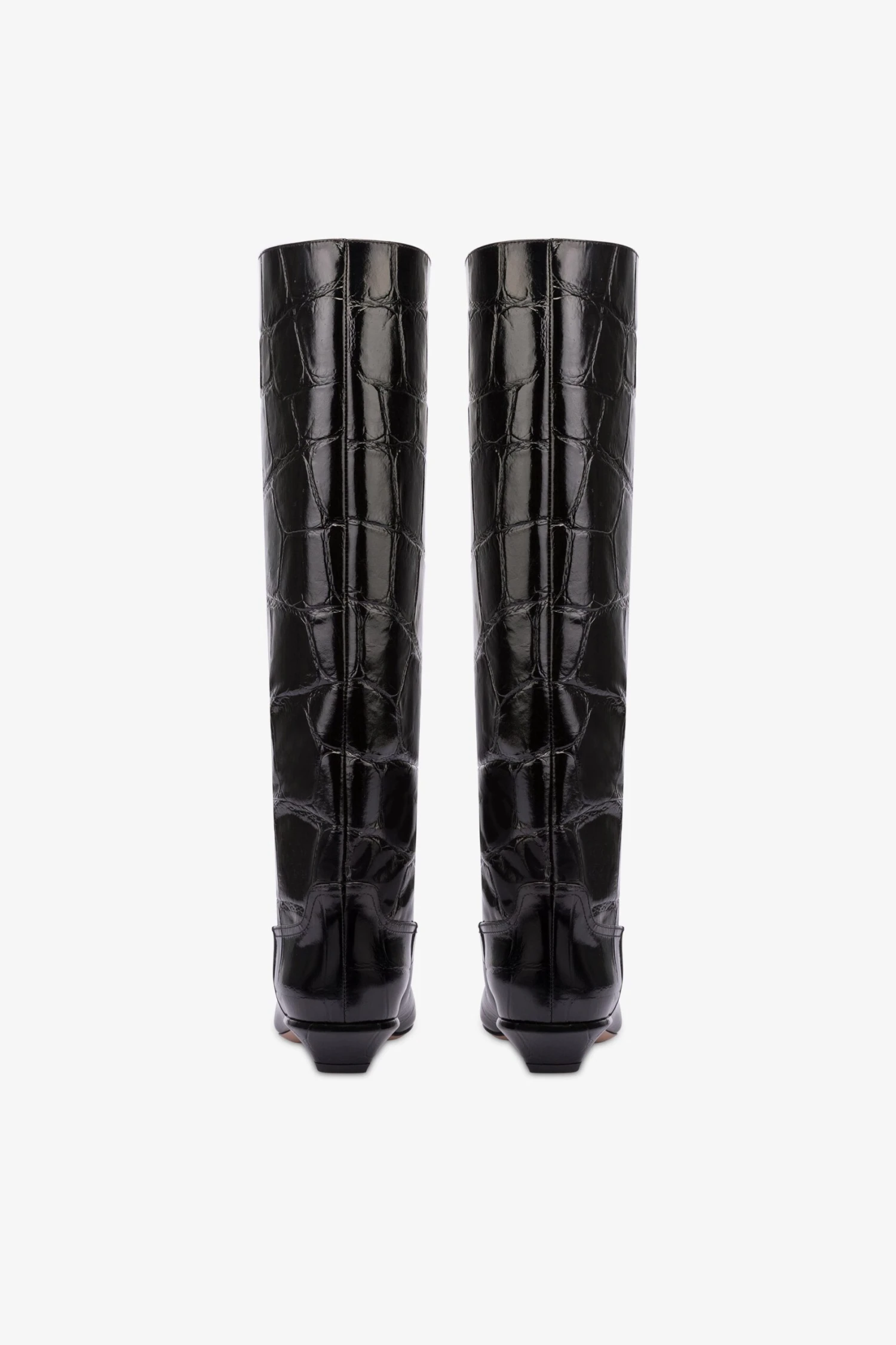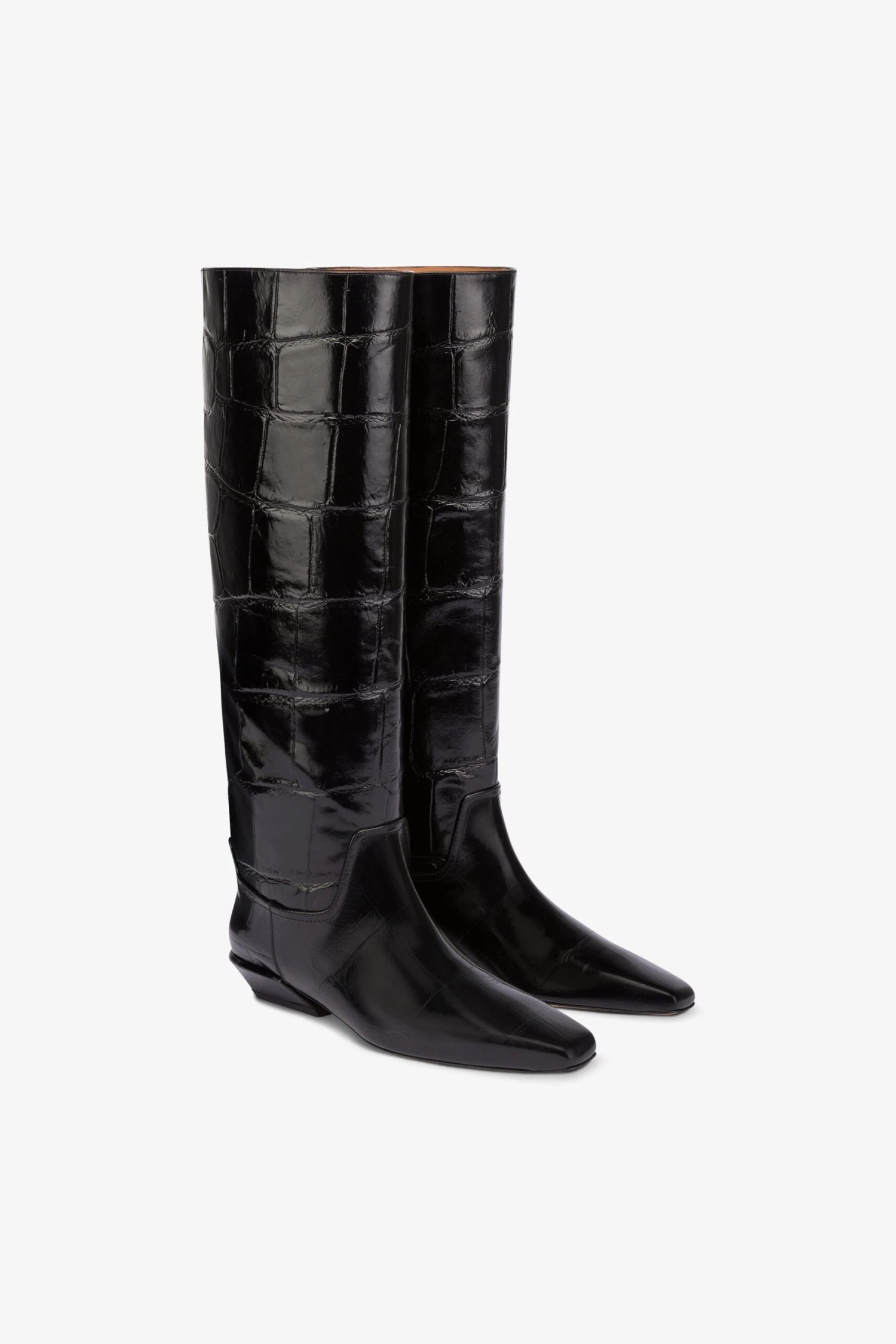 Knee-high boots with a long, pointed toe set atop a small riding heel. Available in a black croco-embossed version. Made in Italy from calfskin leather.