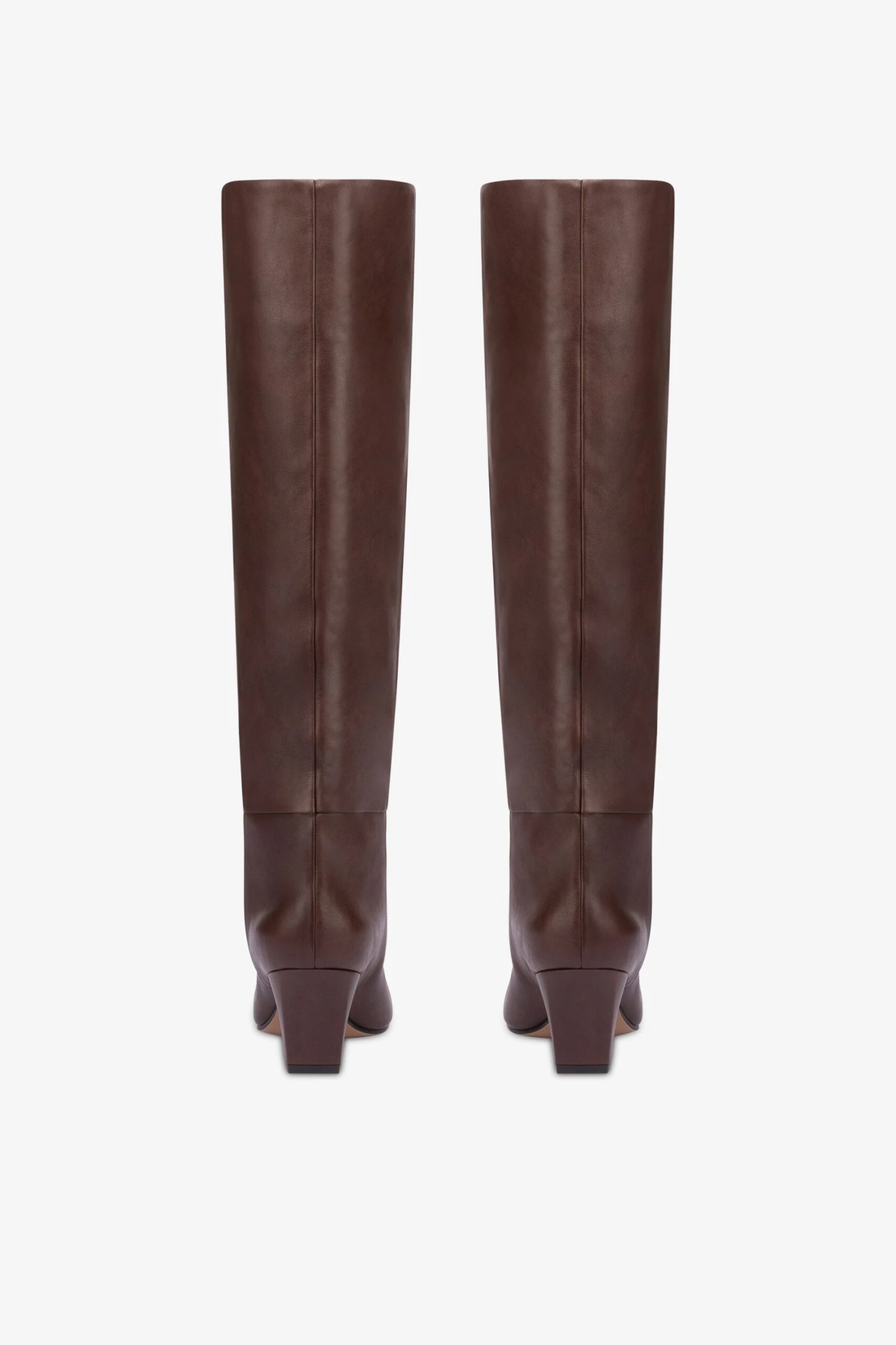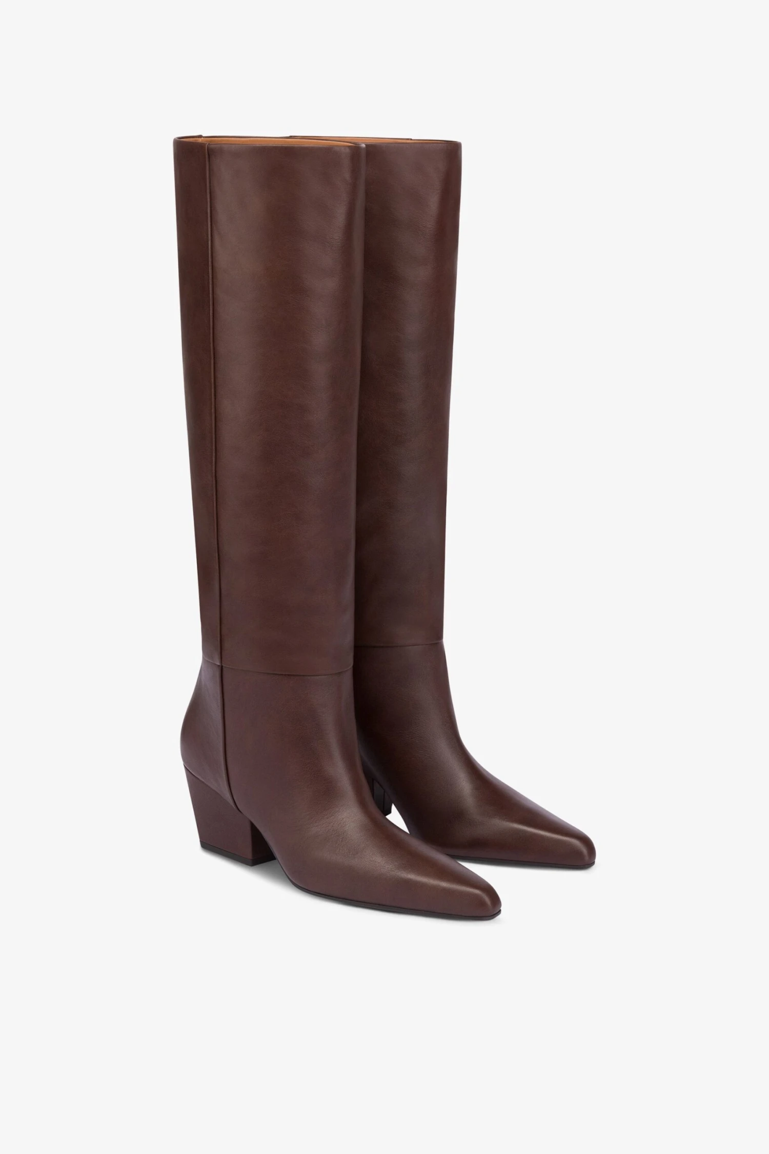 Knee-high boots with a long pointed toe set atop a low covered walking heel. Available in a smooth mocha version. Made in Italy from supple leather.