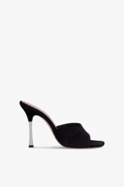Open-toe mules in black suede leather with a silver galvanzied heel. Made in Italy.