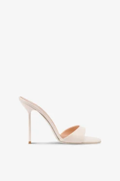Open-toe mules with a covered pin heel in ivory patent leather. Made in Italy.