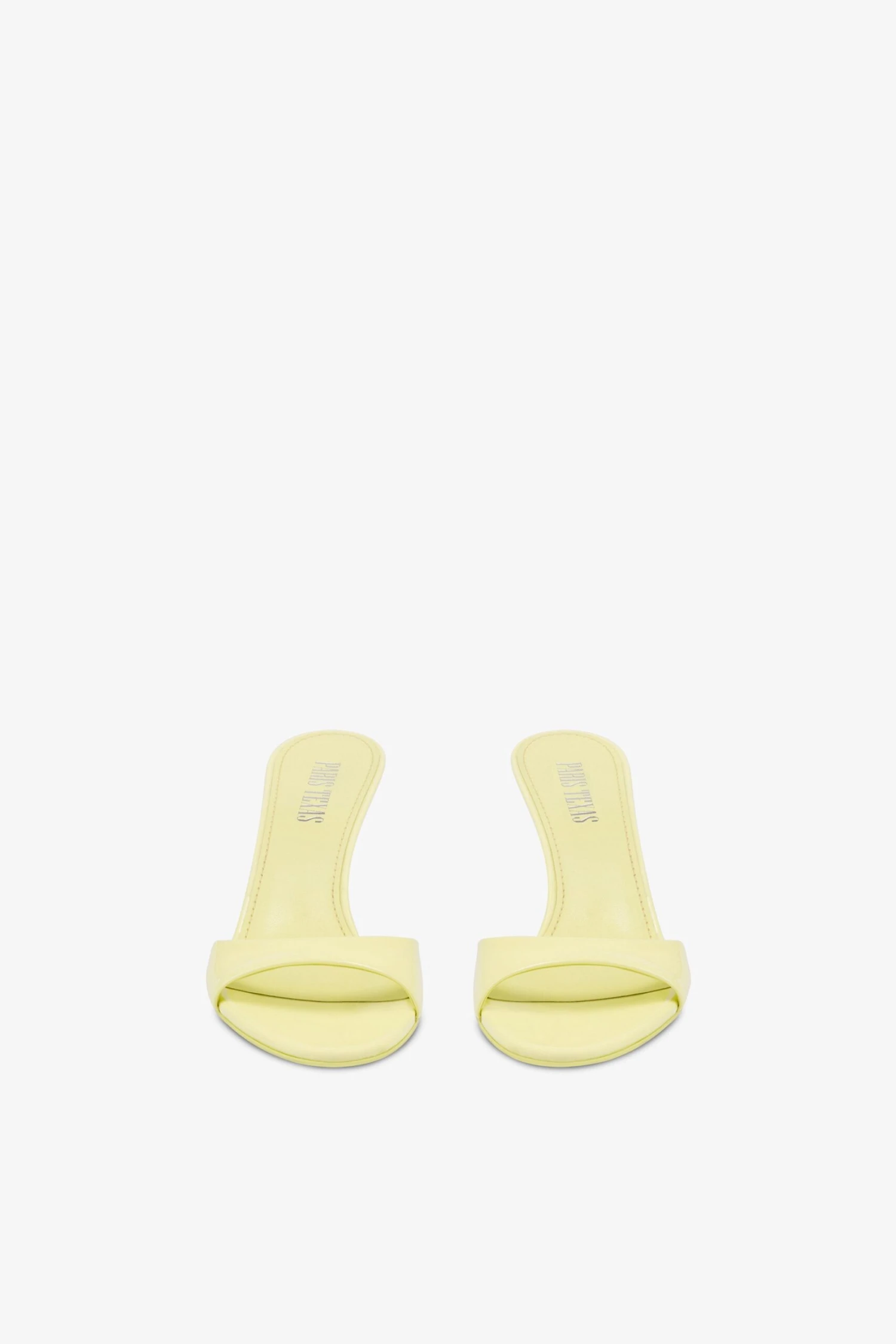 Open-toe mules with a covered pin heel in light yellow patent leather. Made in Italy.