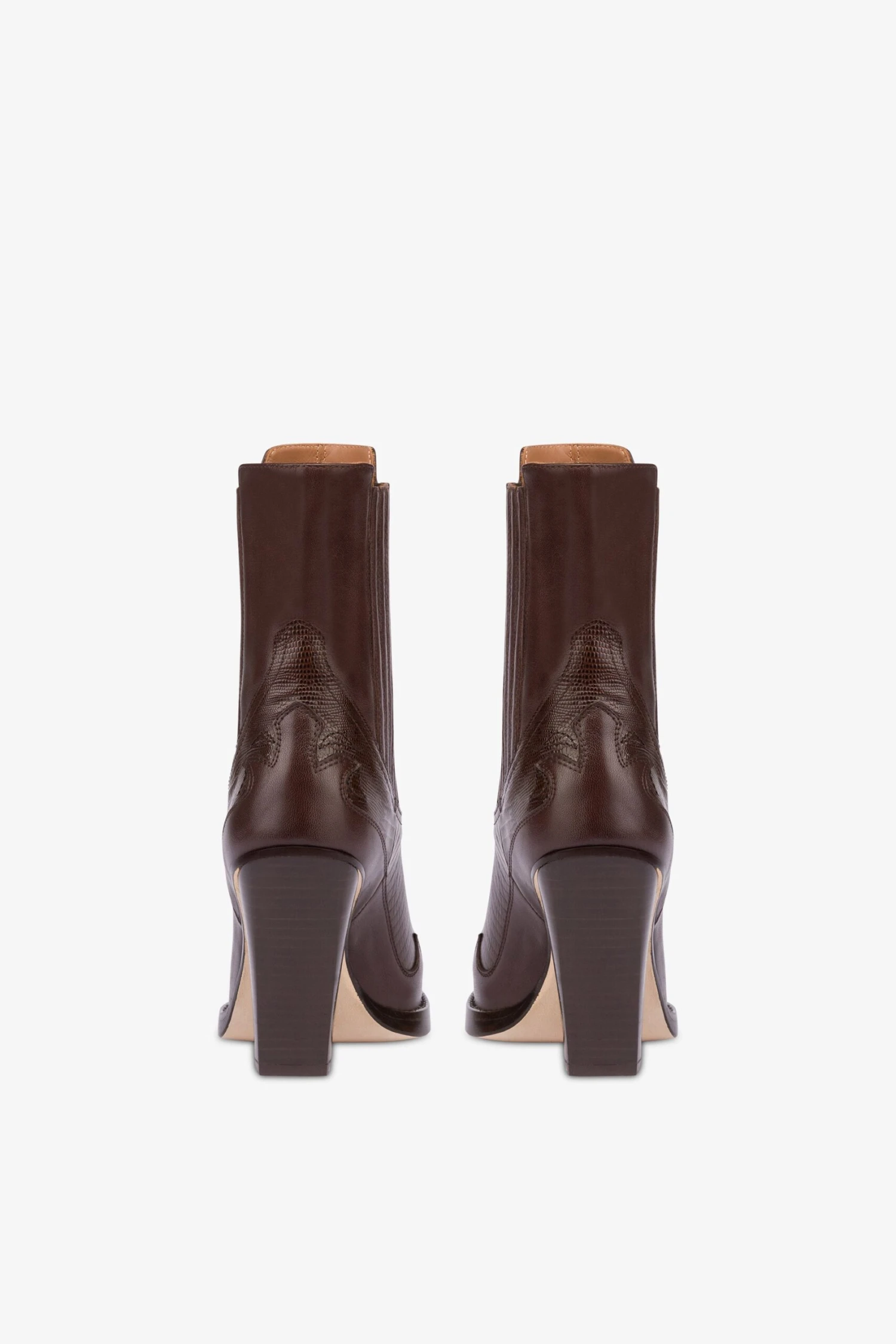Pointed ankle boots with a square toe set atop a medium walking heel. Available in an embroidered chocolate and mocha lizard-printed version with side inserts. Made in Italy from calfskin leather.
