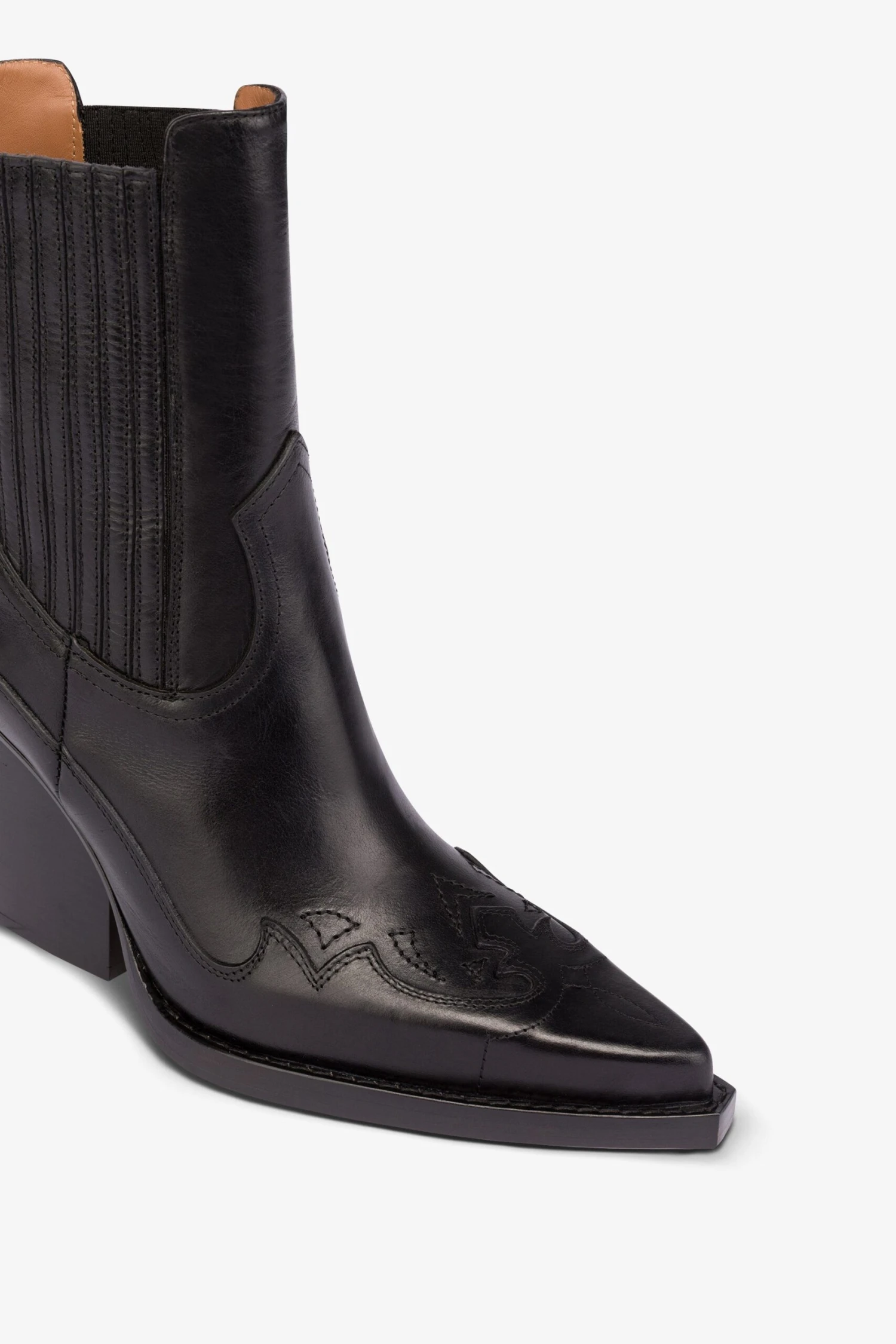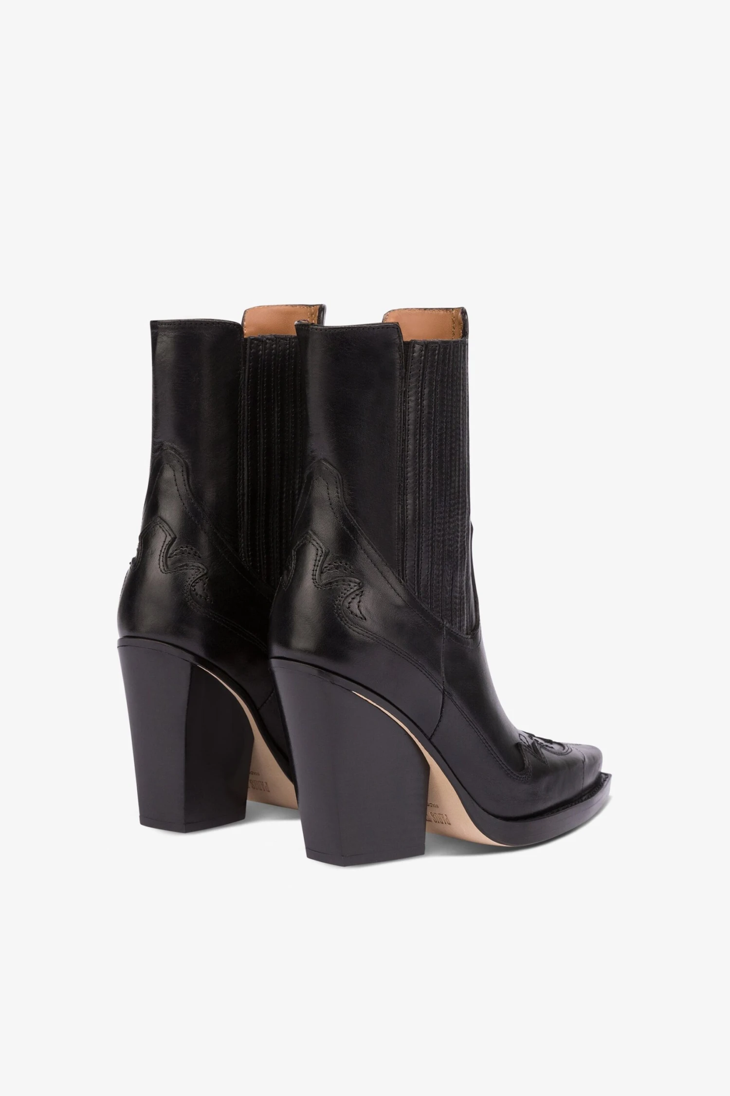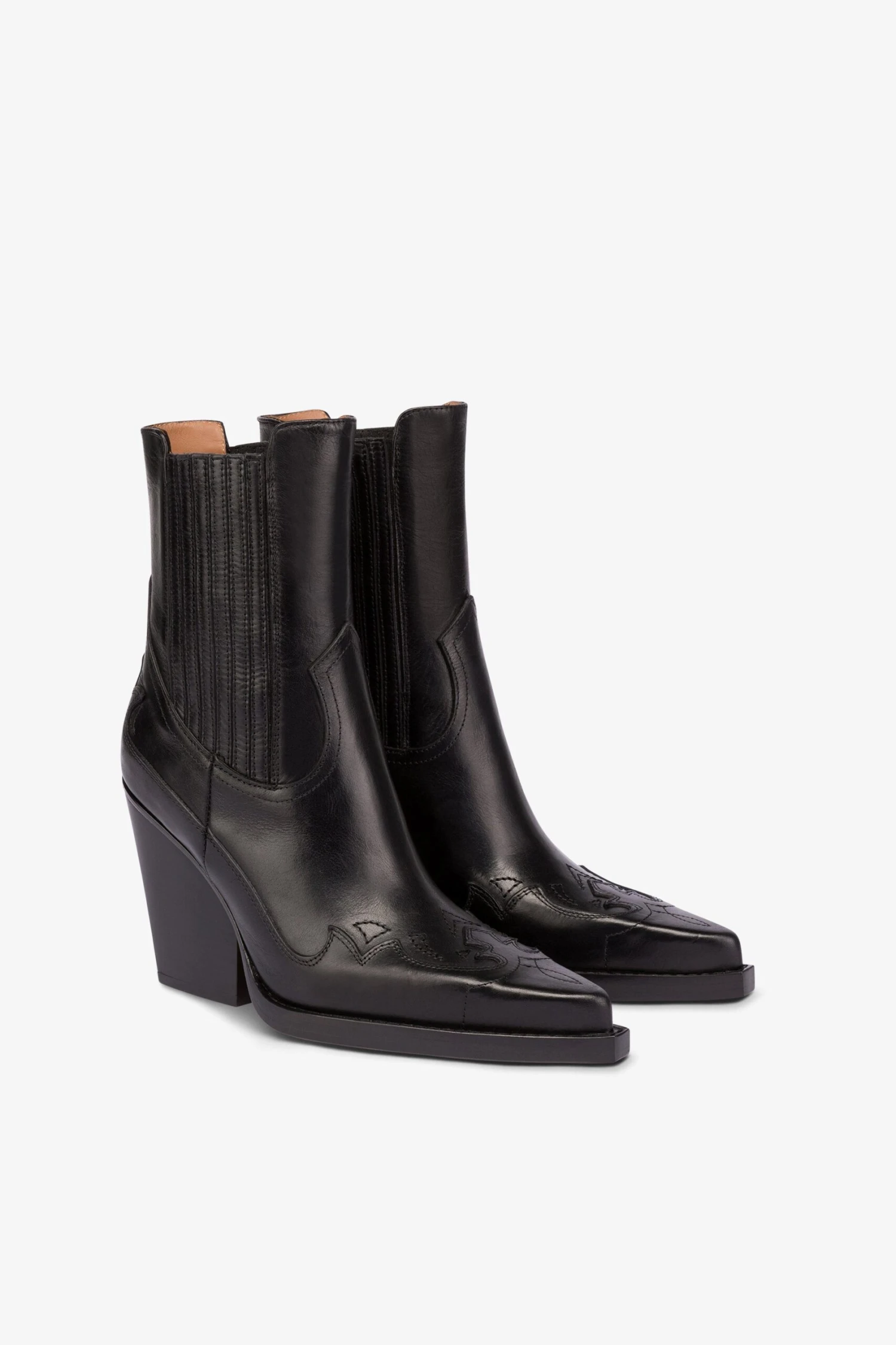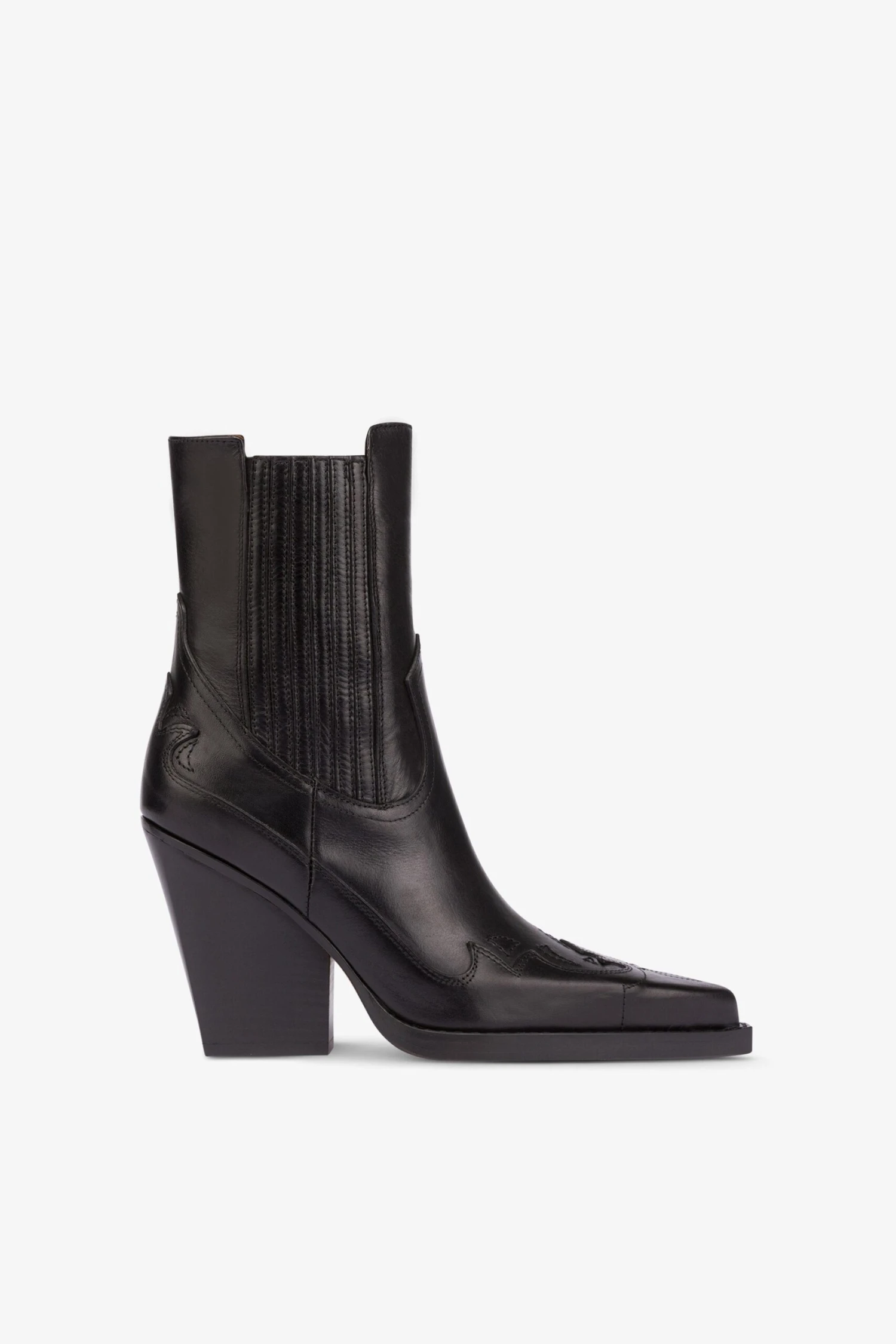 Pointed ankle boots with a square toe set atop a medium walking heel. Available in an embroidered shiny vintage black version with side inserts. Made in Italy from soft leather.