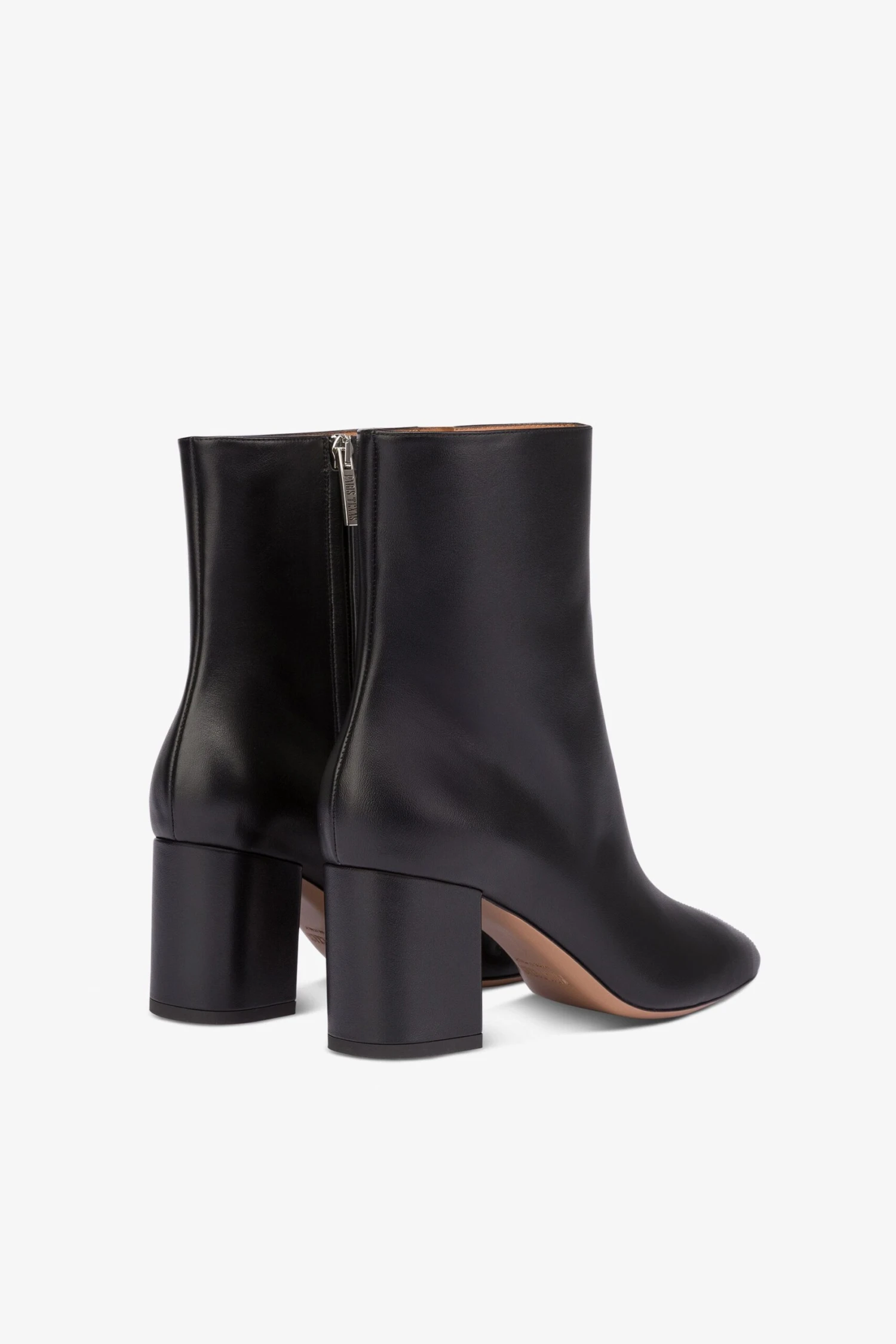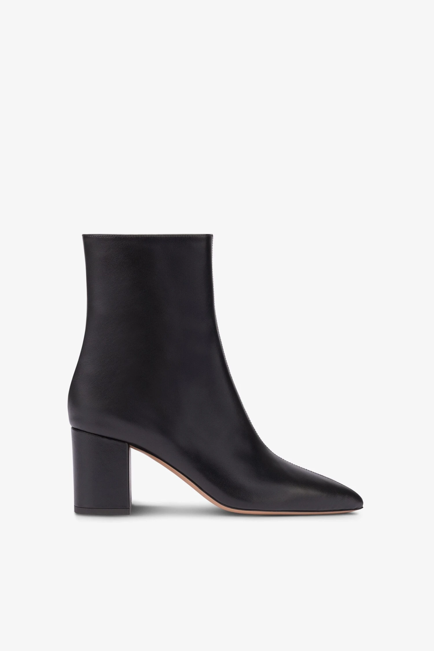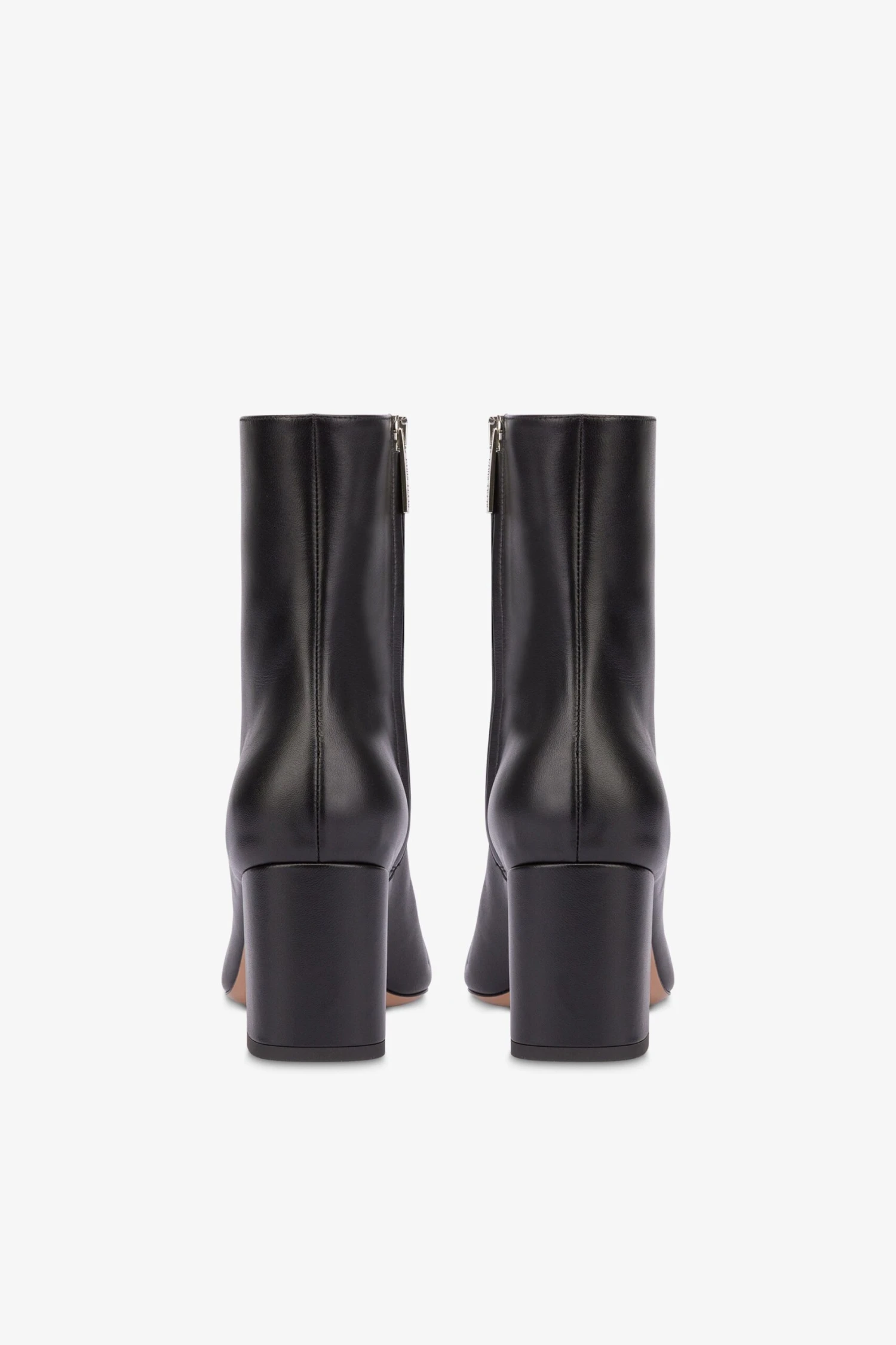 Ankle boots with a long, pointed heel set atop a medium block heel. Available in a smooth black version. Made in Italy from soft leather.