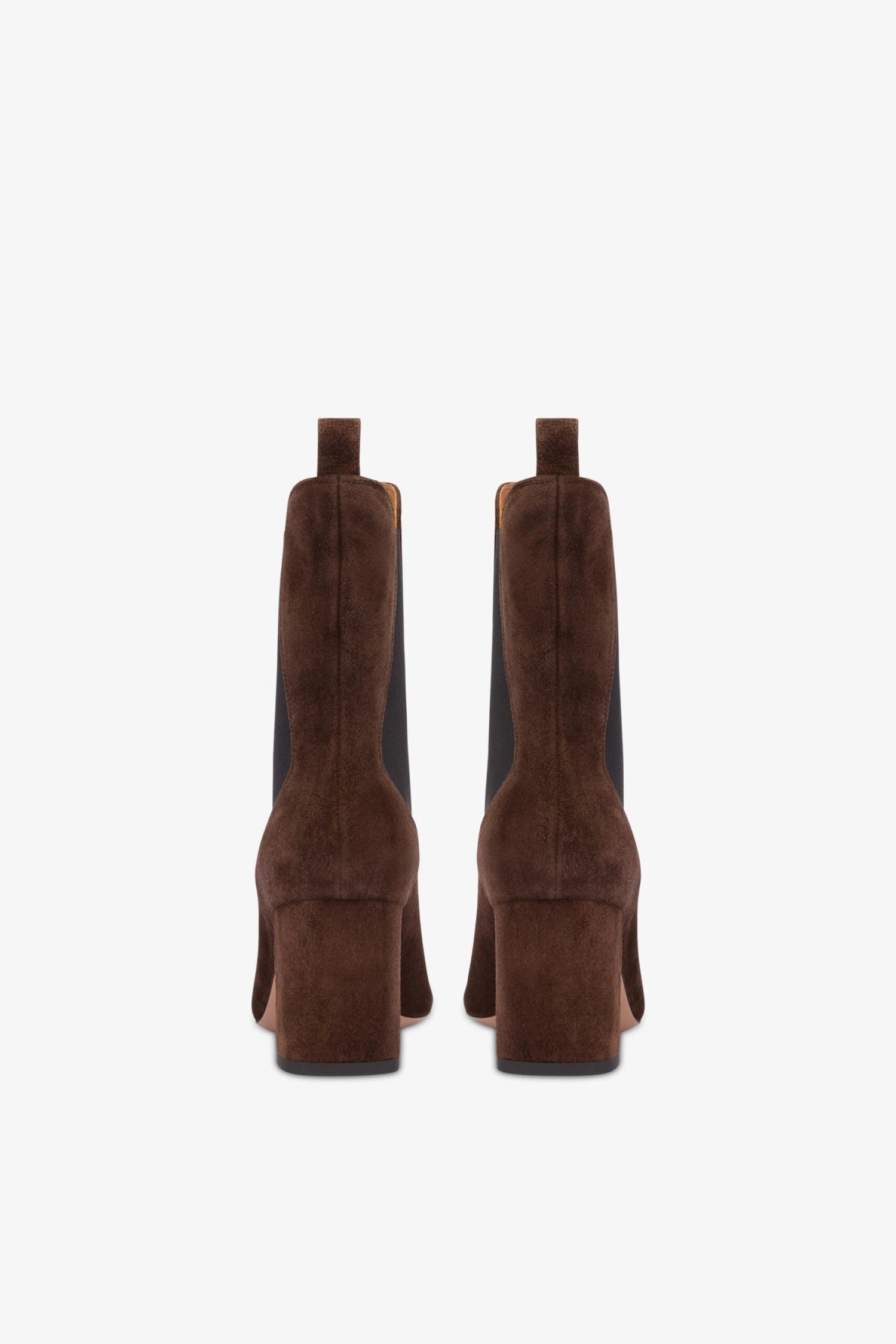 Ankle boots with a pointed toe set atop a medium covered square heel featuring pull tabs and elasticated inserts. Available in a pepper-colored suede version. Made in Italy from soft leather.
