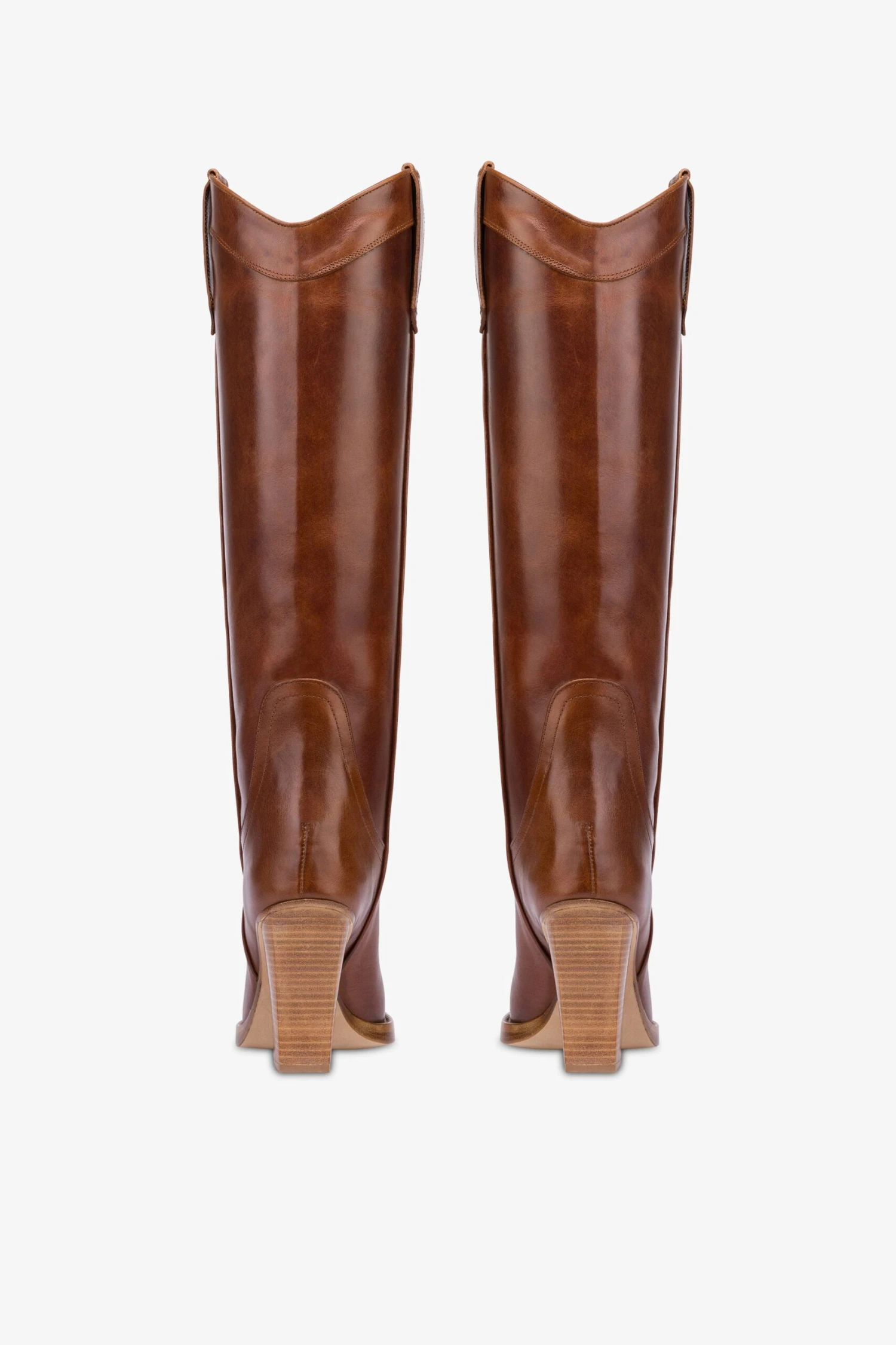 Knee-high boots with a flat-ended, pointed toe set atop a high walking heel. Available in a shiny vintage leather version with textured pull straps and a scalloped collar. Made in Italy from soft leather.