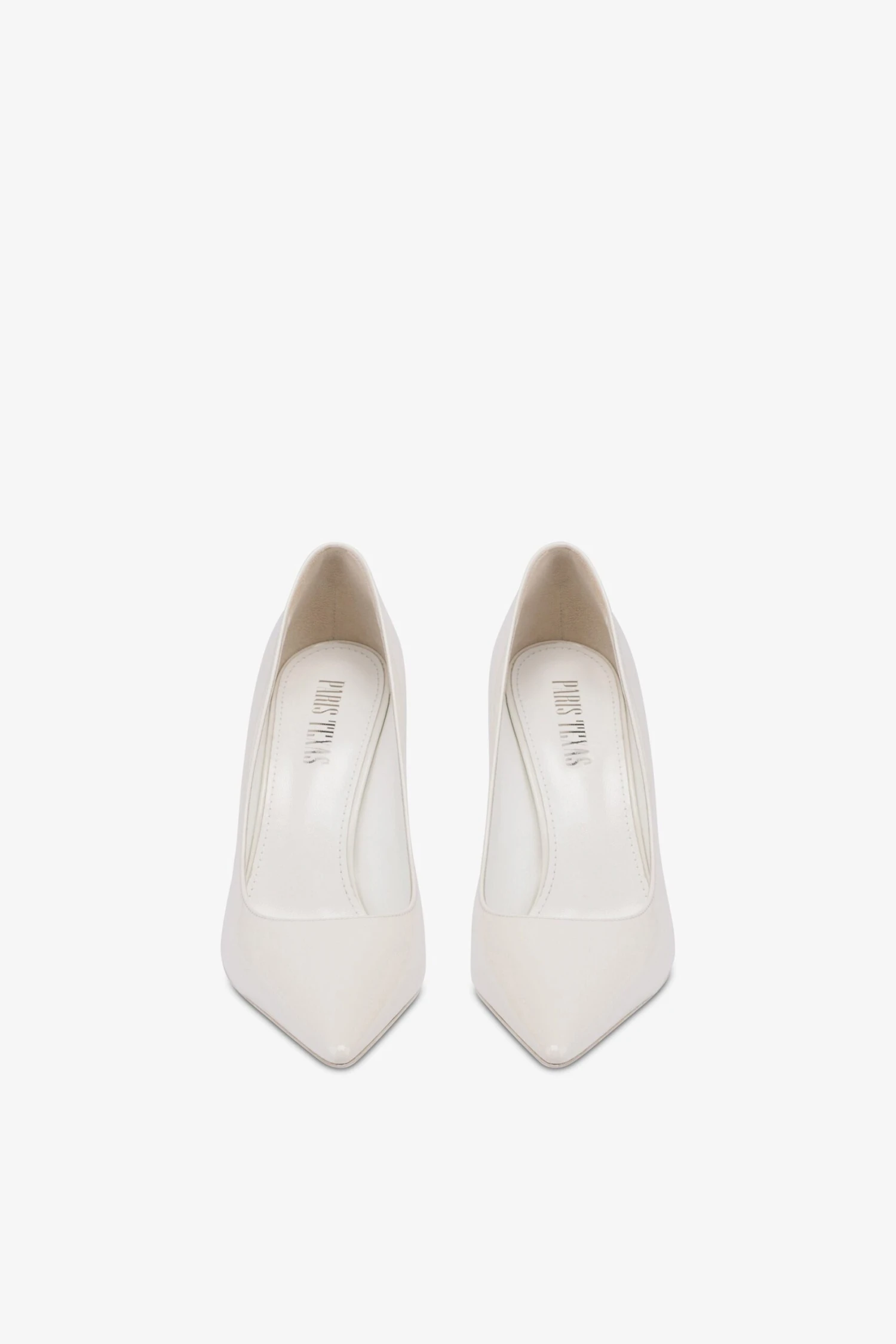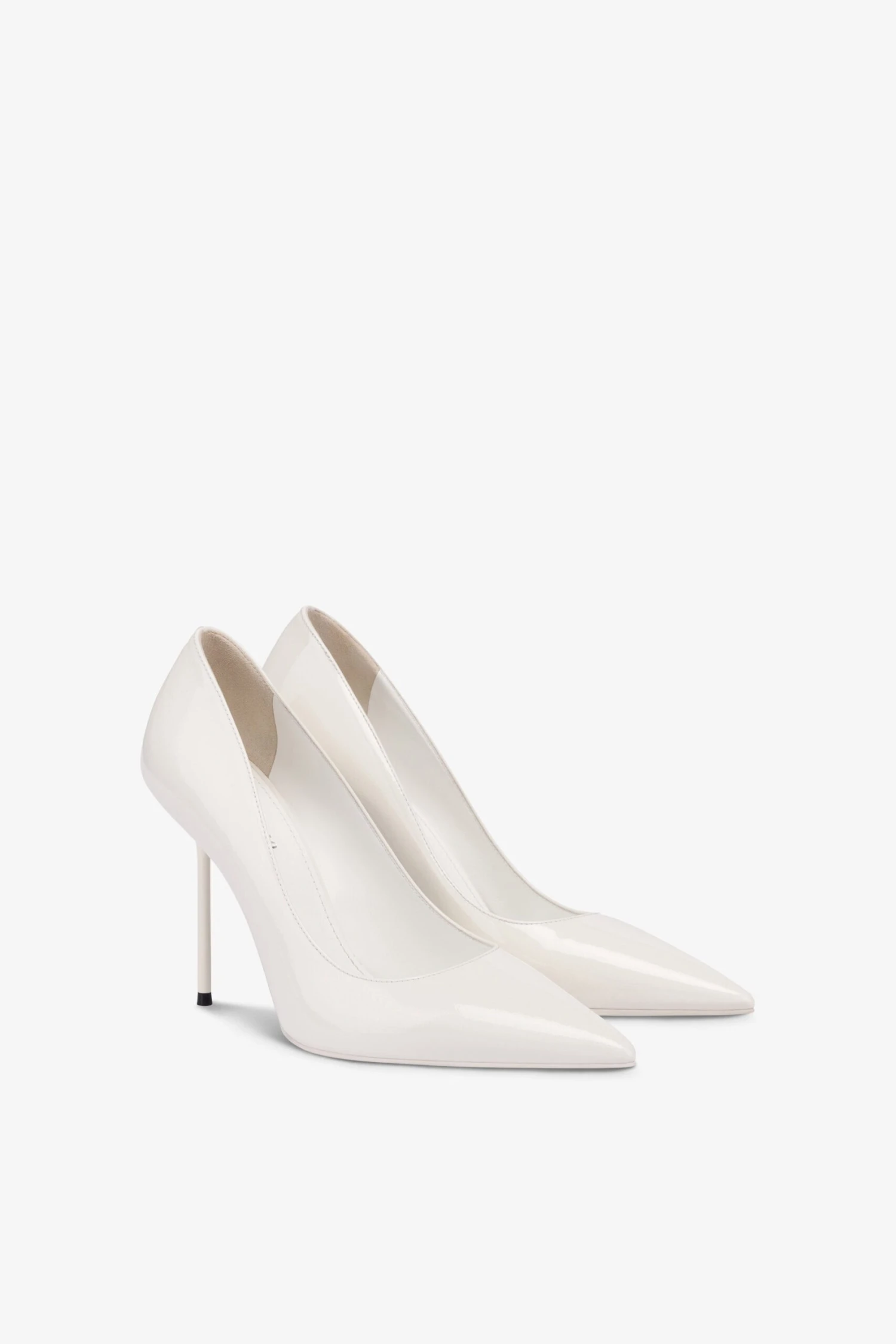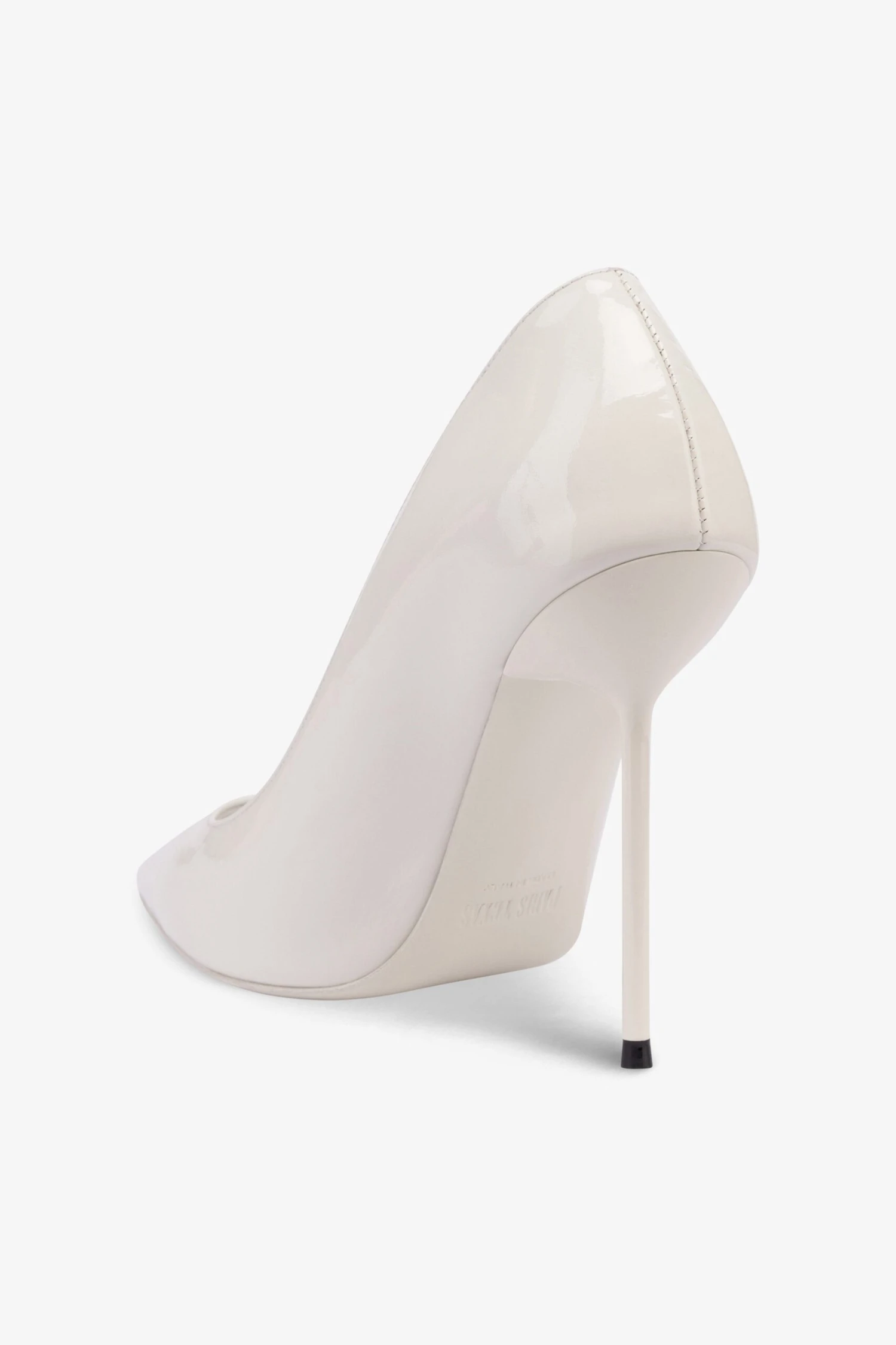 Pointed-toe pumps with a covered pin heel in white patent leather. Made in Italy.