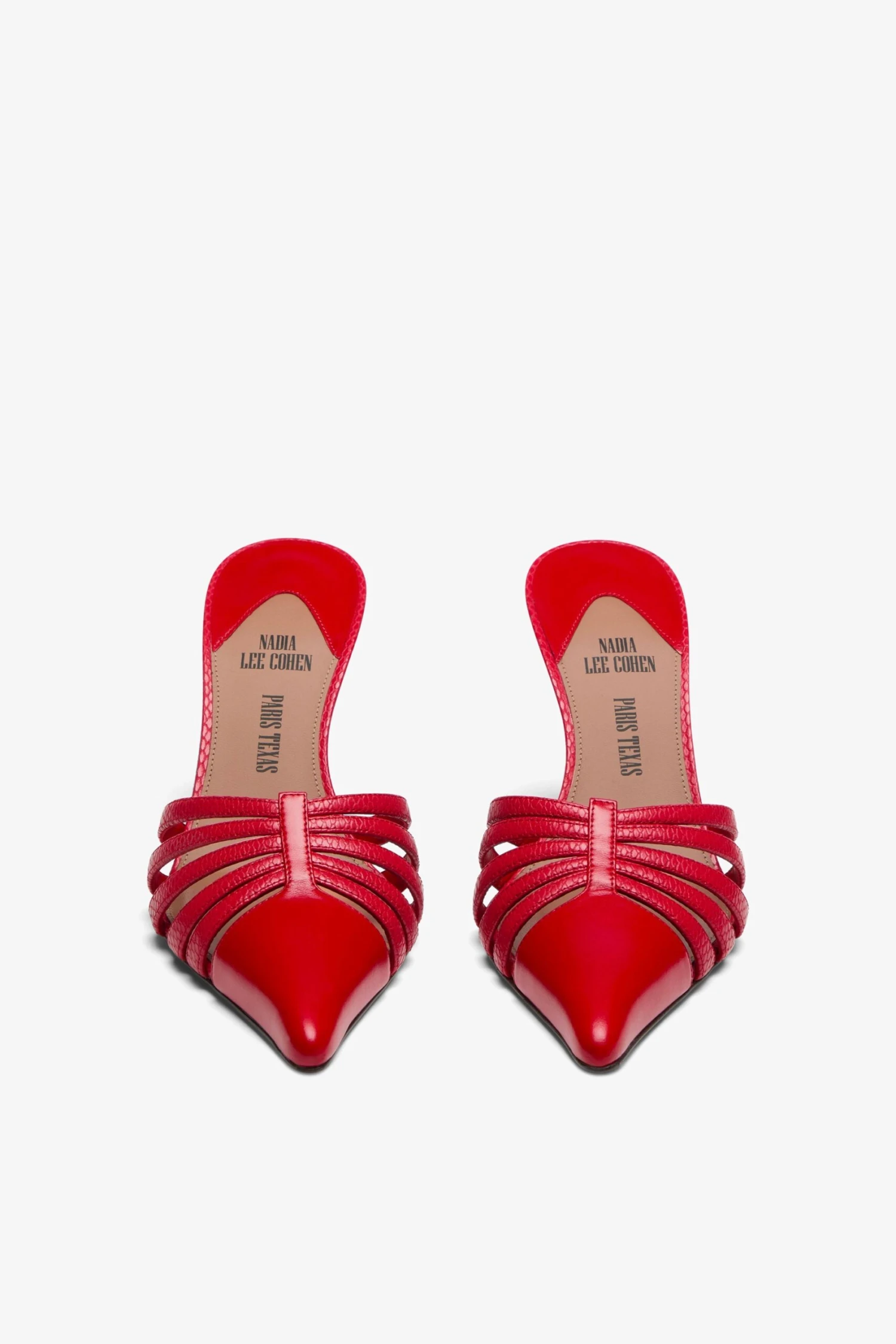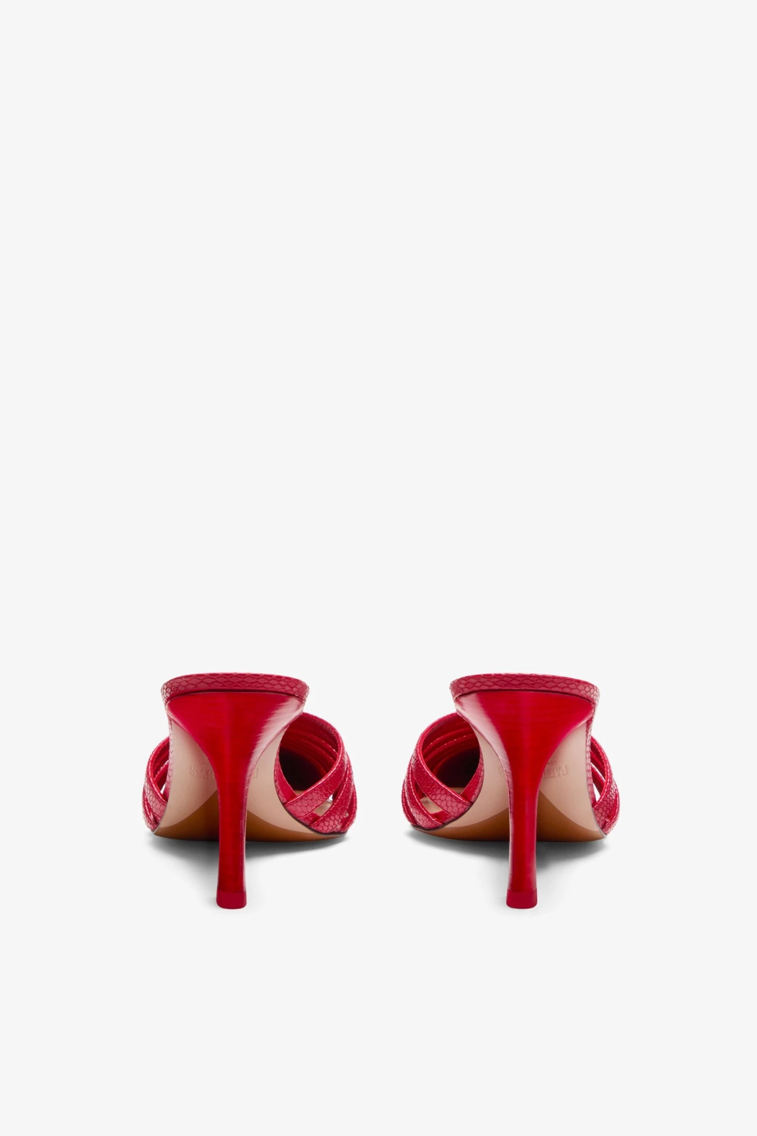 The Nadia mule in red mini python-embossed leather adds a dash of liveliness to summer elegance. Featuring a cutout upper, pointed toe and flared heel.